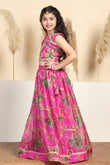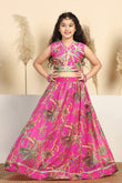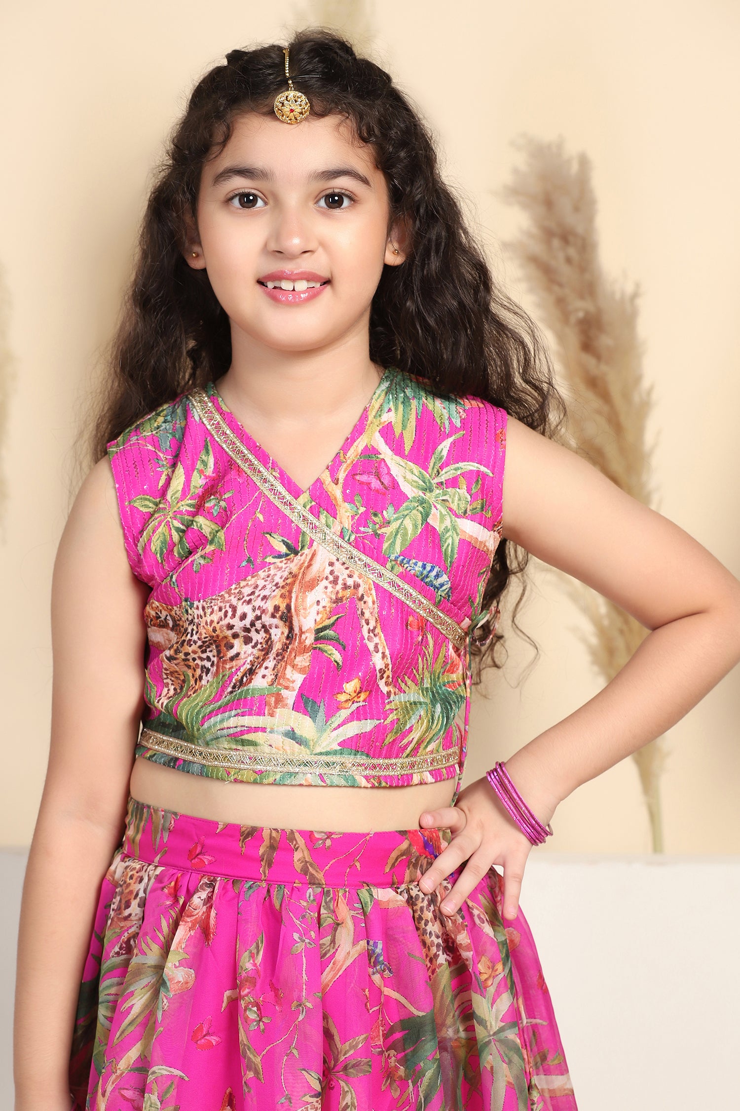 Shop from a wide range of beautifully crafted Lehenga Choli from Fashion Dream. Style the set with earrings and golden heels for a beautiful traditional outfit. Get a charming and elegant option for festive moments with this pink color lehenga choli. This printed lehenga choli is made from crepe silk with butter crepe linning for comfort. The choli for girls has a V-neck, sleevless bodies, lace detailing at the front of the choli and also has a back drawstring closure for fitting. This Animal printed lehenga is half elasticated waist bend. This traditional lehenga choli for kids is ideal for special occasions including weddings, sangeet, garba parties and cocktail parties.