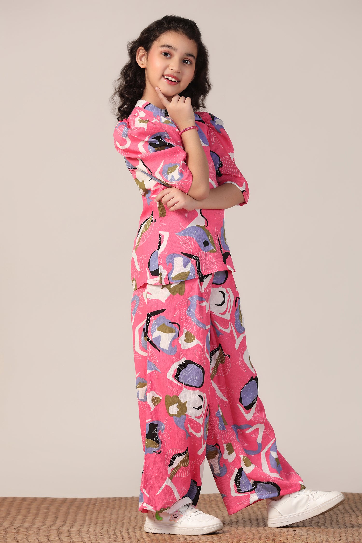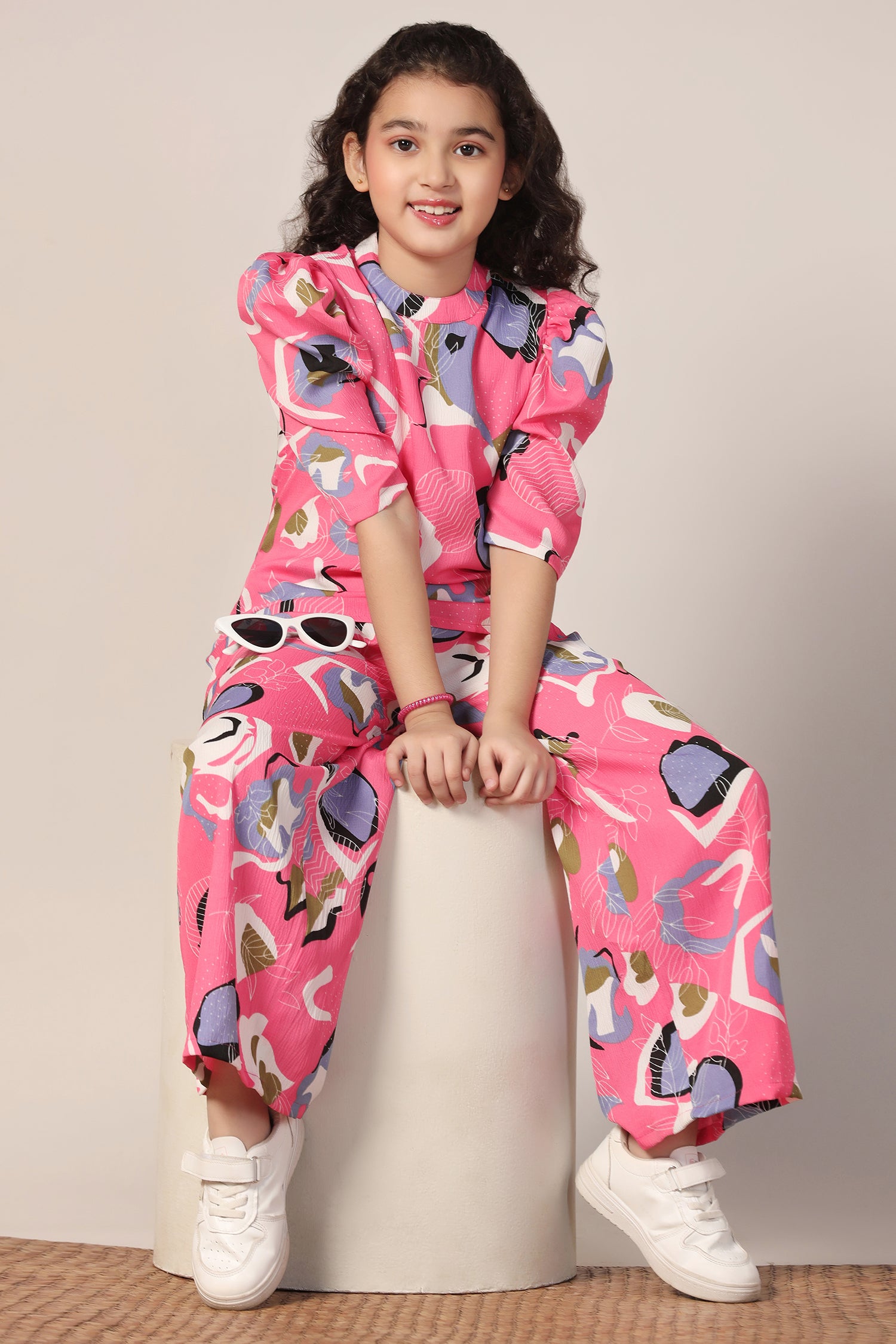 Refresh your wardrobe with this Pink colored co-ord set from Fashion Dream available on Amazon. This classy top and pant set completes your look for your outings. Get the perfect blend of elegance and comfort with your Girl's two-piece combo set. This clothing set for girl is made from cotton blend fabric that is light and comfortable to wear. The set features abstract printed top having round neck, half puff sleeves,zip along button closure at back to give it a perfect fit. This western wear is designed with passion keeping style, fashion and comfort in mind. The set comes along with a printed pant bottom having two side pockets and partially elasticated waistband for a comfortable fit. Pair it with matching earrings and sandals to complete the casual yet fashionable look. "Note: The accessories and props used in these photoshoots are for aesthetic purposes only and may not be included in the final product or service."