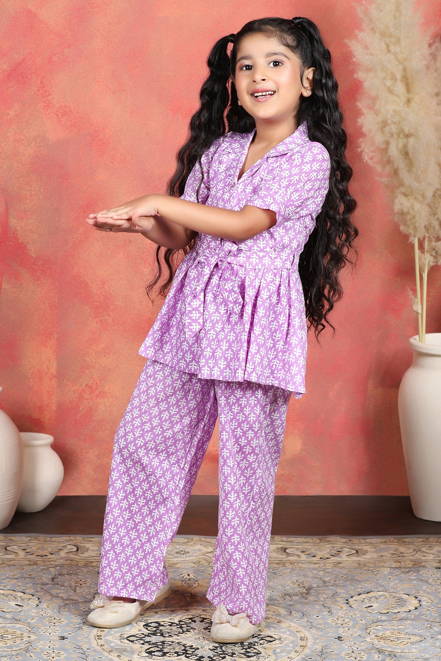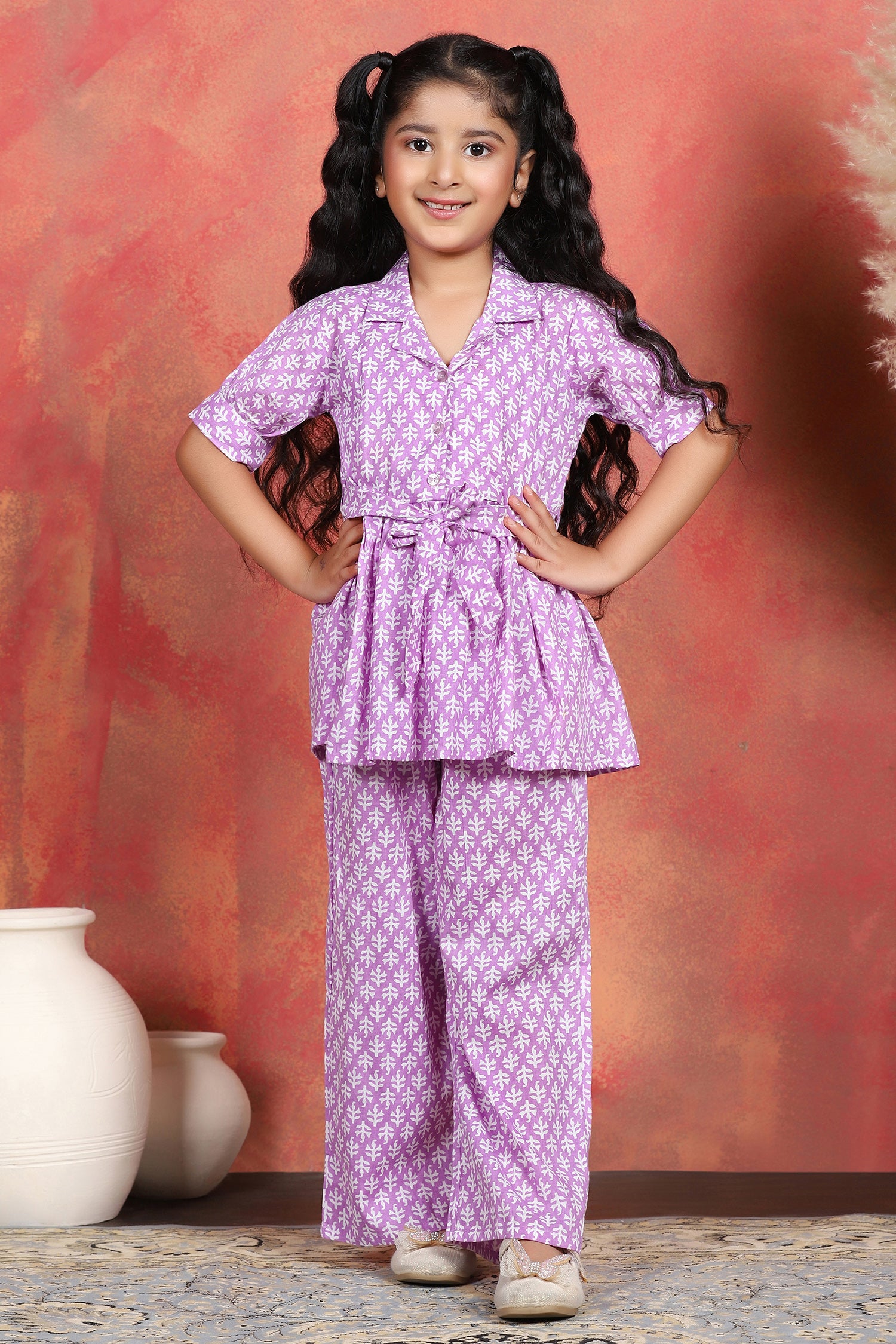 Shop wide range of collection of Top and Palazzo Set for girls from the Fashion Dream on Amazon. Perfect for everyday use, casual outings, school events, or weekend gatherings, offering a blend of comfort and trendy design. The floral printed purple top is tailored from a soft cotton blend fabric, styled with a lapel collar neck, half puff sleeves, and front button closure comes with self fabricated belt, creating a neat and elegant silhouette. The relaxed fit ensures breathability and ease of movement, making it a go-to choose for everyday wear. Paired with it, the coordinating printed palazzo with a fully elasticated waistband, allowing easy wear while maintaining style. For a complete look, this all-over printed set can be styled with casual sneakers, ballerinas, or strappy sandals, along with simple bracelets or a sling bag, making it a perfect addition to your child’s modern wardrobe. palazzo set for girls, girls dress 12-13 years new fashion, dress for girls 12-13 years, top and bottom set for girls, girls dress 7-8 years, girls cord set, girls tops 13-14 years stylish, dress for girls 12-13+ years, girl set clothes, dress for girls, western dress for girls, coord set for girls, kids girls dress, co ord set for girls 13-14 years, indo, kids cord set for girls western dress for girls Note: The accessories and props used in these photoshoots are for aesthetic purposes only and may not be included in the final product or service.