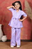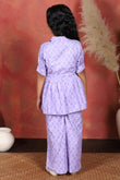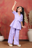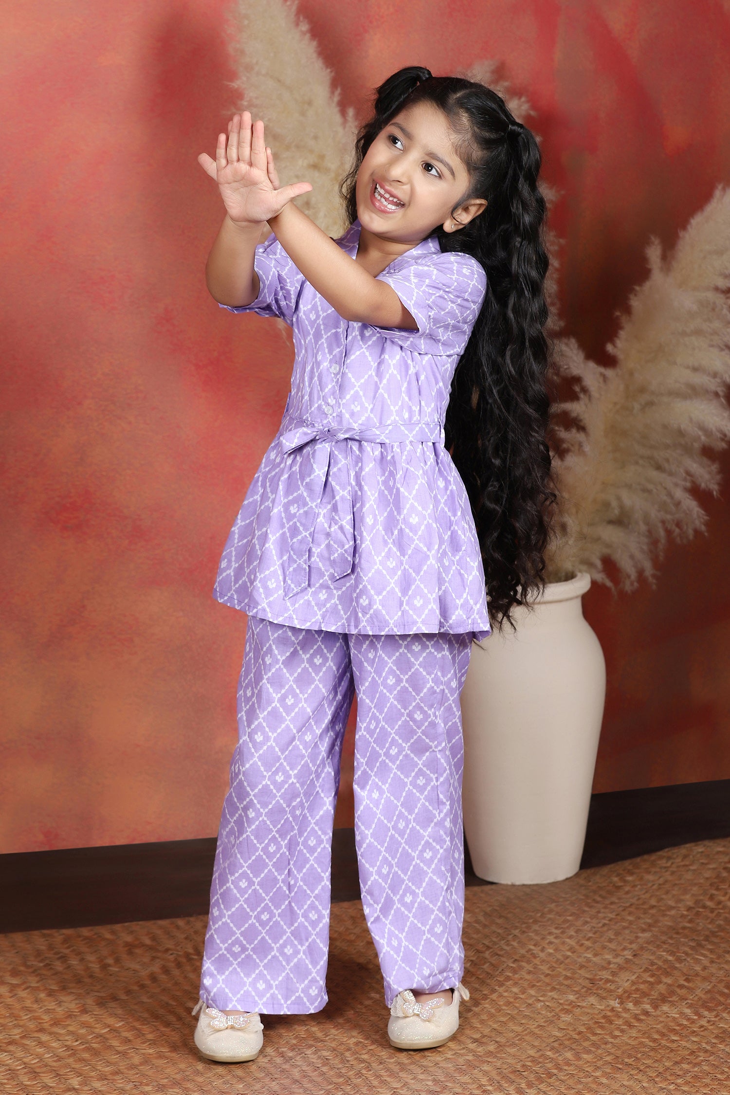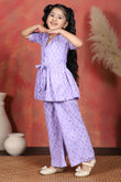 Shop wide range of collection of Top and Palazzo Set for girls from the Fashion Dream. Perfect for everyday use, casual outings, school events, or weekend gatherings, offering a blend of comfort and trendy design. The floral printed purple top is tailored from a soft cotton blend fabric, styled with a lapel collar neck, half puff sleeves, and front button closure comes with self fabricated belt, creating a neat and elegant silhouette. The relaxed fit ensures breathability and ease of movement, making it a go-to choose for everyday wear. Paired with it, the coordinating printed palazzo with a fully elasticated waistband, allowing easy wear while maintaining style. For a complete look, this all-over printed set can be styled with casual sneakers, ballerinas, or strappy sandals, along with simple bracelets or a sling bag, making it a perfect addition to your child’s modern wardrobe. palazzo set for girls, girls dress 12-13 years new fashion, dress for girls 12-13 years, top and bottom set for girls, girls dress 7-8 years, girls cord set, girls tops 13-14 years stylish, dress for girls 12-13+ years, girl set clothes, dress for girls, western dress for girls, coord set for girls, kids girls dress, co ord set for girls 13-14 years, indo, kids cord set for girls western dress for girls Note: The accessories and props used in these photoshoots are for aesthetic purposes only and may not be included in the final product or service.