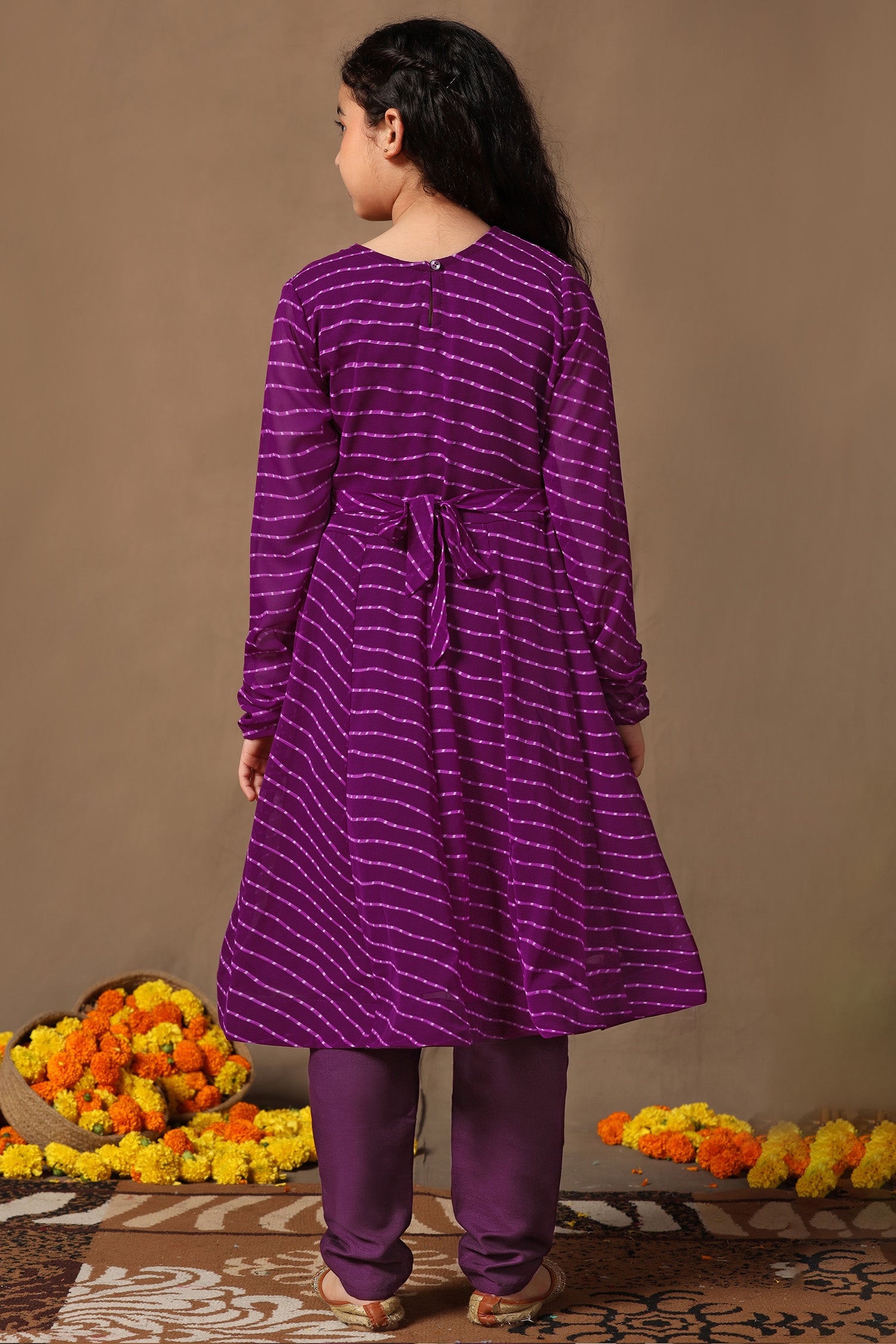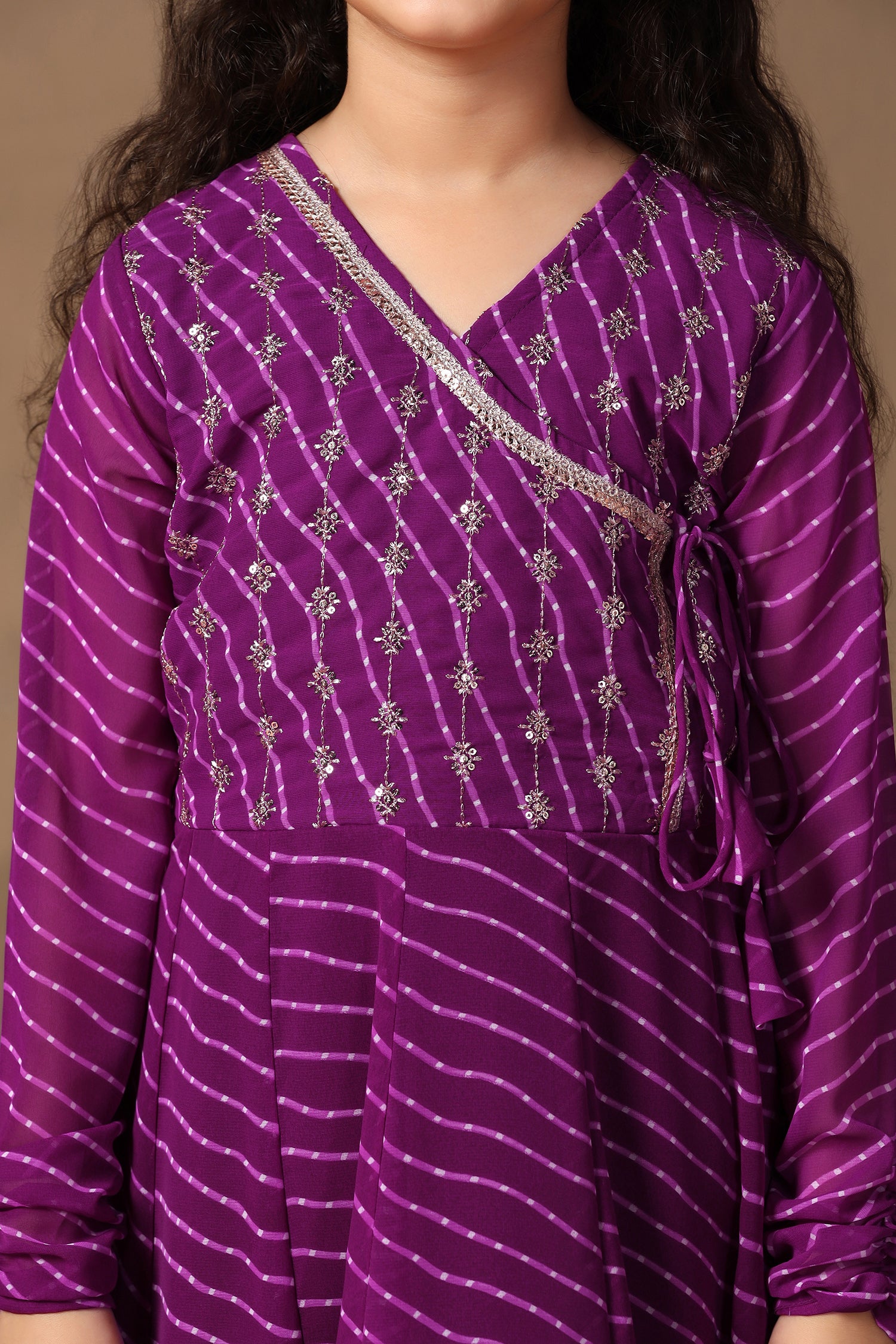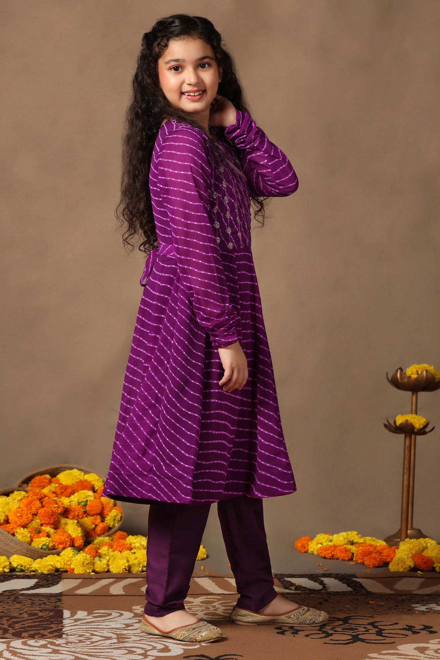 Refresh your darling girl's wardrobe with this Purple color salwar suit set from Fashion Dream. This ethnic set completes your girl’s look for your special occasions. This georgette angarakha kurta set exudes cultural charm and sophistication, perfect for special occasions. Soft fabric and embroidery work add a touch of elegance, while flare silhouette and v-neckline create a statement look, long sleeves provide a classic finish, matching pants complete the look. The design adds a touch of cultural flair and sophistication, making it a perfect choice for festive occasions Pair with subtle jewellery for a beautiful look that's perfect for festivals or family gatherings. "Note: The accessories and props used in these photoshoots are for aesthetic purposes only and may not be included in the final product or service."