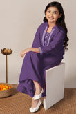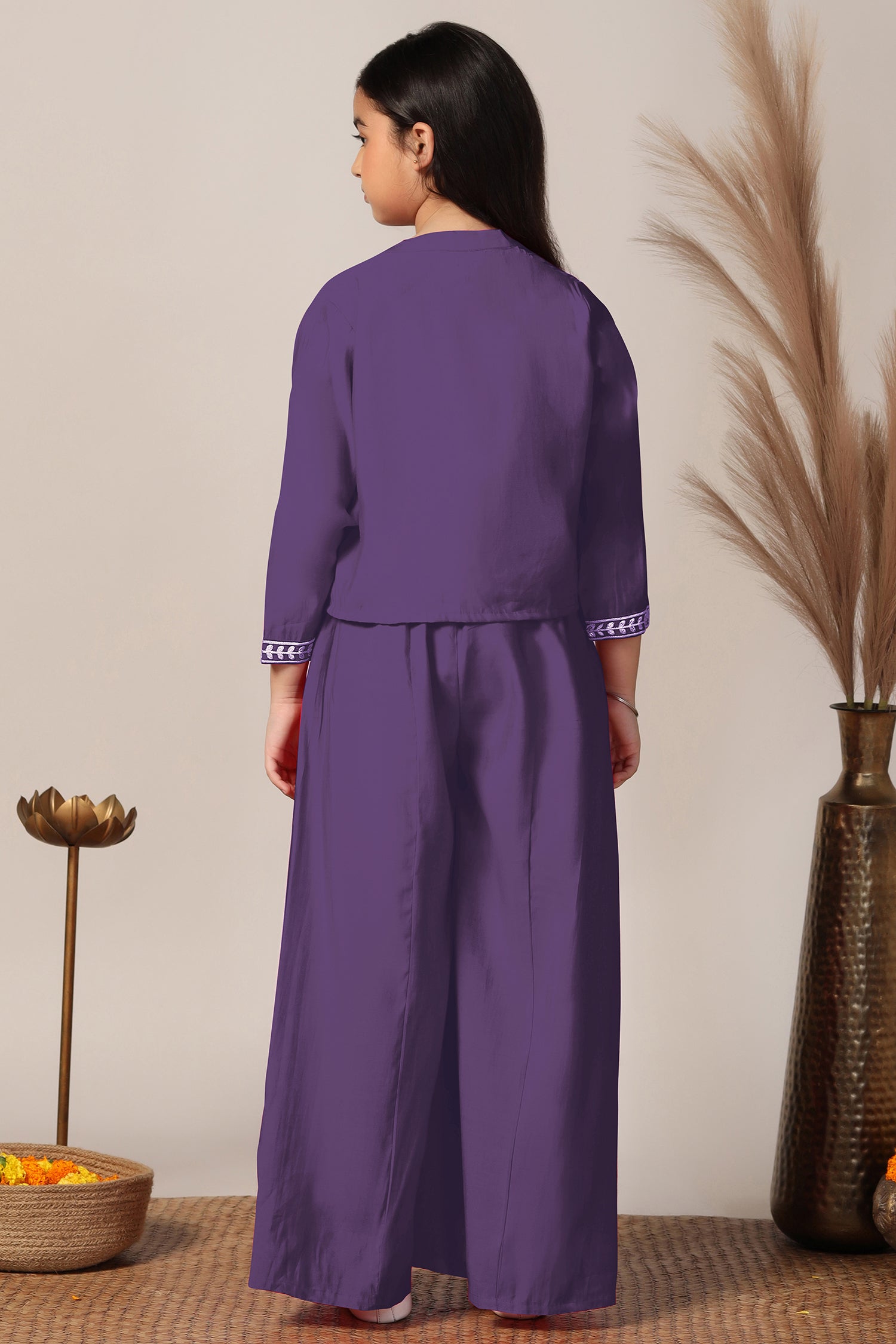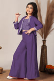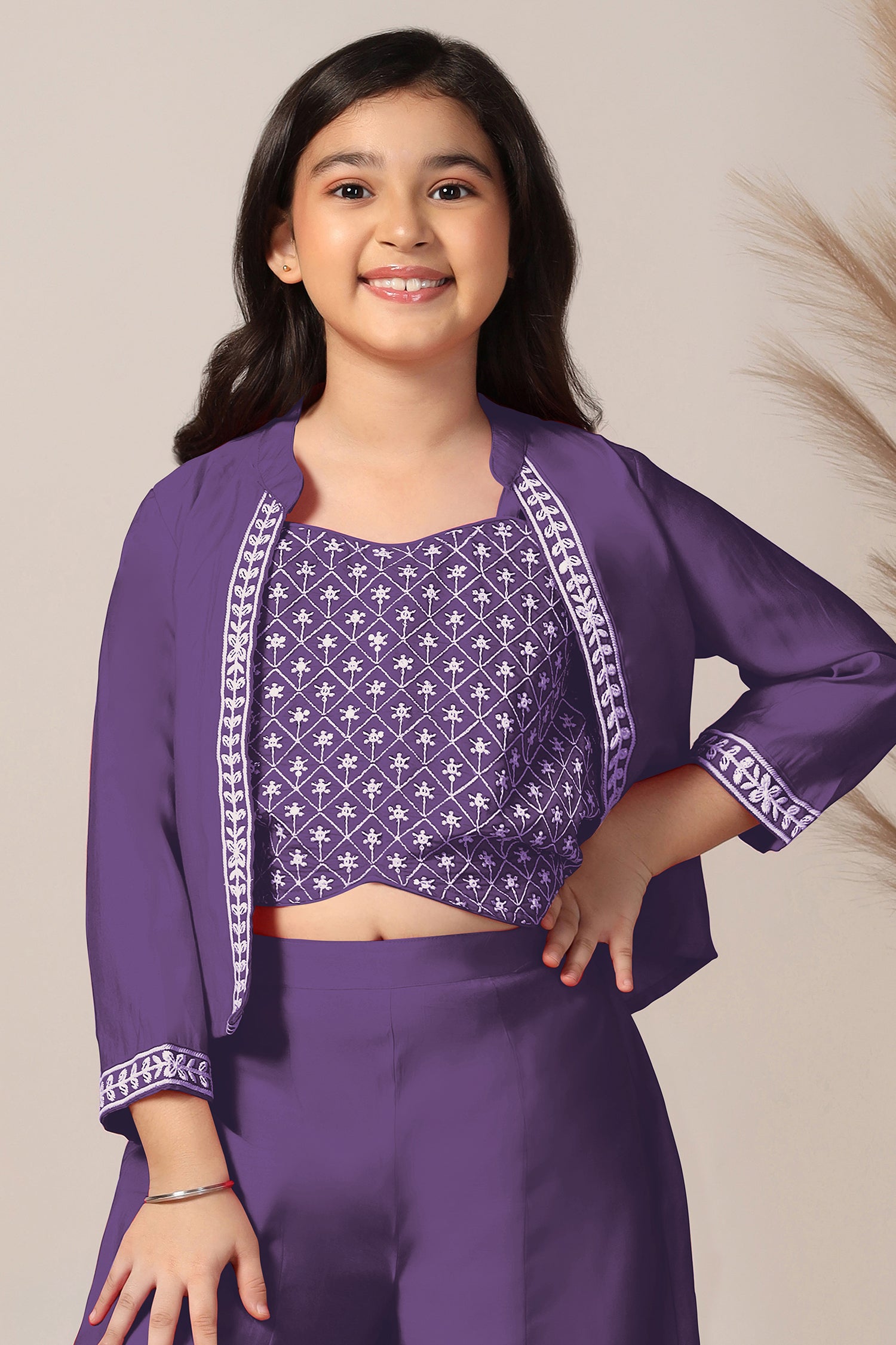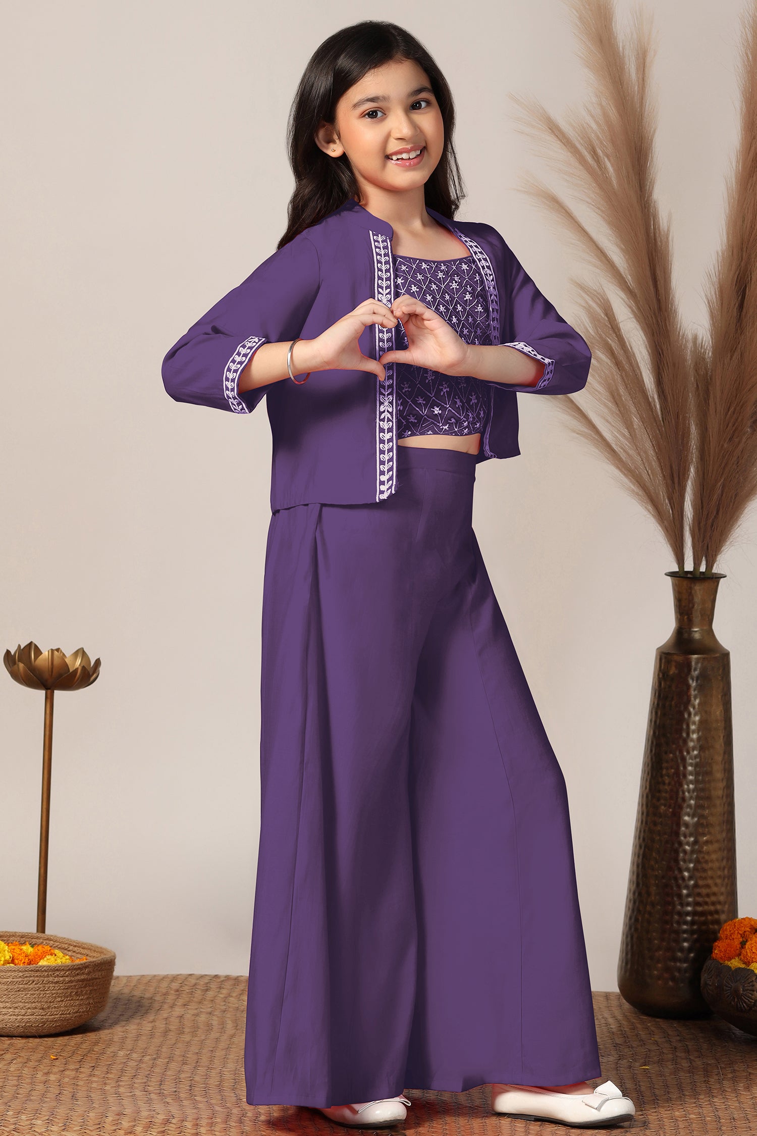 This ethnic set completes your girl’s look for your special occasions. Get your girls ready for the festive season in this beautiful Purple color kurta palazzo and jacket set, crafted from silk blend fabric. This crop top for kids is highlighted sweetheart neck, sleevless bodice and embroidery work on yoke which is must-have for all fashion lovers. Finish her fantastic look with a matching jacket and solid palazzo style bottom which includes relaxed partially elasticated waistband. Get ready your little girl for upcoming festive event by pairing this indo western set with sandals, earrings and cute hair clips."Note: The accessories and props used in these photoshoots are for aesthetic purposes only and may not be included in the final product or service."