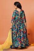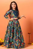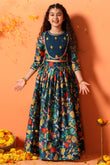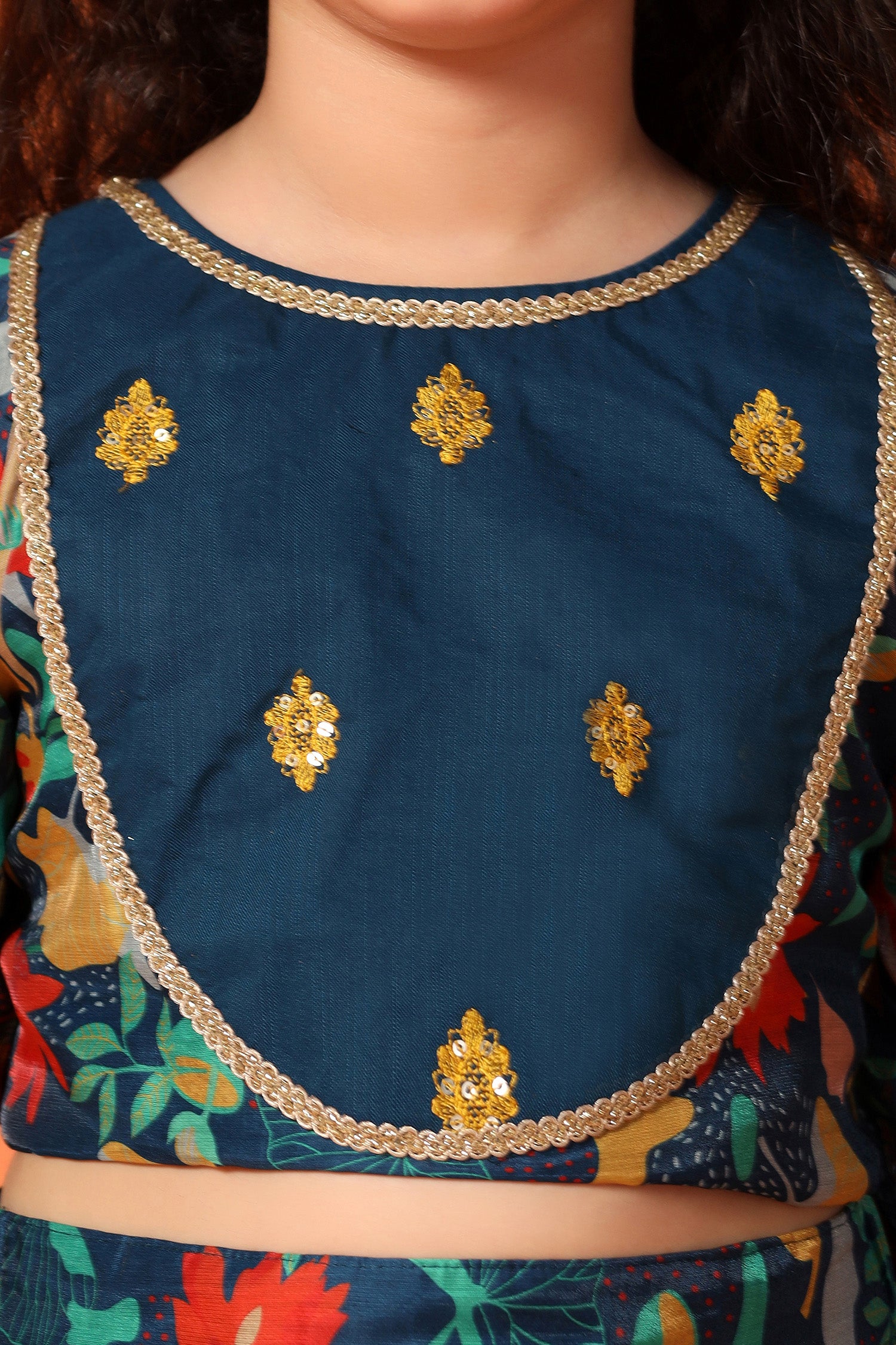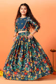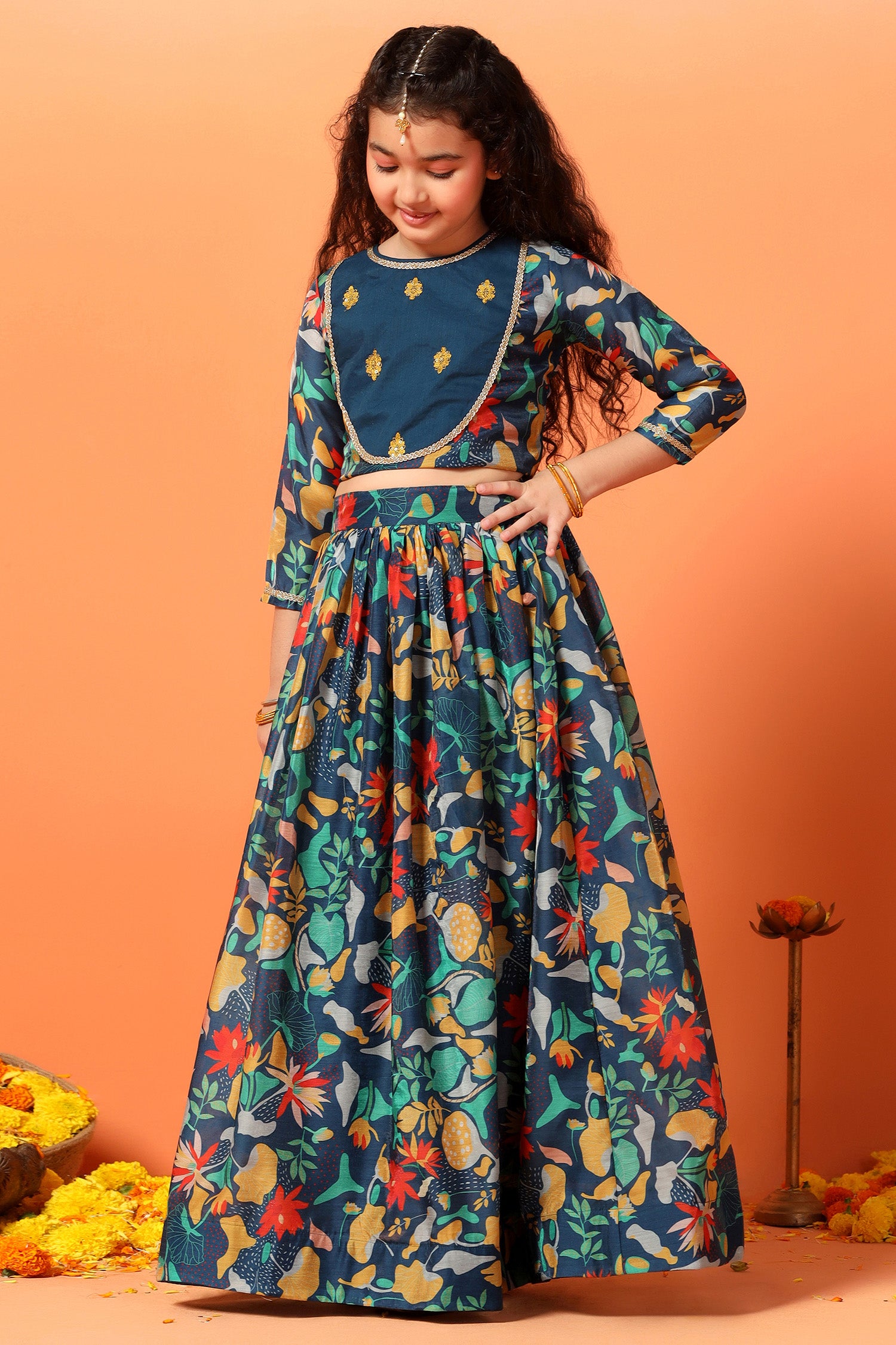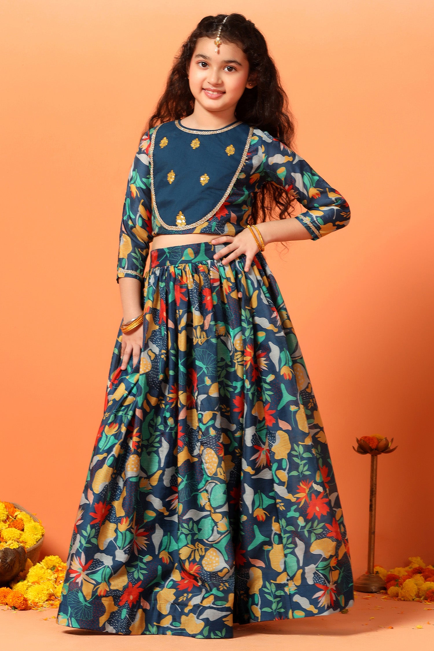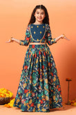 Shop from a wide range of beautifully crafted rama colored lehenga choli for girls from Fashion Dream. Pair this piece with golden juttis or embroidered sandals and matching bangles for a stunning festive look. The 3/4th sleeve choli features a round neck with intricate golden embroidery on the yoke, lace border detailing, and a secure drawstring closure at the back for a comfortable fit. The vibrant floral printed lehenga comes with a partial elasticated waistband, offering graceful flare and ease for dancing or twirling. Completing the outfit, the lightweight yellow dupatta adds a bright and elegant finishing touch.