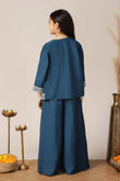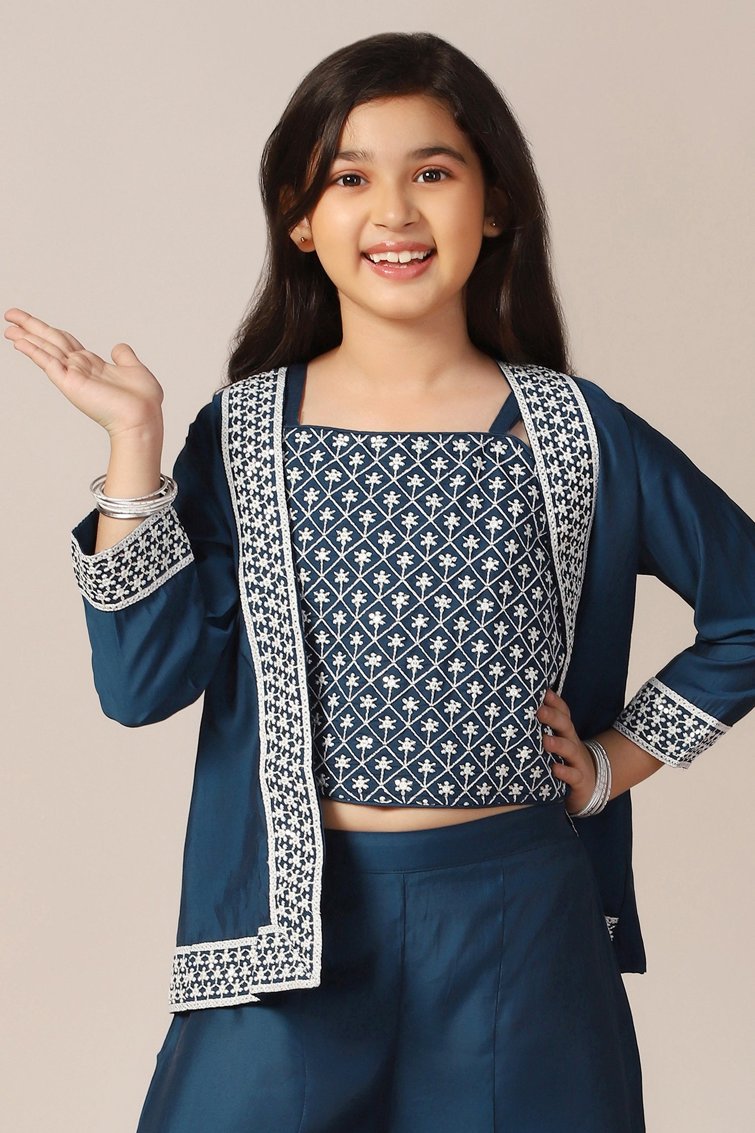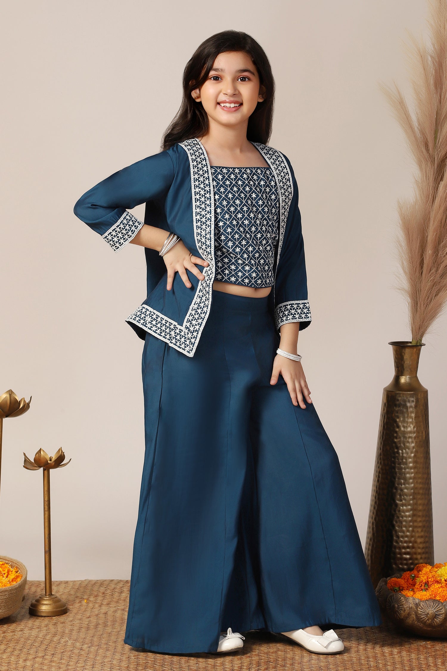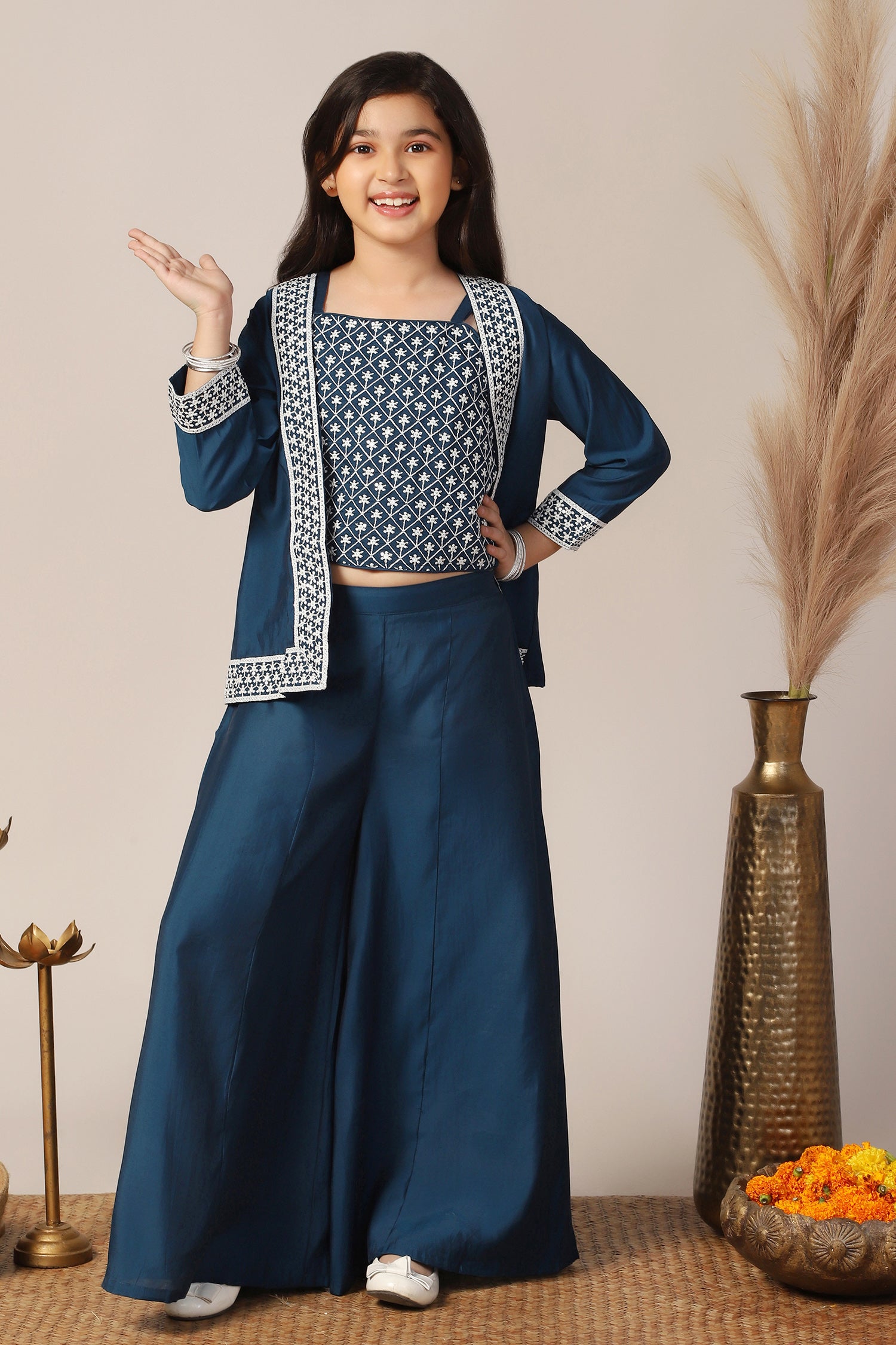 Refresh your darling girl's wardrobe with this blue colored salwar suit set from Fashion Dream. This ethnic set completes your girl’s look for any special occasions. Get your girls ready for the festive season in this beautiful teal color top palazzo and jacket set, crafted from silk blend fabric. This crop top for kids is highlighted square neck, sleeveless bodice and embroidery work on yoke which is must-have for all fashion lovers. Finish her fantastic look with a matching embroidered jacket and solid palazzo style bottom which includes relaxed partially elasticated waistband. Get ready your little girl for upcoming festive event by pairing this indo western set with sandals, earrings and cute hair clips. “Note: The accessories and props used in these photoshoots are for aesthetic purposes only and may not be included in the final product or service."