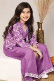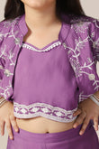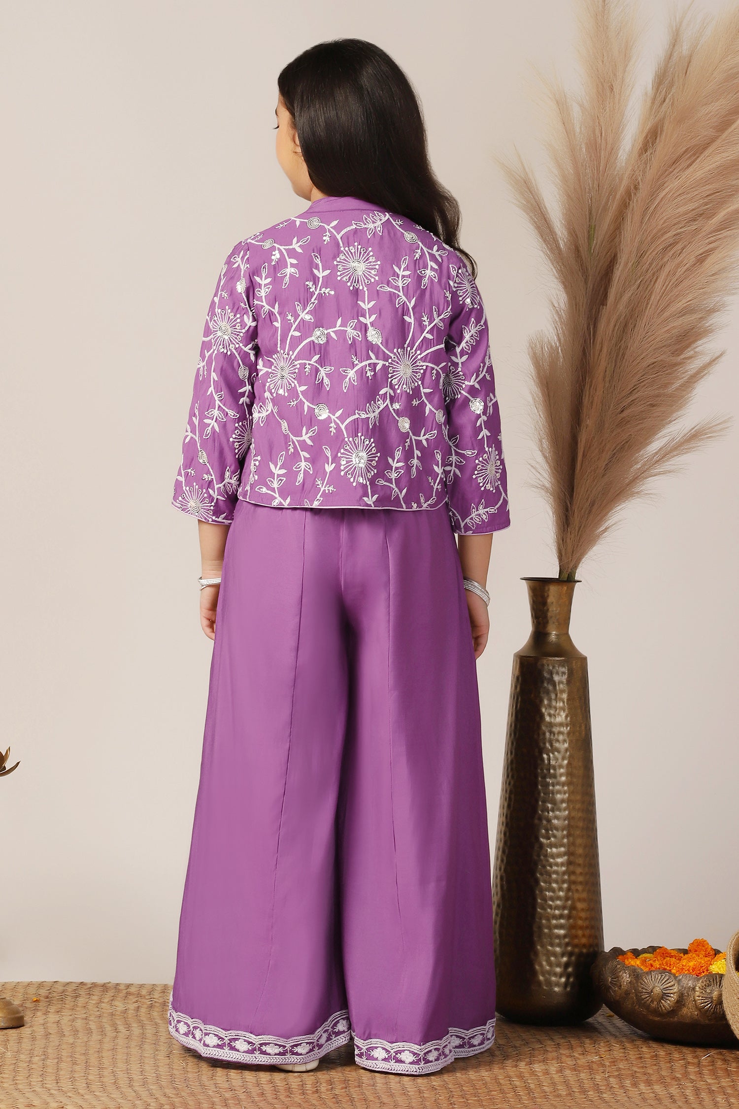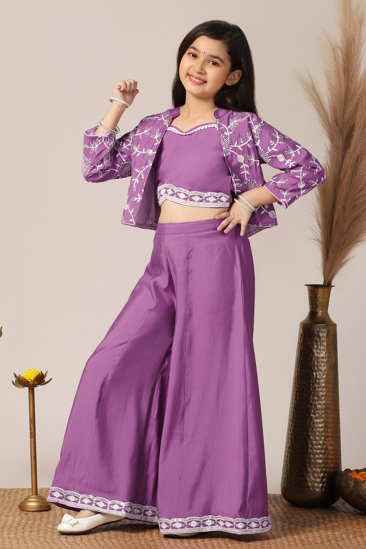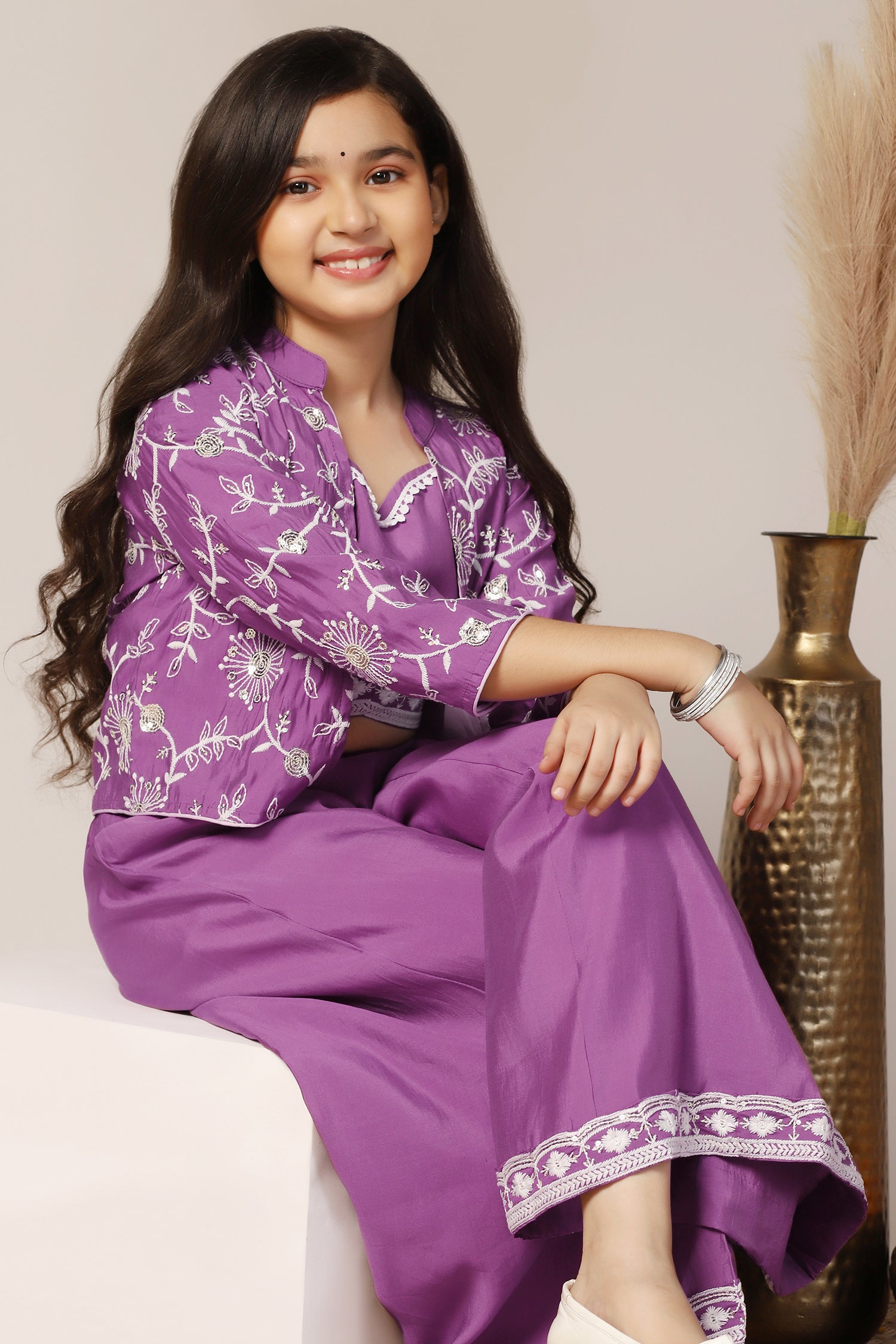 Refresh your darling girl's wardrobe with this Purple colored salwar suit set from Fashion Dream. This ethnic set completes your girl’s look for any special occasions. Get your girls ready for the festive season in this beautiful Purple color top palazzo and jacket set, crafted from silk blend fabric. This crop top for kids is highlighted sweetheart neck, sleeveless bodice and embroidery work on yoke which is must have for all fashion lovers. Finish her fantastic look with a matching embroidered jacket and solid palazzo style bottom which includes relaxed partially elasticated waistband along embroidered work over hemline. Get ready your little girl for upcoming festive event by pairing this indo western set with sandals, earrings and cute hair clips. “Note: The accessories and props used in these photoshoots are for aesthetic purposes only and may not be included in the final product or service."