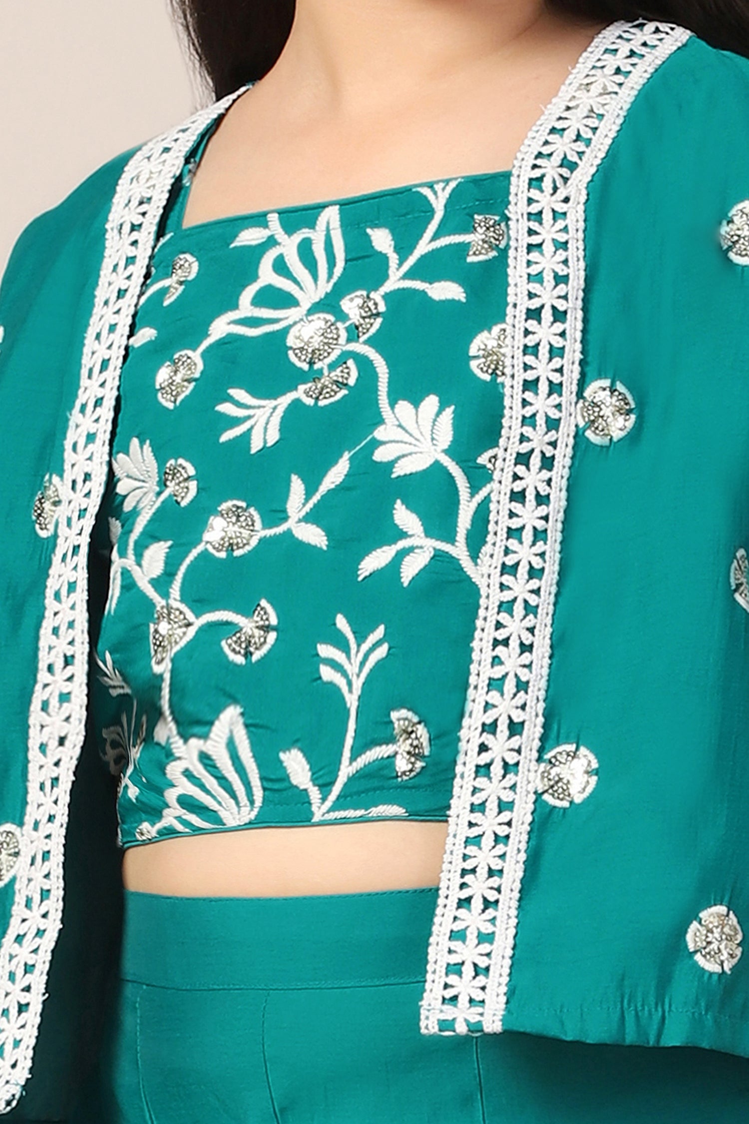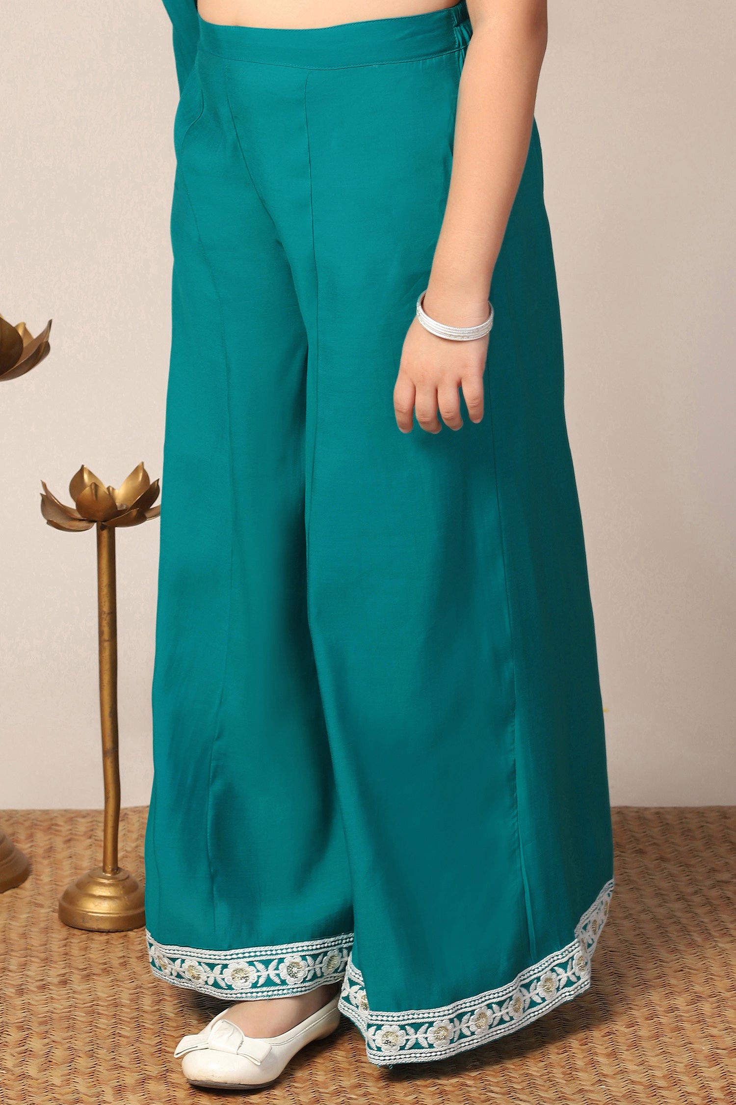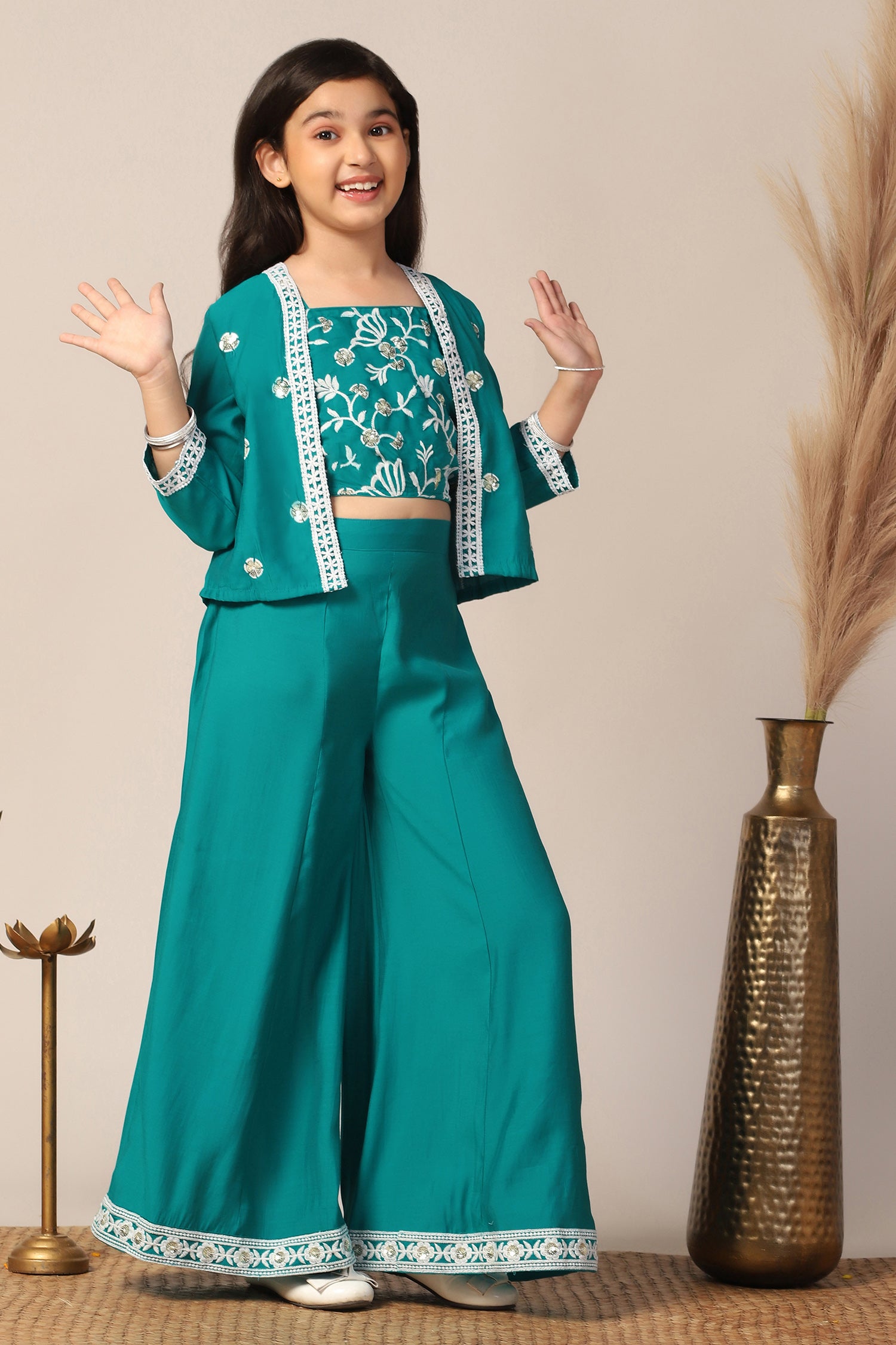 Refresh your darling girl's wardrobe with this teal colored salwar suit set from Fashion Dream. This ethnic set completes your girl’s look for any special occasions. Get your girls ready for the festive season in this beautiful teal color top palazzo and jacket set, crafted from silk blend fabric. This crop top for kids is highlighted square neck, sleeveless bodice and embroidery work on yoke which is must-have for all fashion lovers. Finish her fantastic look with a matching embroidered jacket and solid palazzo style bottom which includes relaxed partially elasticated waistband along embroidered work over hemline. Get ready your little girl for upcoming festive event by pairing this indo western set with sandals, earrings and cute hair clips. “Note: The accessories and props used in these photoshoots are for aesthetic purposes only and may not be included in the final product or service."