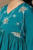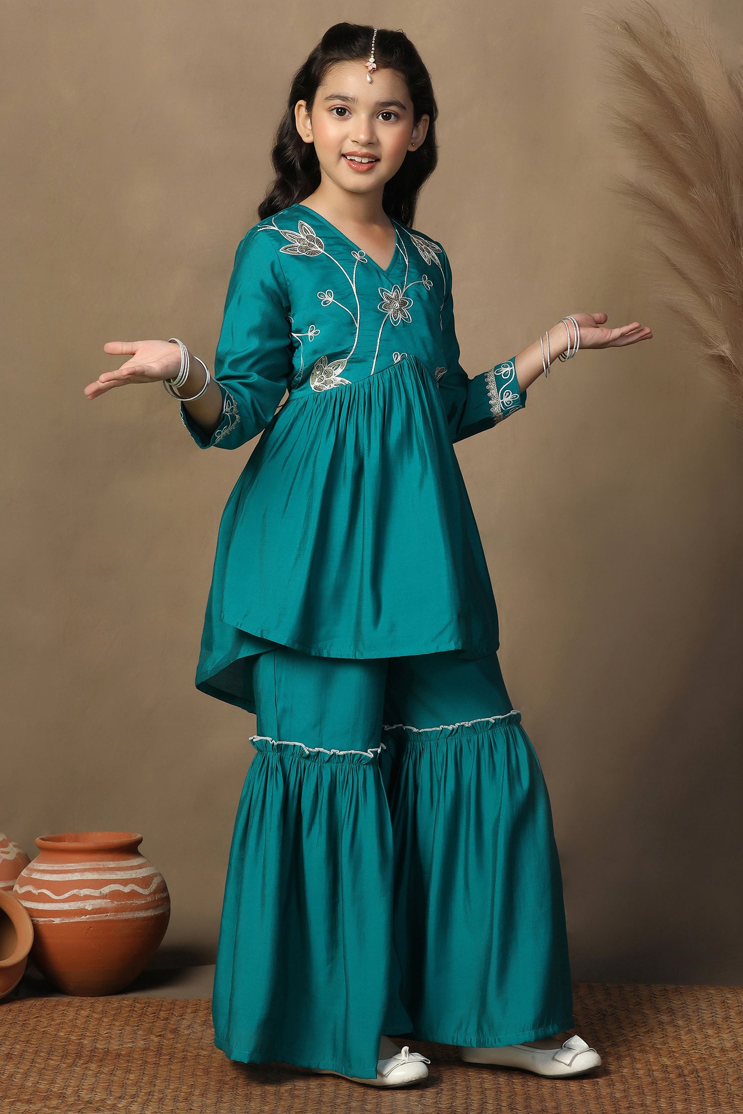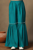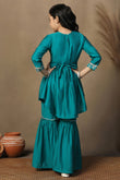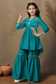 Girls Turquoise Chanderi Silk Ethnic Embroidered Peplum Style Kurta With Sharara Set
