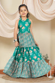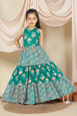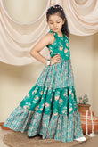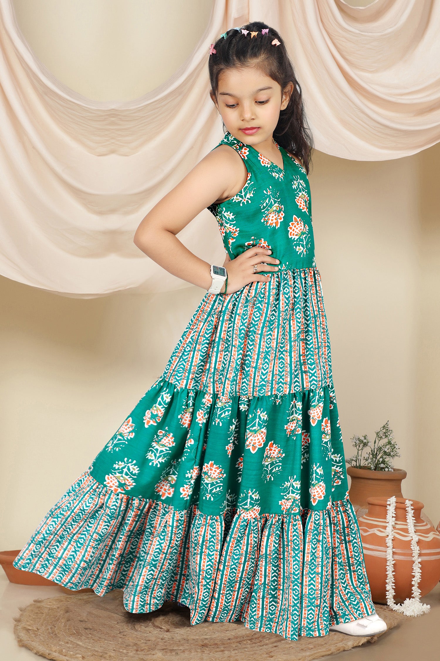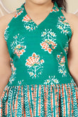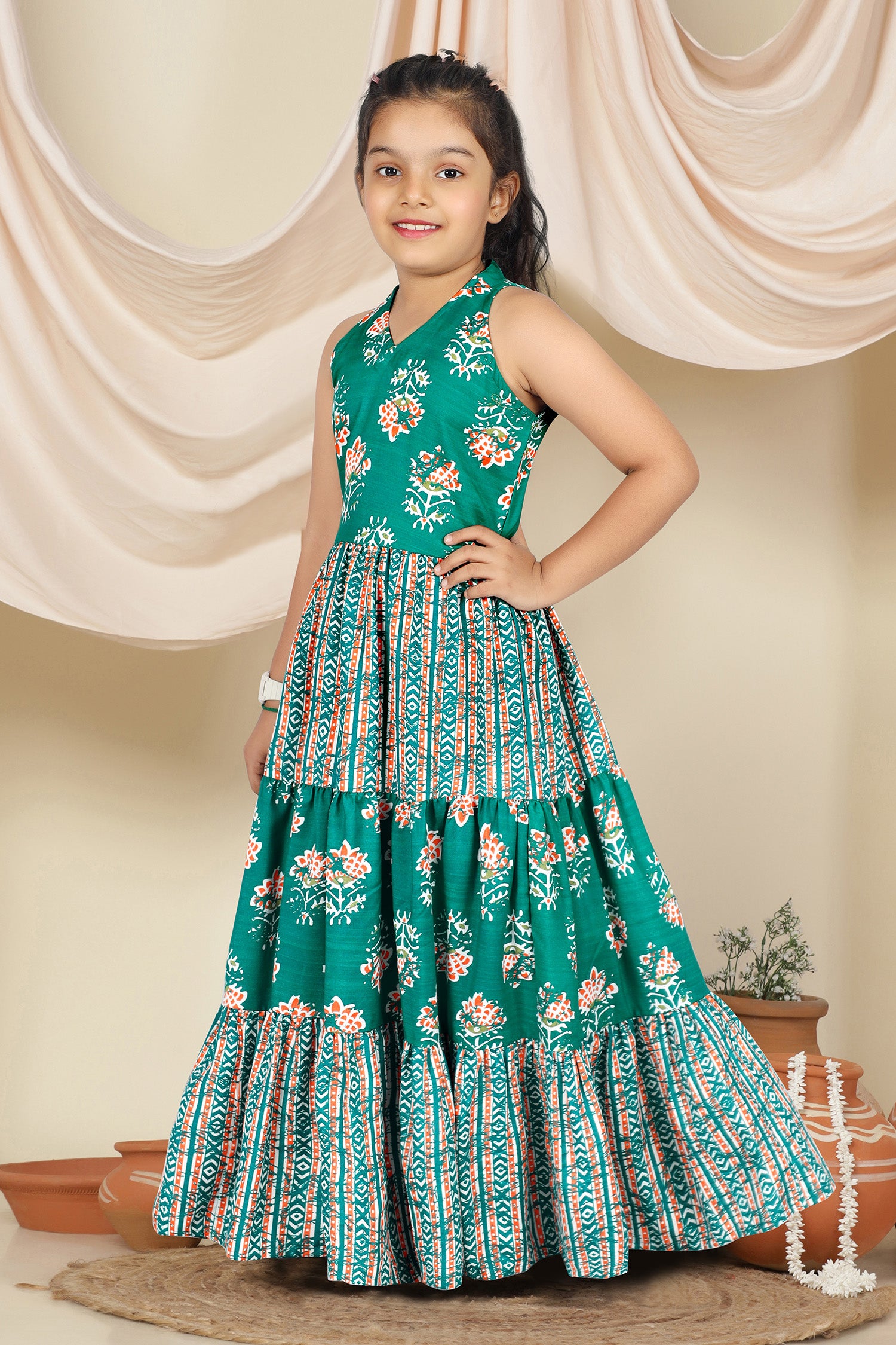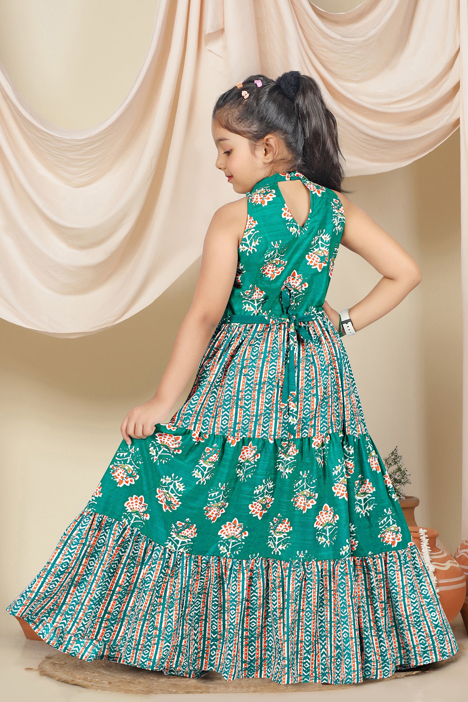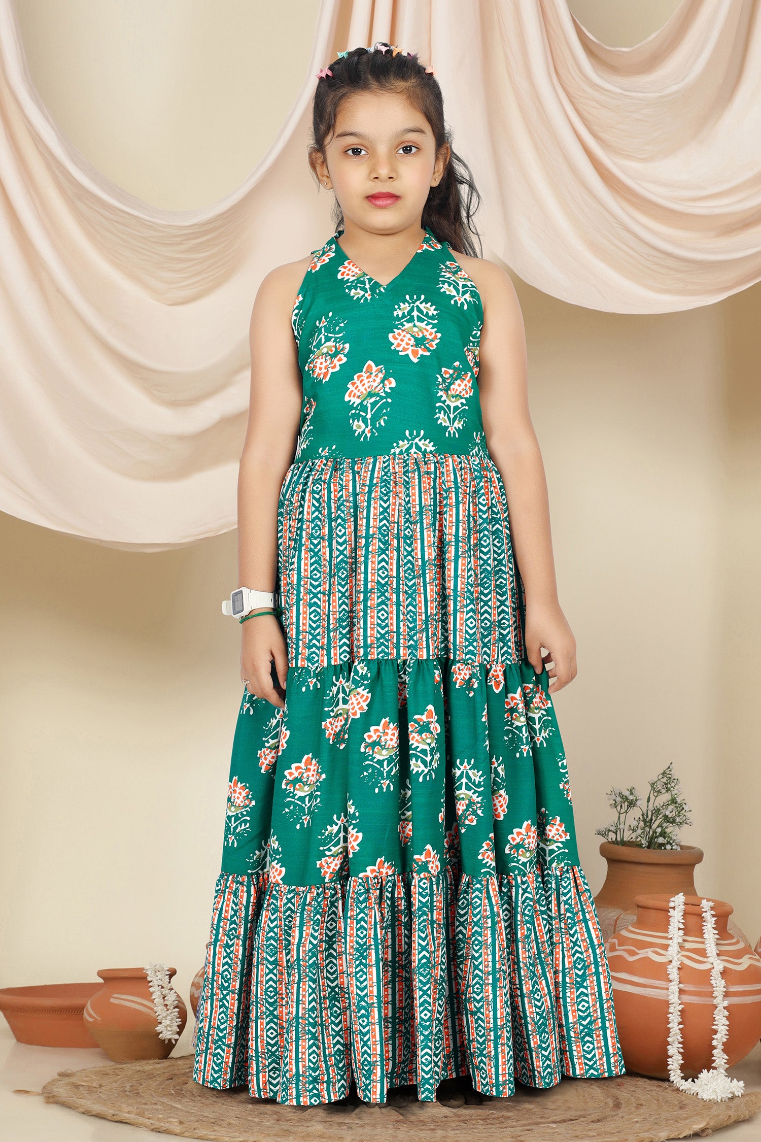 Dress your little girls with this Turquoise colored maxi length kids dress from Fashion Dream. Pair it up with a cute hair accessory and closed shoes for her to shine at the best friend’s birthday party. Add a touch of elegance and charm to your girl's wardrobe with this stunning floral printed maxi dress. Crafted in cotton blend fabric this dress features halter neck, sleeveless bodice, and all over print. This fit and flare style dress comes along self fabricated belt and back button closure makes it ideal for both party wear and festive wear. Style this dress with her favourite flats or heels and use light jewellery to make her look more beautiful.