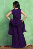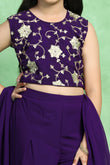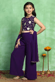 Refresh your wardrobe with this girl’s violet colored ethnic crop top and palazzo and dupatta set from Fashion Dream. This beautiful girl crops top palazzo set includes a sleeveless embroidered crop top, wide-leg palazzo pants, and a matching dupatta, making it an ideal girls ethnic wear set for festive and party occasions. Crafted from Georgette fabric with soft Crepe lining, this outfit feels lightweight, breathable, and gentle on the skin, ensuring all-day comfort. The intricately designed floral embroidery on the crop top adds a rich ethnic touch, making it a standout girl embroidered ethnic dress for weddings, festivals, and family functions. The palazzo pants are designed with a relaxed fit to allow easy movement, making this kid ethnic wear for girls both stylish and practical. The top features a button closure with adjustable back tie-up, offering a secure and comfortable fit. A matching dupatta completes the look, enhancing the traditional appeal of this girl’s festive dress. Perfect for weddings, festivals, birthdays, traditional events, school functions, and celebrations, this girl’s palazzo ethnic set is a must-have addition to your child’s ethnic wardrobe. Pair it with ethnic footwear for a complete girl’s traditional wear look. "Note: The accessories and props used in these photoshoots are for aesthetic purposes only and may not be included in the final product or service."