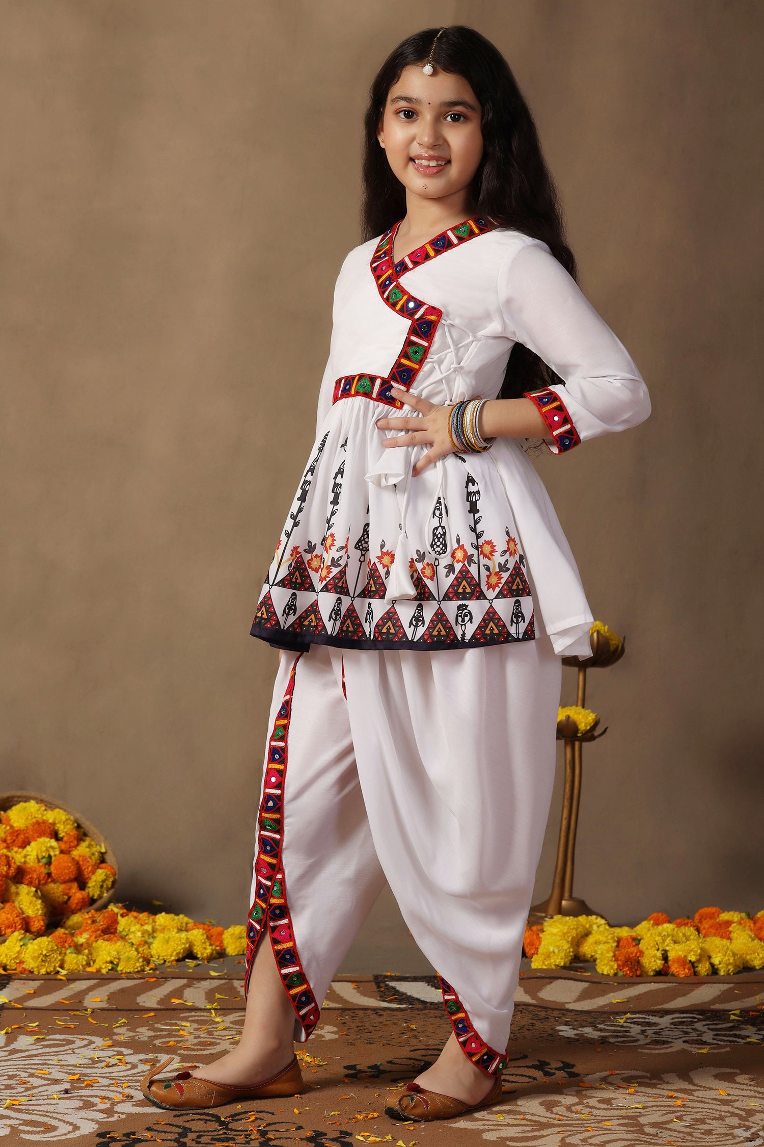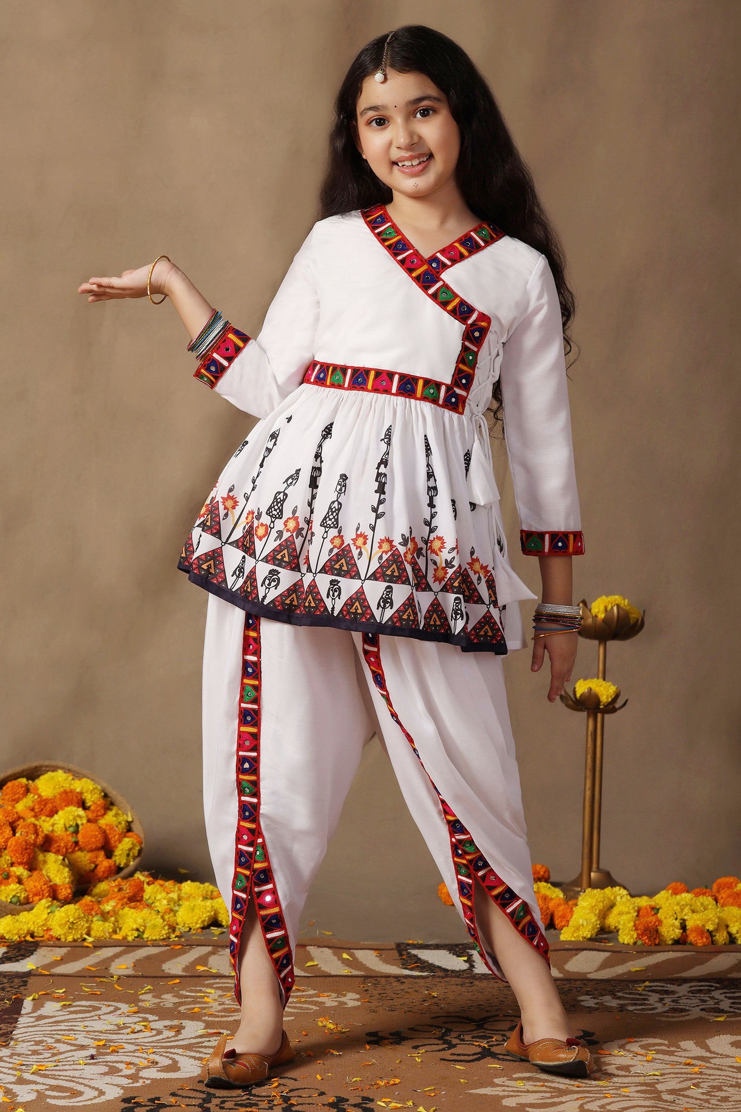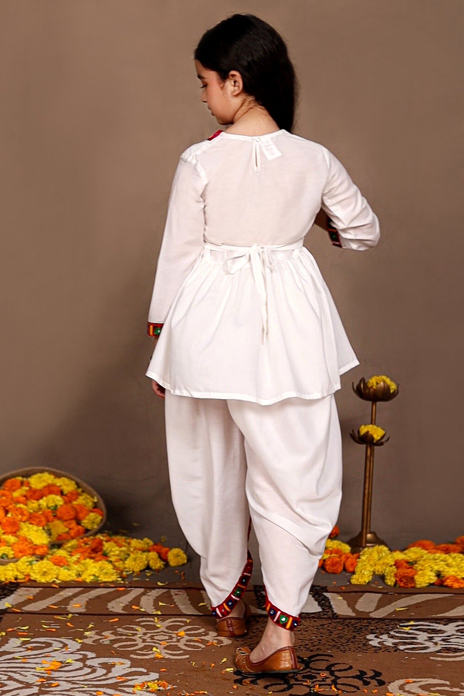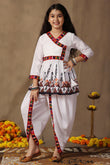 Girls White Cotton Blend Embroidered Angarkha Style Kurta With Dhoti Set