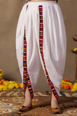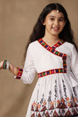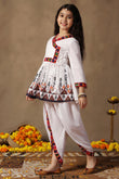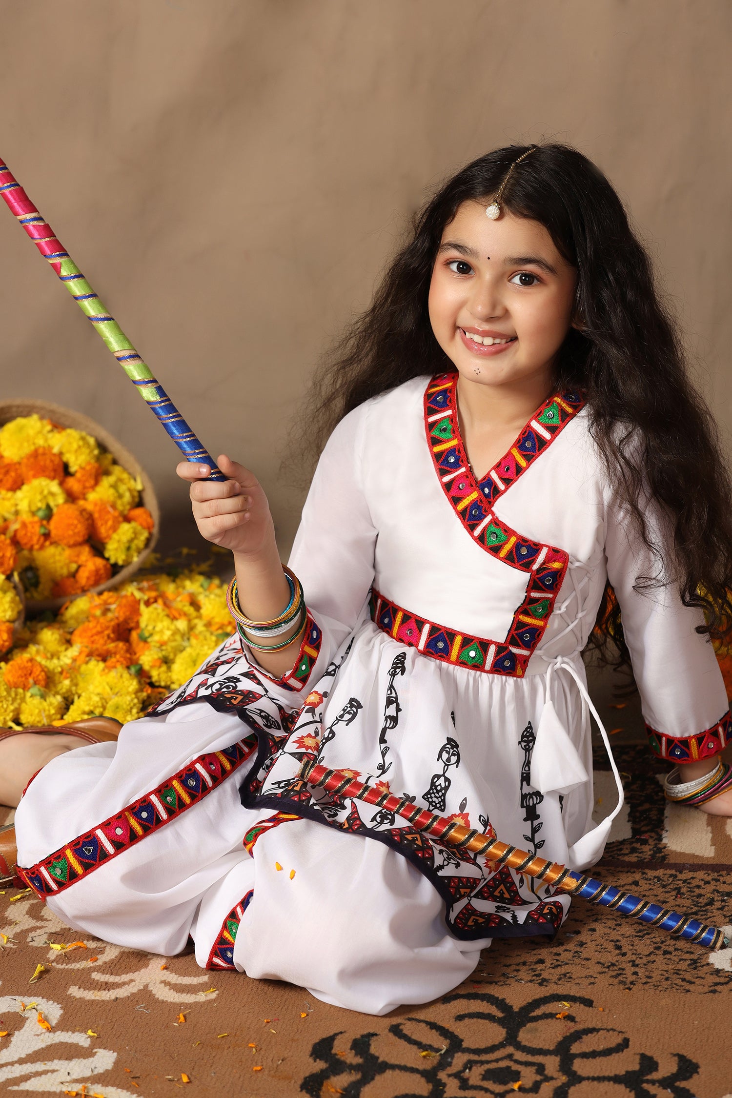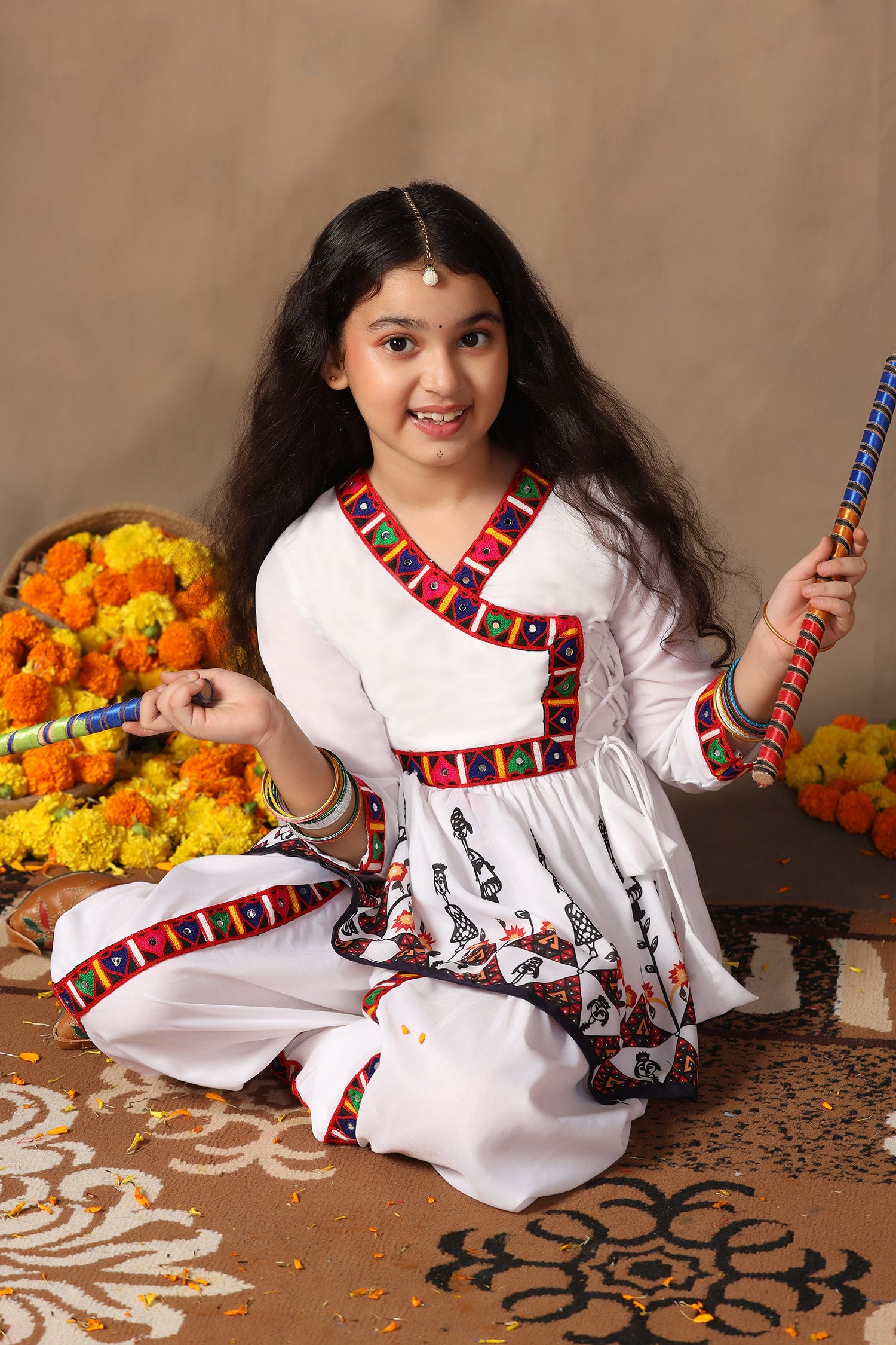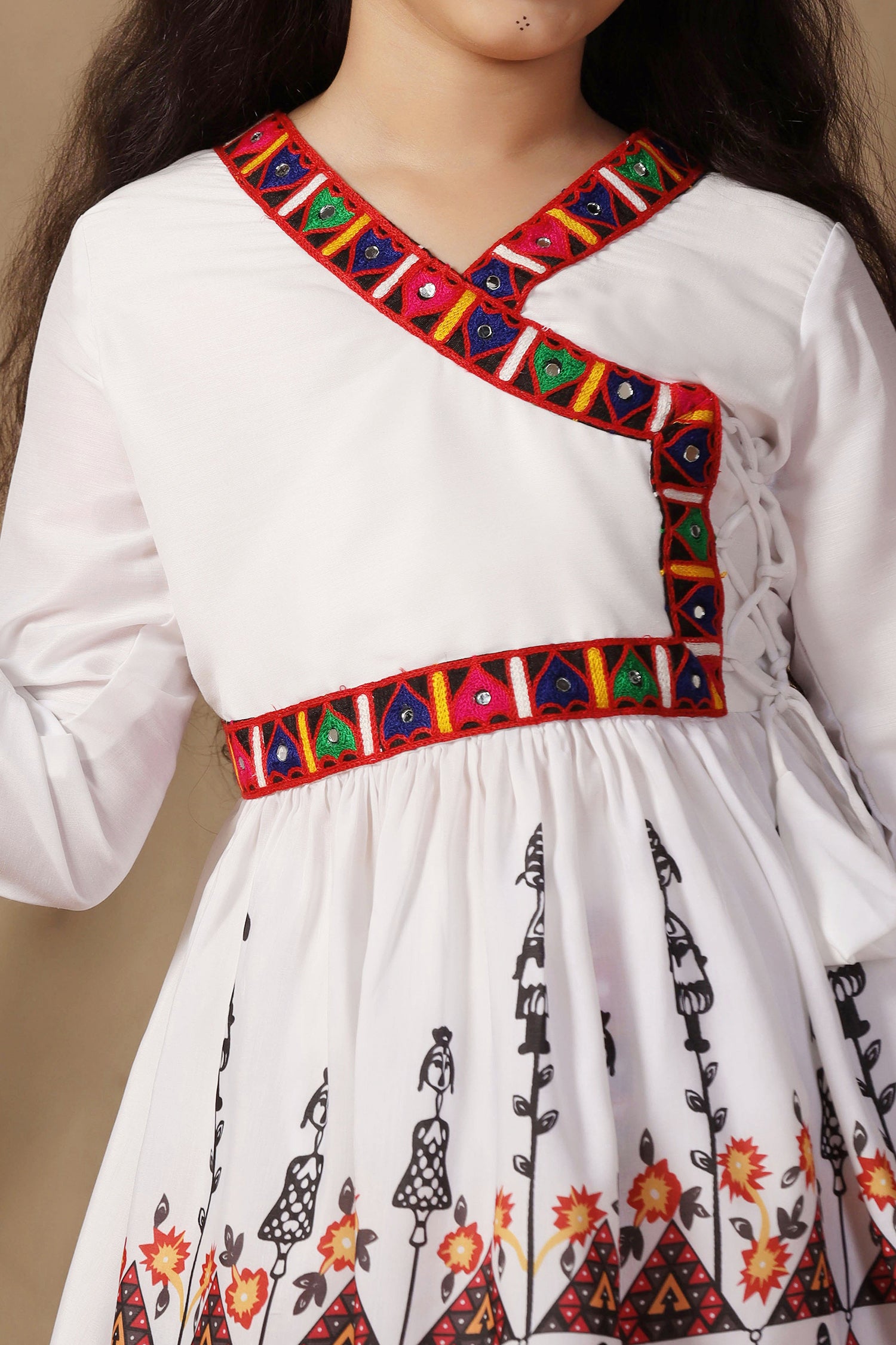 Girls White Cotton Blend Embroidered Angarkha Style Kurta With Dhoti Set