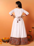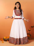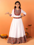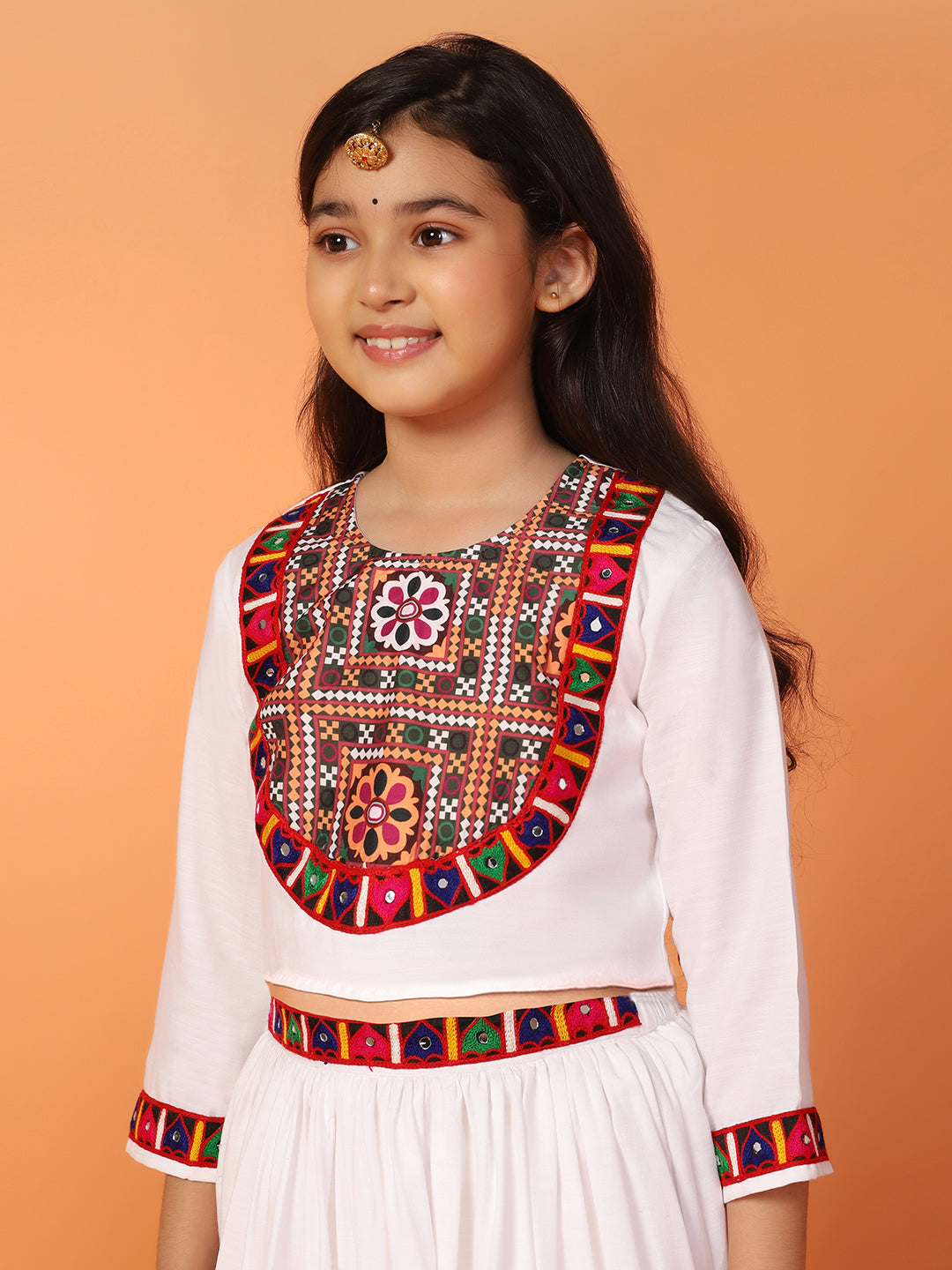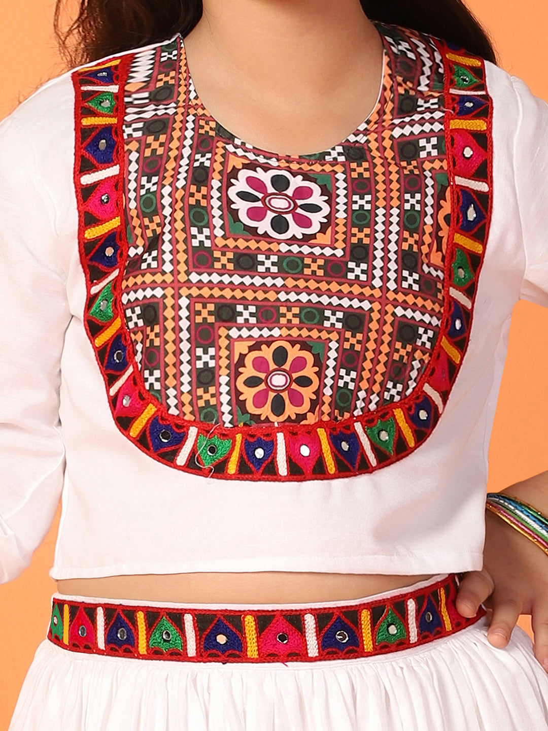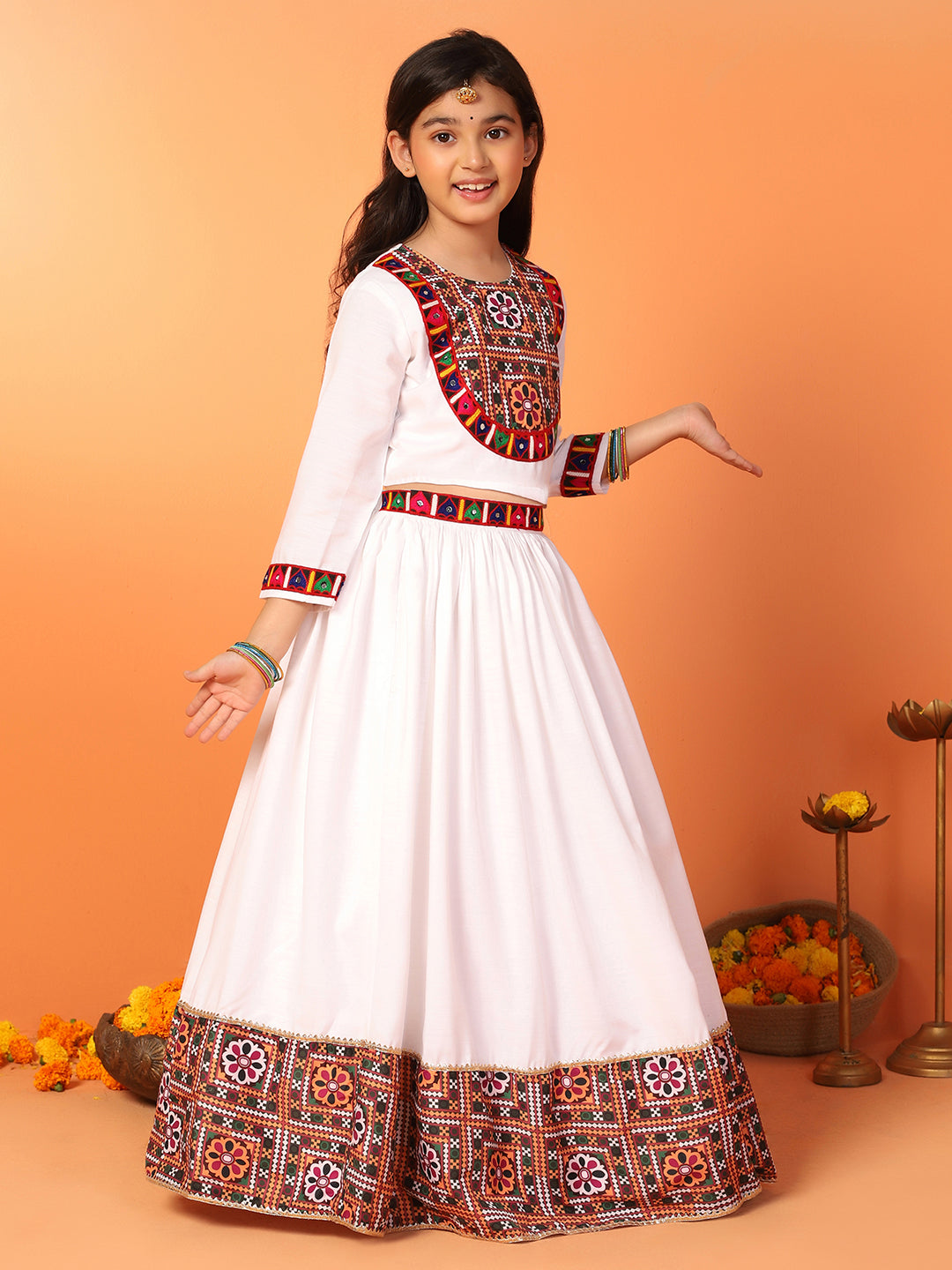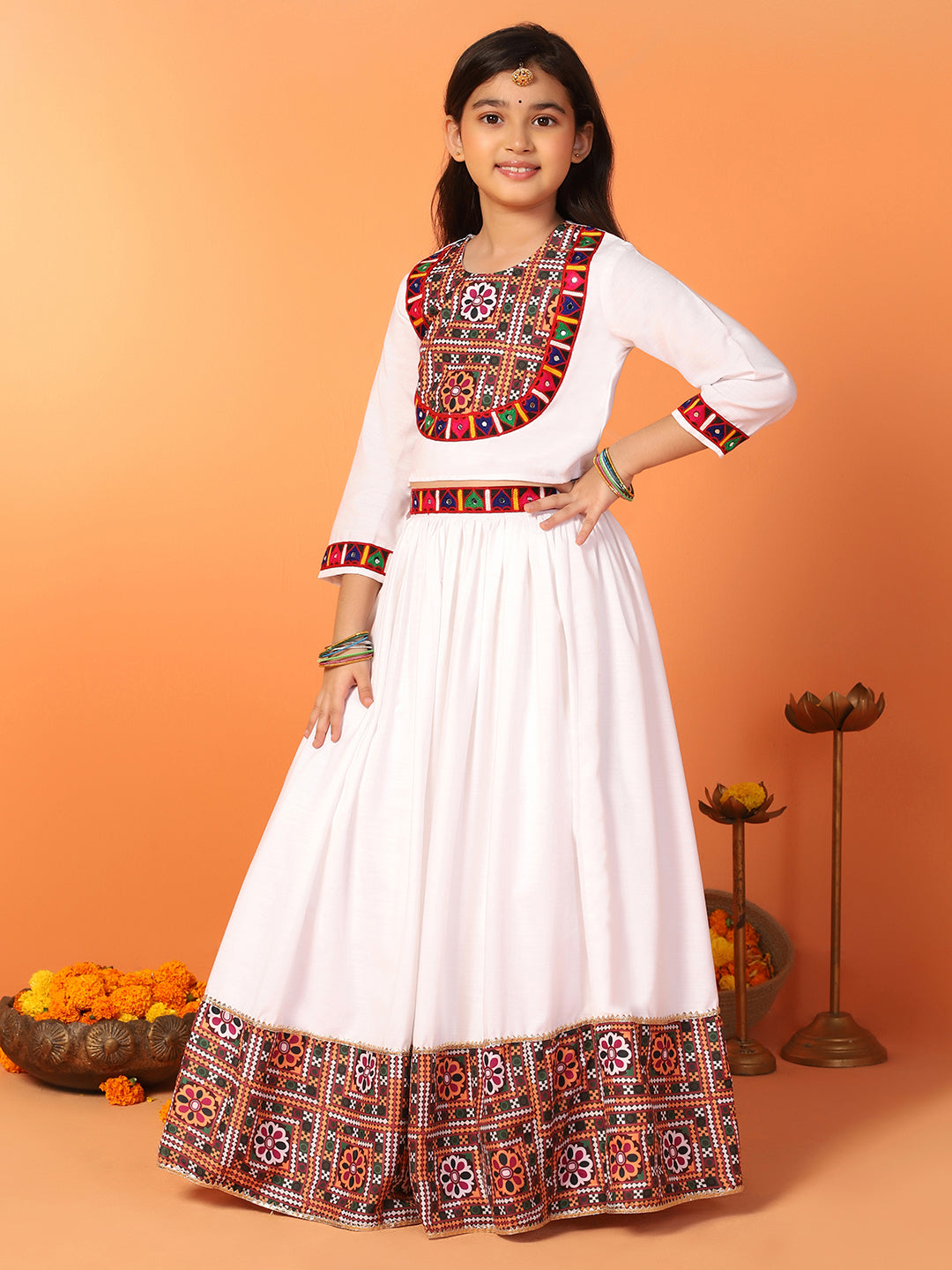 Pair this piece with heels or flats and matching jewelry for a stunning look. Elevate your festive wardrobe with this stunning white lehenga choli, perfect for Navratri celebrations. This solid lehenga Choli for Girls is made from cotton blend using inner butter crepe for comfort. The girls choli features are round neck and 3/4 sleeves with lace detailing and the front of choli is decorated with contrast fabric patch work also has a back button closure and Drawstring for fitting. This kid's Lehenga features are partially elasticated waist with a flared hem. This kids' ethnic wear is perfect for a wedding, garba party, sangeet, cocktail party, or other special events. Pair this outfit with juttis that have decorations and hefty earrings.