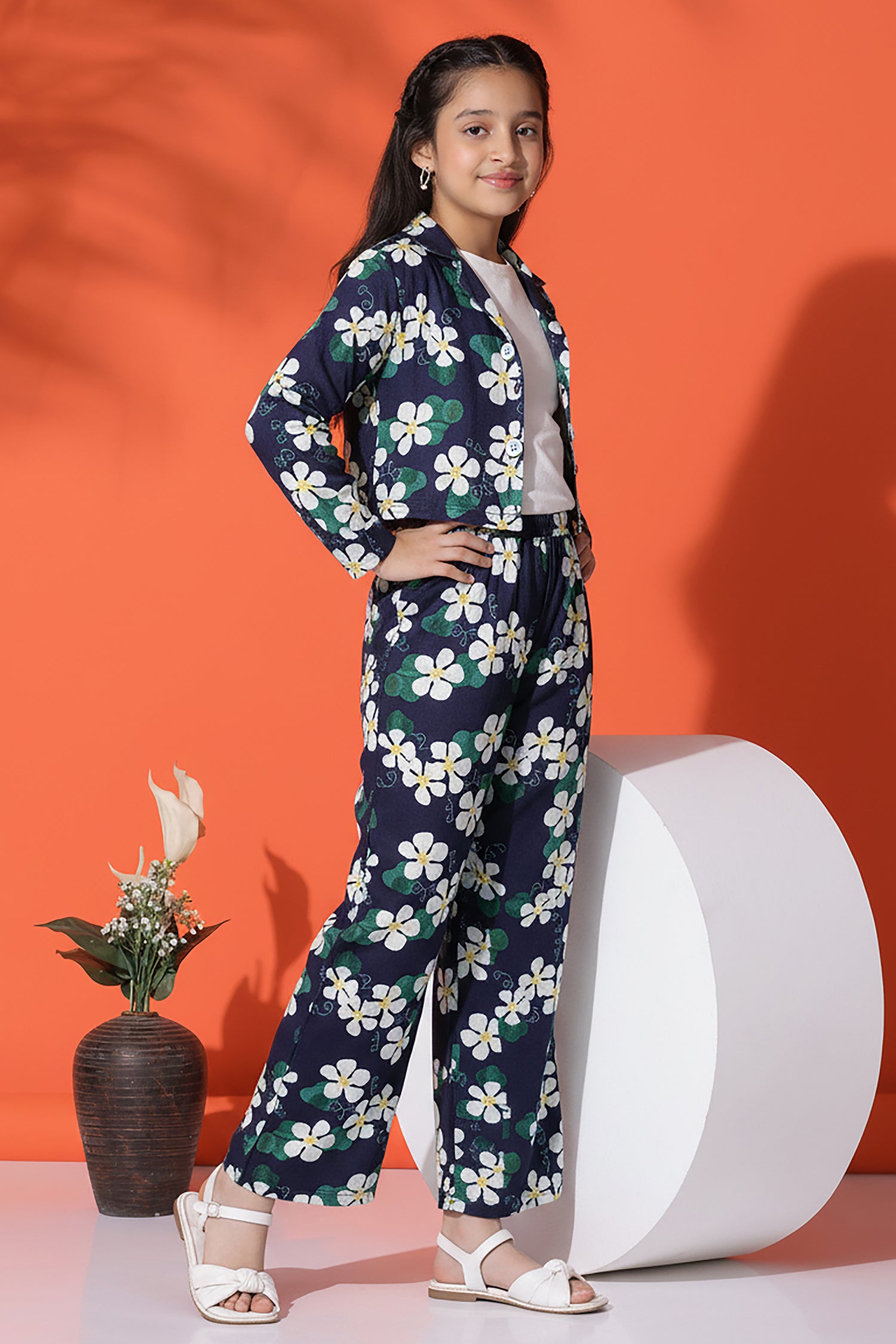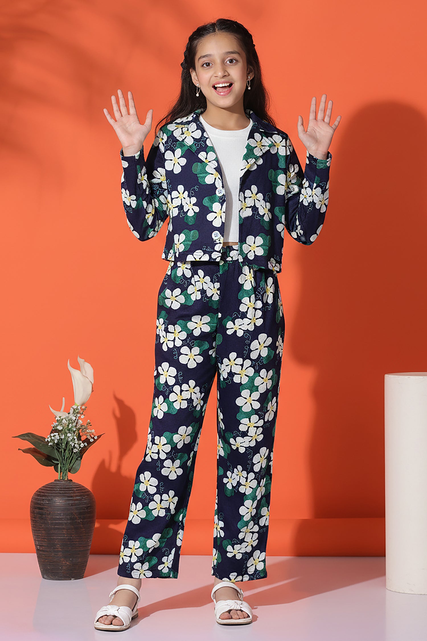Girls White Cotton Blend Flower Printed Co ords sets Whith Jecket