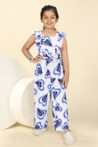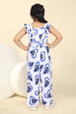 Spruce up your wardrobe with this white color printed Jumpsuit for girls from Fashion Dream. This casual jumpsuit has print as pattern type and is perfect for a day out with friends or a night of get-togethers with family. Made from a soft and breathable cotton blend fabric, this sleeveless jumpsuit ensures all-day ease while keeping your child cool during warm weather. The jumpsuit features a trendy all-over heart print, enhanced with ruffle sleeve detailing for a playful look. A back-zip closure ensures easy wear and a neat finish, while silhouette allows comfortable movement. The waist tie-up belt offers an adjustable and flattering fit. Perfect for summer wear, casual outings, parties, holidays, and daily use, this jumpsuit pairs effortlessly with sneakers or sandals, making it a versatile choice for girls. "Note: The accessories and props used in these photoshoots are for aesthetic purposes only and may not be included in the final product or service."