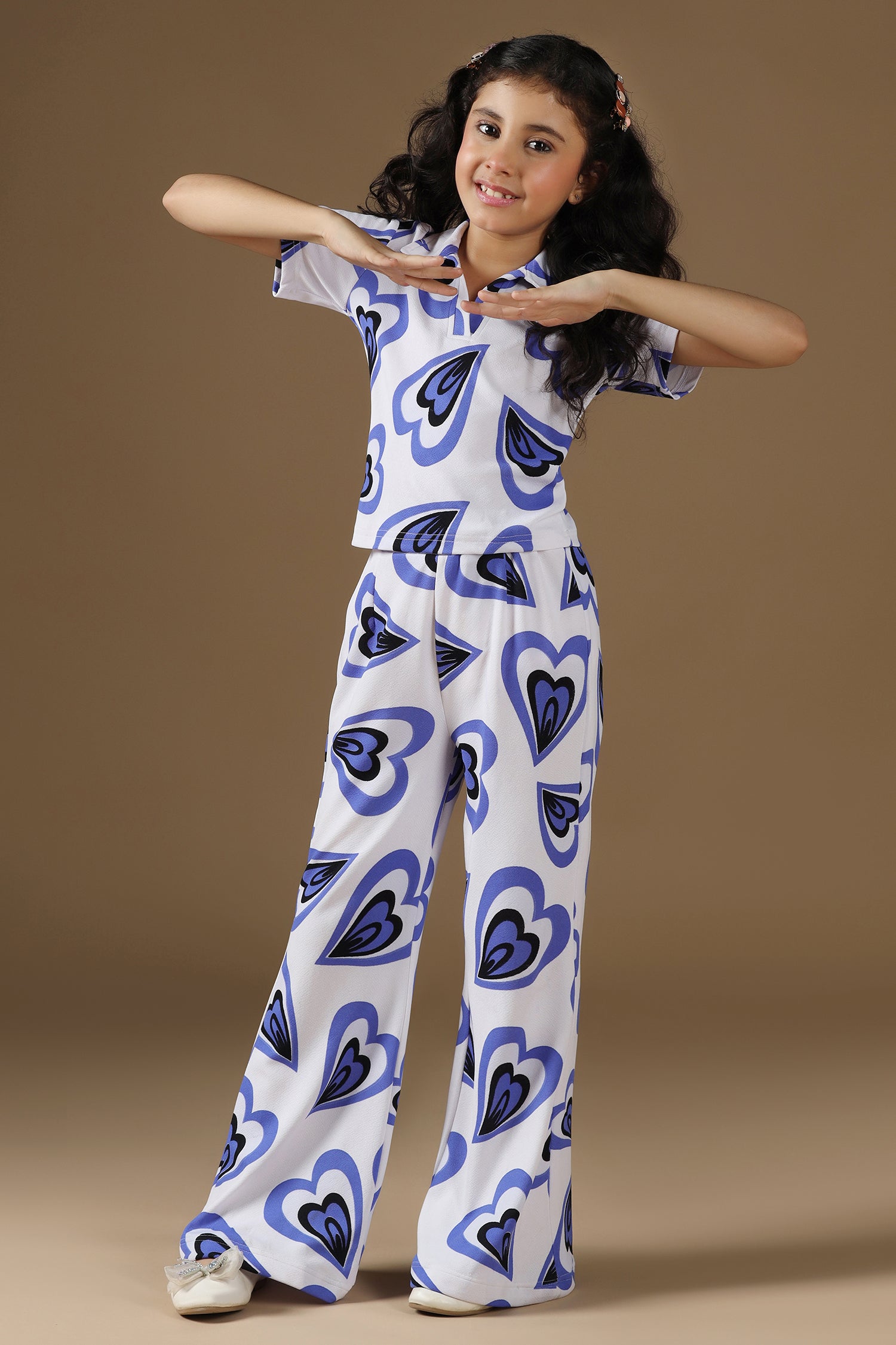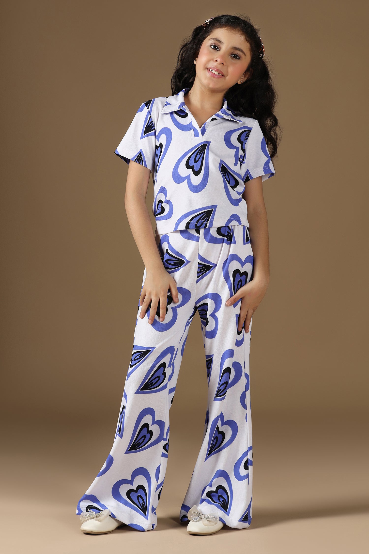 Refresh your girl’s wardrobe with this stylish white co-ord set from Fashion Dream. Designed to deliver the perfect blend of comfort and modern fashion. This trendy top and pant set for girls is ideal for casual outings, daily wear, and small gatherings. Crafted from soft cotton blend fabric, this two-piece outfit is lightweight, breathable, and gentle on the skin, ensuring all-day comfort. The top features an attractive printed design that enhances its overall look. It is styled with a collar neck and half sleeves, giving a smart and classy appearance. Designed in a pull-on style, the top is easy to wear and provides a comfortable fit, making it suitable for active kids. The matching pant comes with a coordinated print and a partially elasticated waistband, offering flexibility and a secure fit throughout the day. Designed with care, this western wear co-ord set from Fashion Dream focuses on style, comfort, and practicality. Pair it with flats or sandals for a casual yet fashionable look. Easy to maintain and suitable for regular wear, this white co-ord set is a perfect addition to your girl’s everyday wardrobe. Note: Accessories and props used in the images are for photoshoot purposes only and are not included with the product.