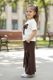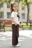 Let your little girl step out in style with this elegant and comfortable Clothing set. This top and palazzo pant set designed to deliver both fashion and ease. This coordinated outfit features a smart colour combination and delicate bow detailing, making it perfect for everyday wear as well as special occasions. The set includes a soft off-white short-sleeve rib fabric top highlighted with a bold bow on the front, adding a classy and playful charm. Paired with solid brown wide-leg palazzo pants, the outfit stands out with beautifully crafted bow appliqués on both legs. The relaxed silhouette ensures freedom of movement while maintaining a trendy look. Ideal for outings, birthdays, or casual events when styled with a small sling bag or mini backpack and white sneakers for a cute and comfortable daytime look.