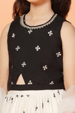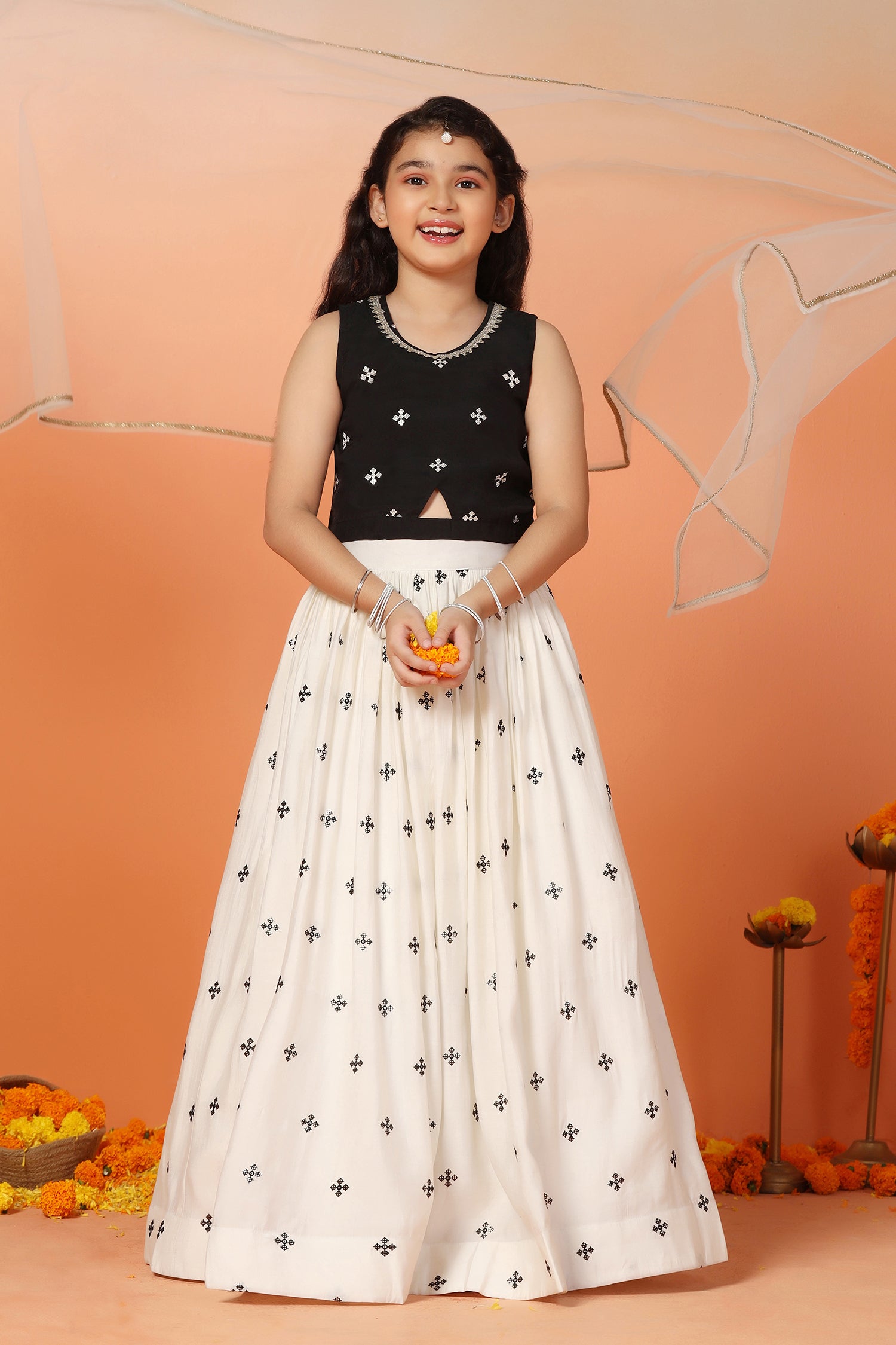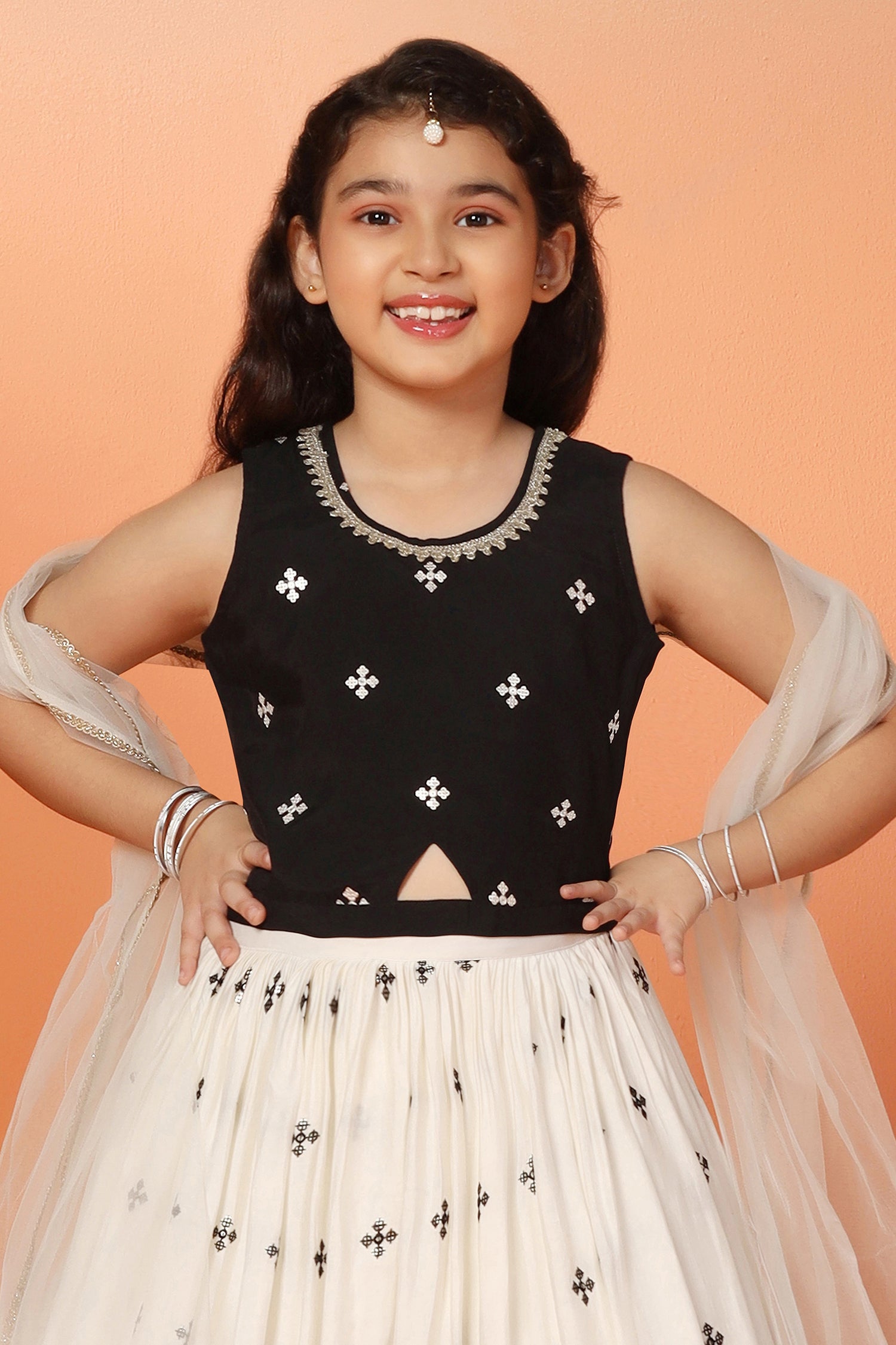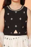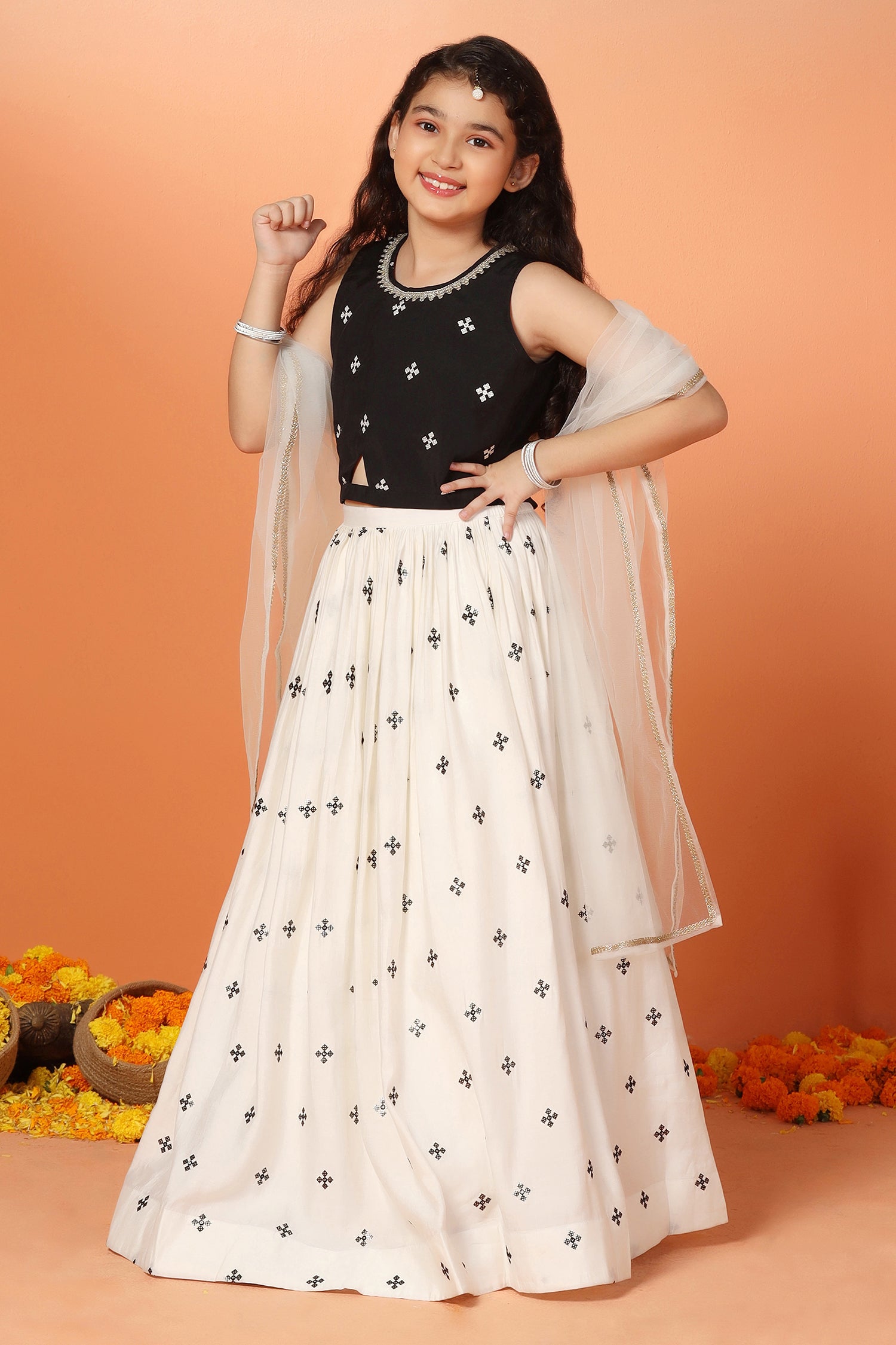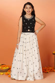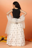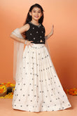 Let your little one make a graceful impression in this readymade Girls White Silk Blend Lehenga Choli Set with Dupatta by Fashion Dream. This elegant 3-piece ensemble includes a flared lehenga, a sleeveless choli, and a soft matching dupatta—perfectly designed for festive celebrations, weddings, and family functions. Crafted from a smooth silk blend and lined with breathable crepe, the outfit combines comfort with a refined finish. The choli features a round neckline with a delicate lace border and a centre keyhole for added charm, while the back is detailed with fabric-covered buttons closer and a tie-back drawstring for a secure and adjustable fit. The all-over embroidered lehenga is finished with a partially elasticated waistband to ensure flexibility and ease of movement. Completing the look is a net dupatta edged with lace detailing, bringing softness and balance to this timeless ethnic wear set for girls.