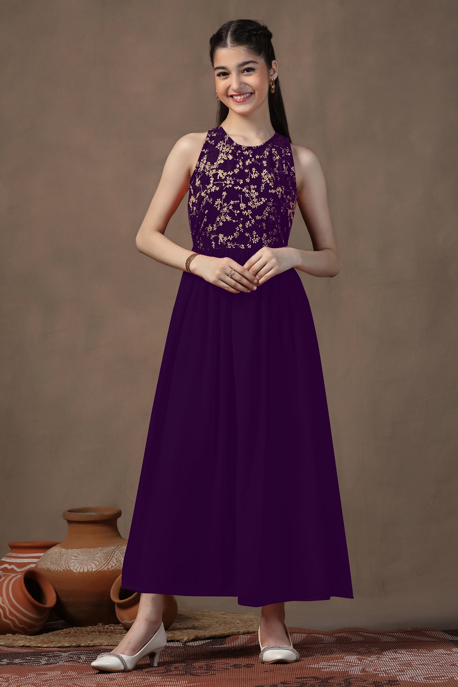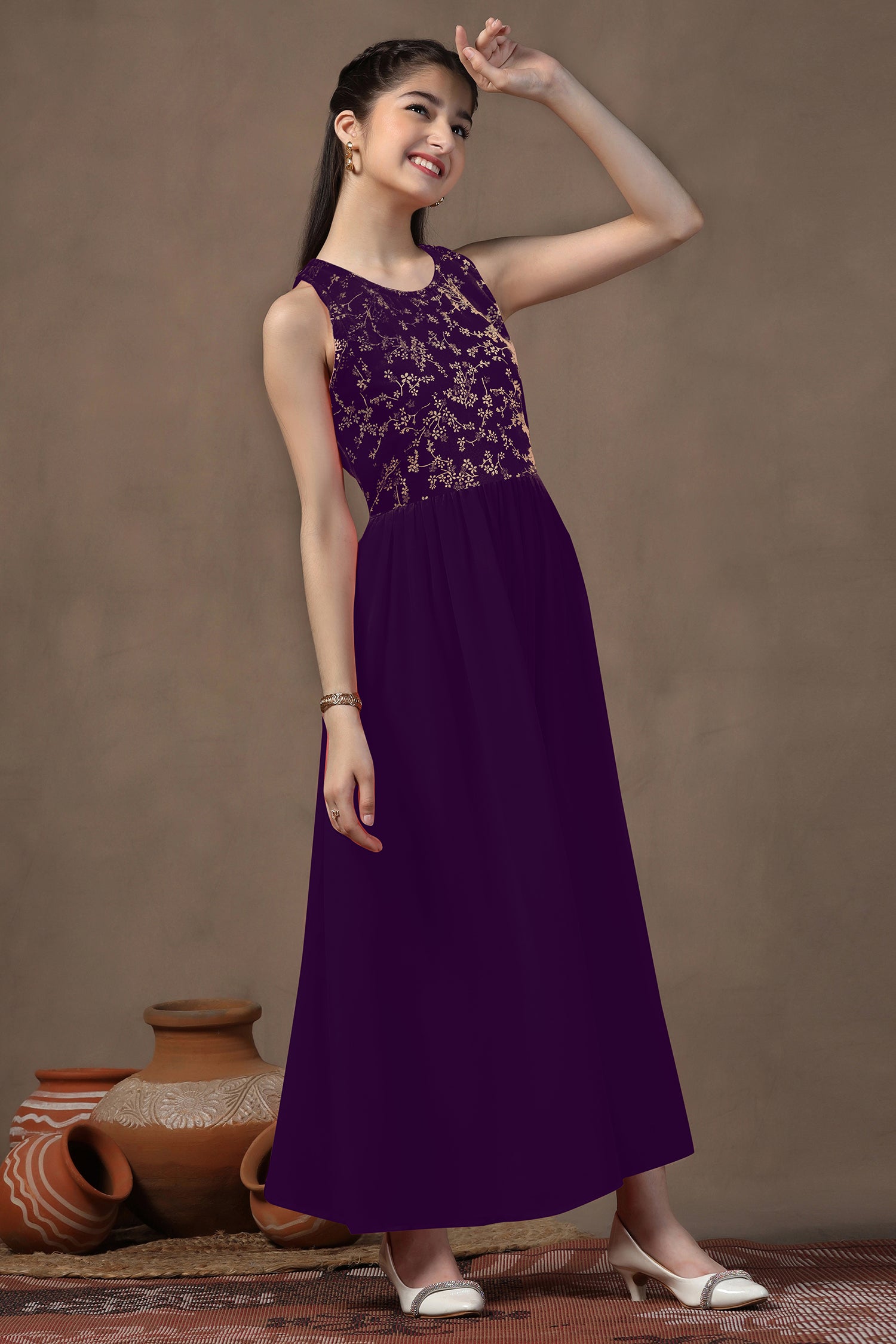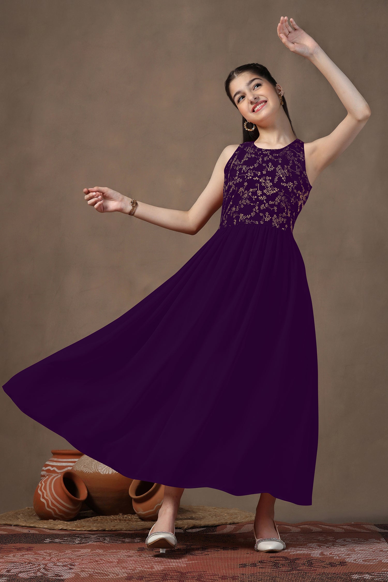 Dress your little girls with this Wine color maxi length girls dress from Fashion Dream. Pair it up with a cute hair accessory and closed shoes for her to shine at the best friend’s birthday party. Add a touch of elegance and charm to your girl's wardrobe with this stunning Solid maxi dress with Foil print tie-up Shrug. Crafted in georgette fabric with butter crepe lining, this stylish dress features a Square neck with tie-up shrug, sleeveless sleeves and flared silhouette. This fit and flare style dress with elastic fitting at the front side makes it ideal for both party wear and festive wear. Style this dress with her favorite flats or heels and use light jewelry to make her look more beautiful.