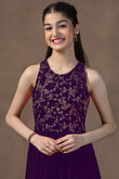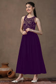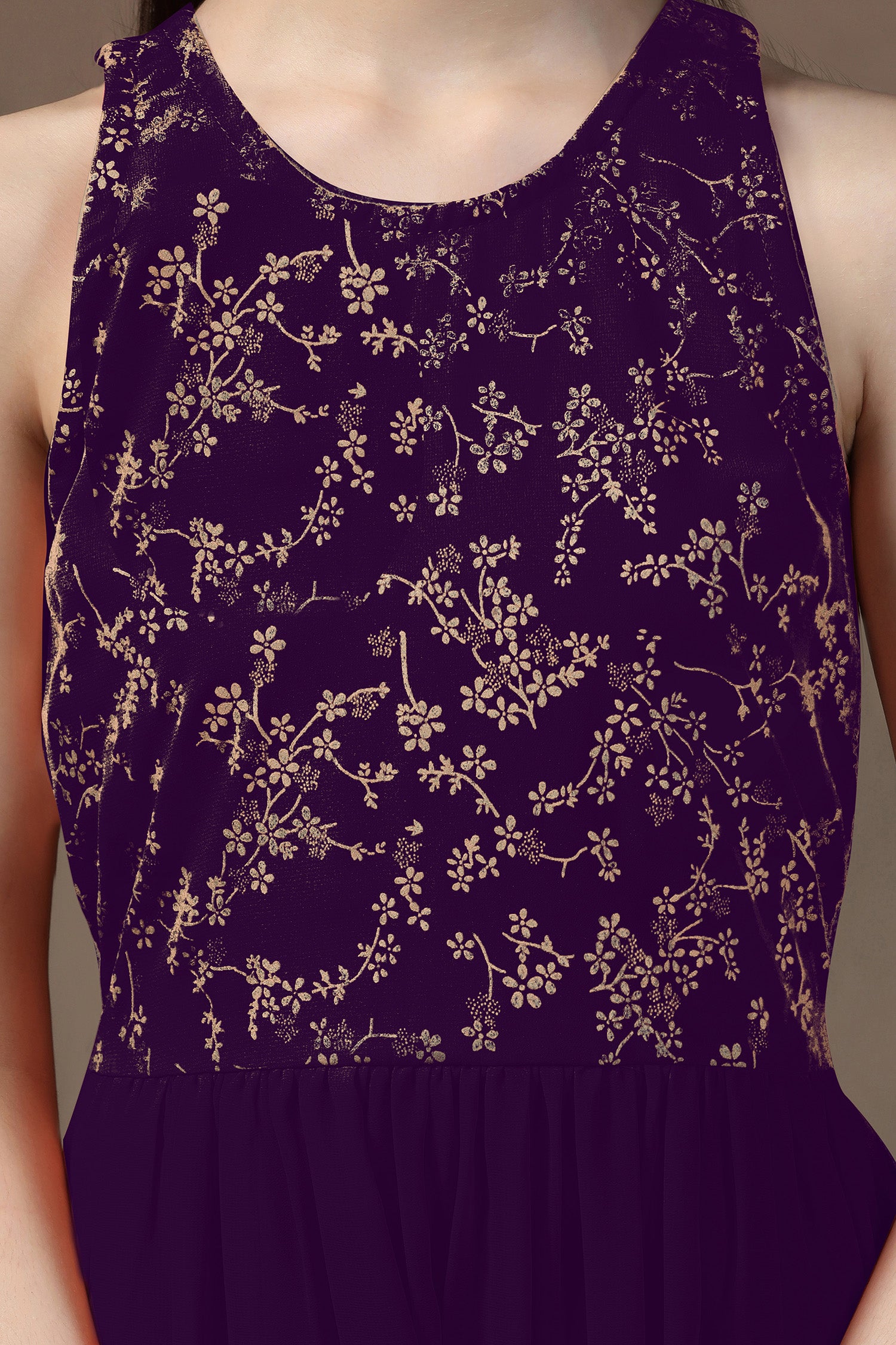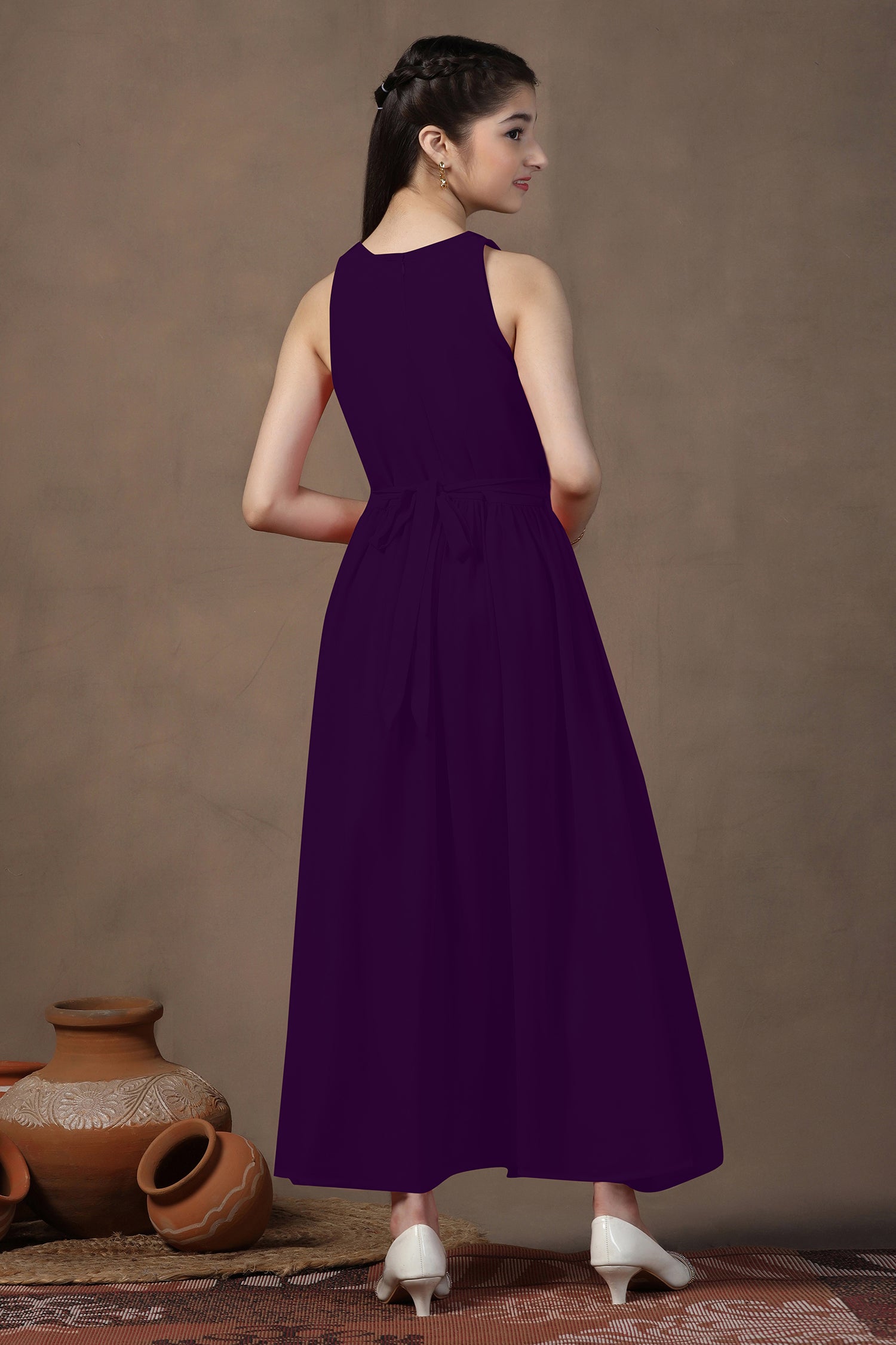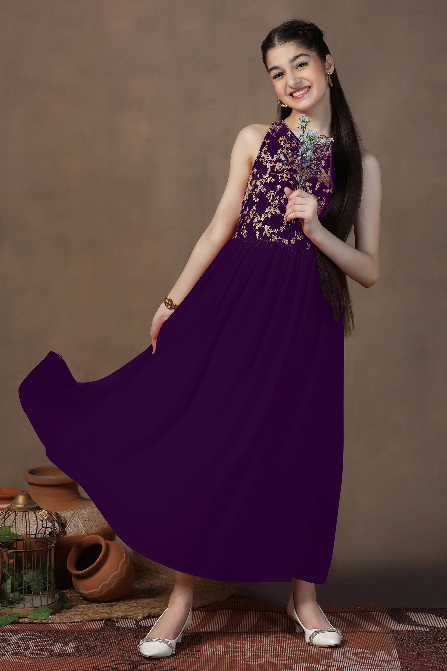 Dress your little girls with this Wine color maxi length girls dress from Fashion Dream. Pair it up with a cute hair accessory and closed shoes for her to shine at the best friend’s birthday party. Add a touch of elegance and charm to your girl's wardrobe with this stunning Solid maxi dress with Foil print tie-up Shrug. Crafted in georgette fabric with butter crepe lining, this stylish dress features a Square neck with tie-up shrug, sleeveless sleeves and flared silhouette. This fit and flare style dress with elastic fitting at the front side makes it ideal for both party wear and festive wear. Style this dress with her favorite flats or heels and use light jewelry to make her look more beautiful.