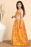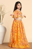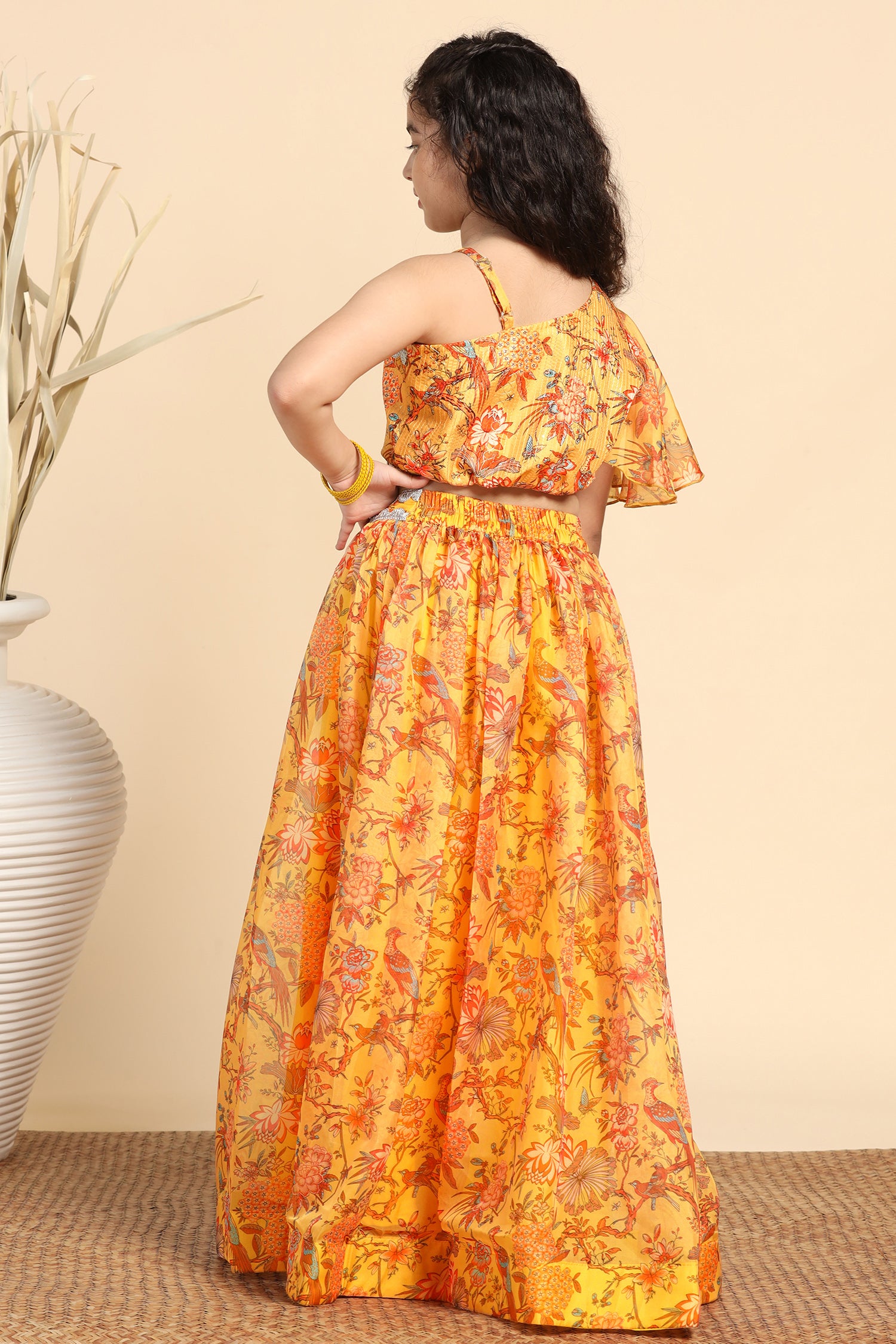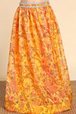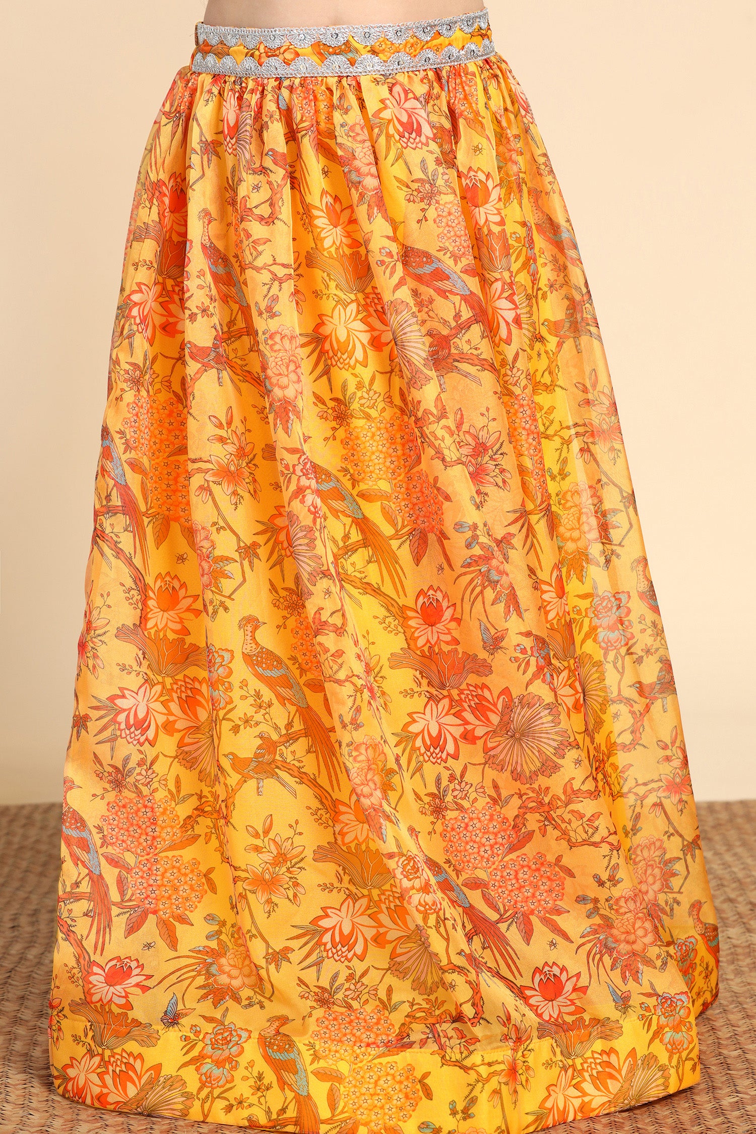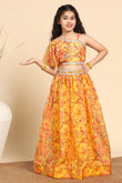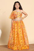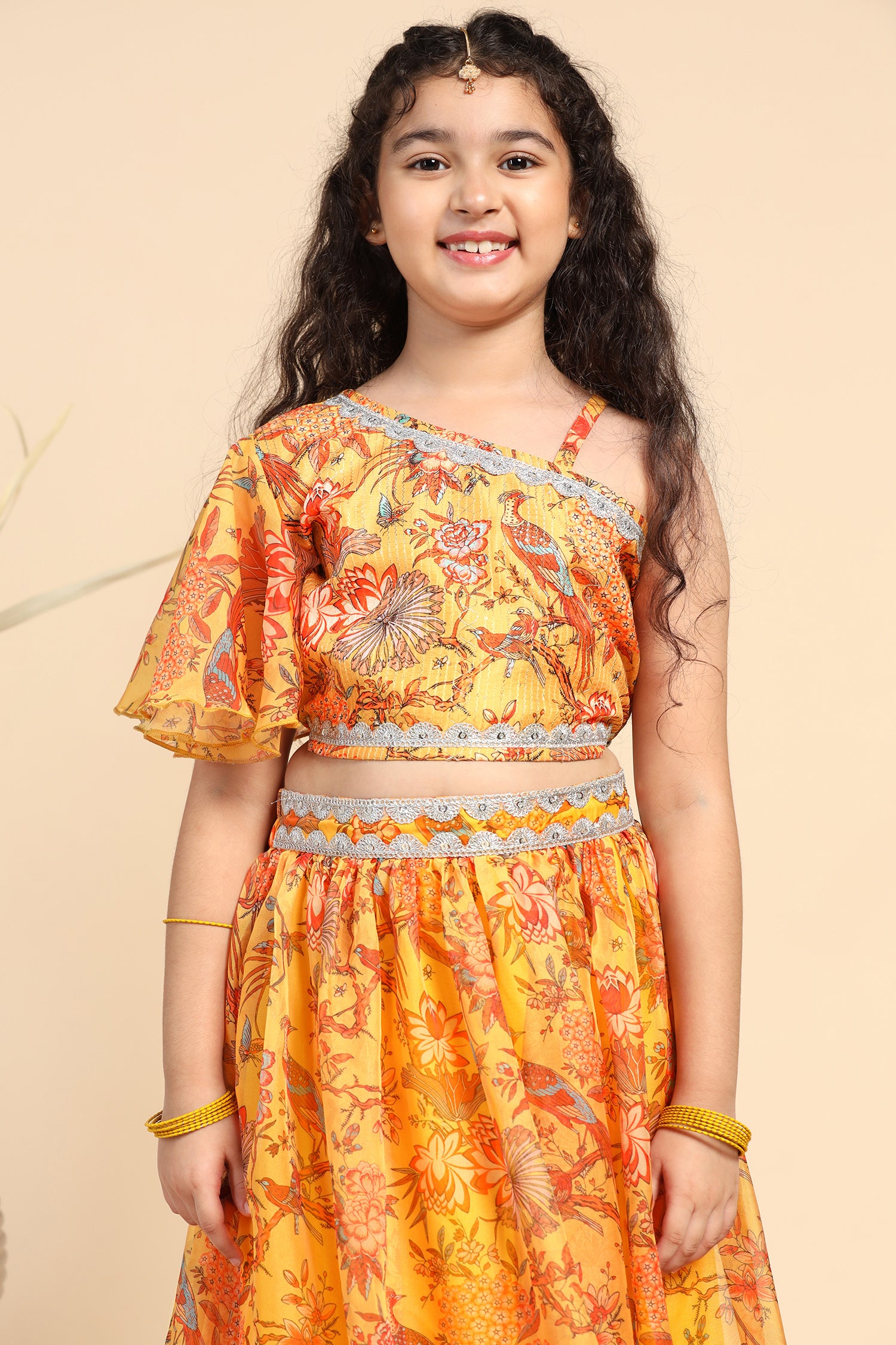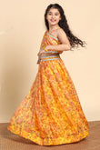 Shop from a wide range of beautifully crafted Lehenga Choli from Fashion Dream. Style the set with earrings and golden heels for a beautiful traditional outfit. Get a charming and elegant option for festive moments with this yellow color lehenga choli. This printed lehenga choli is made from crepe silk with butter crepe linning for comfort. The choli for girls has a one sholder neck, sleevless bodies, lace detailing at the front of the choli at yoke and also has a side zip closure. This Animal printed lehenga is half elastic with self attached emroidered belt detailing. This traditional lehenga choli for kids is ideal for special occasions including weddings, sangeet, garba parties and cocktail parties.