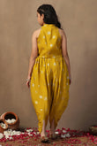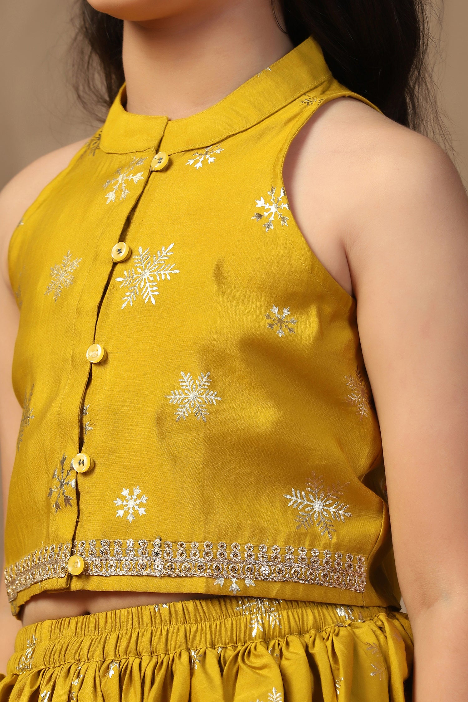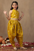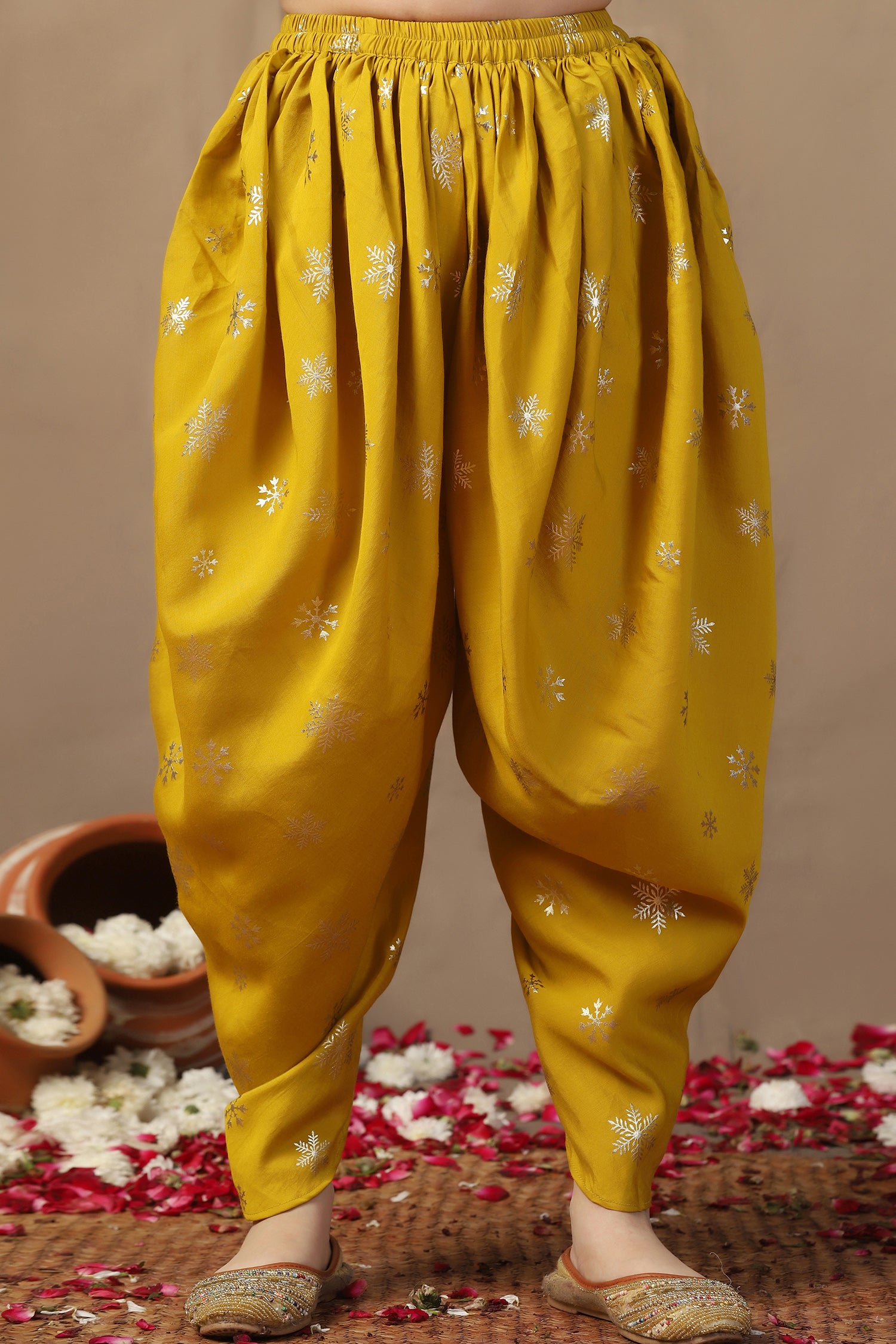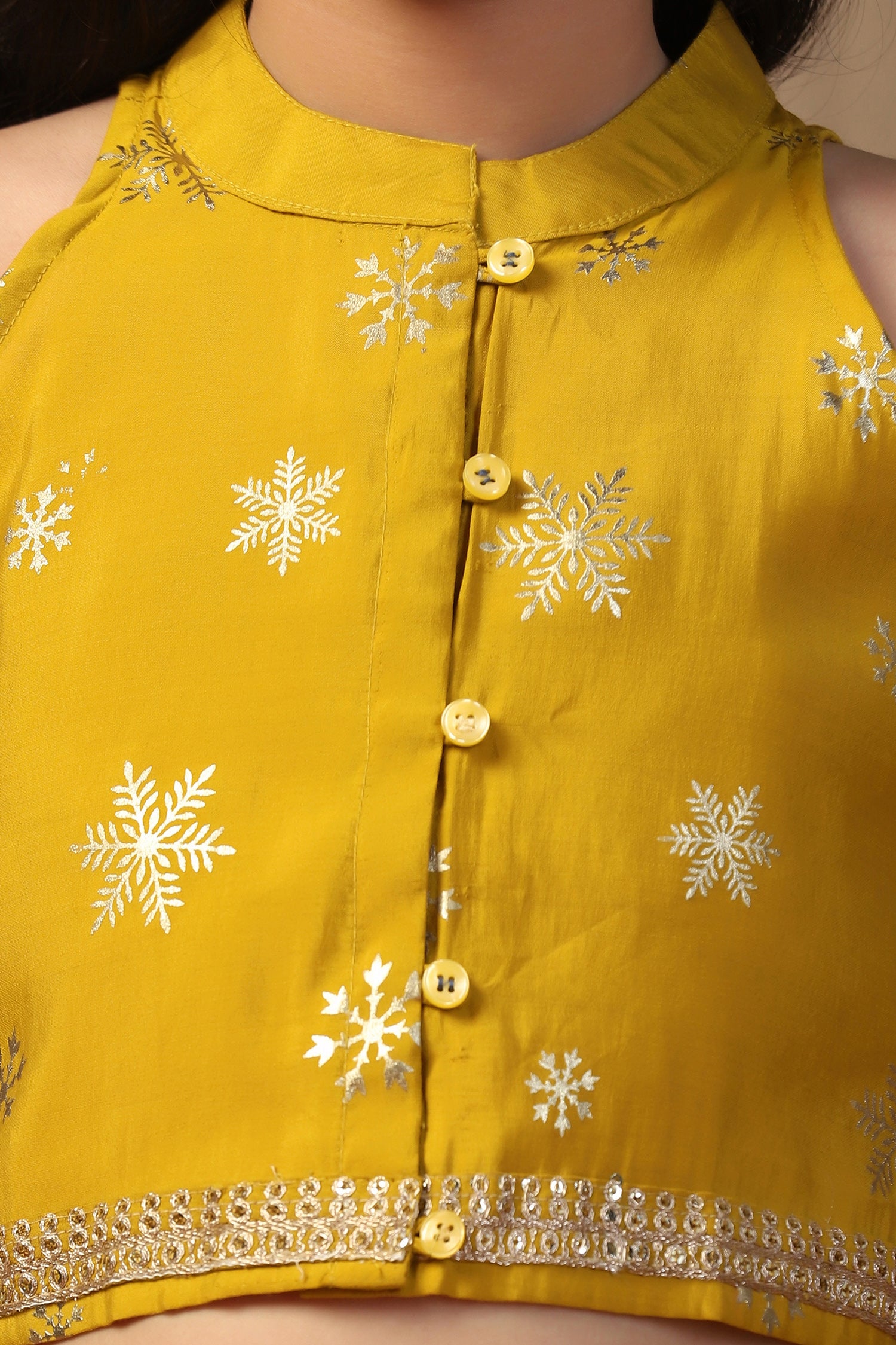 Refresh your wardrobe with this Yellow color Salwar Suit Set from Fashion Dream. This traditional yet stylish outfit is designed to give comfort and a smart look, making it a great choice for kids clothes for girls. Made from soft Roman Silk fabric, this set is lightweight, smooth on the skin, and easy to carry for long hours. The sleeveless top comes with a mandarin collar and front button closure, along with lace detailing at the hem for a neat finish. It has attractive foil print all over, giving it a festive touch. The matching dhoti is designed with a loose and airy fit, along with a partially elasticated waistband that makes it easy to wear and comfortable for movement. Together, the top and dhoti make a stylish suit set for girls that can be worn for many occasions. To complete the look, pair this dhoti set with traditional juttis, simple bangles, and a cute hair accessory like a floral clip or headband. This styling adds charm and makes the outfit more festive. This ethnic wear for kids girls is ideal when you are looking for suit for girls, salwar suit for kids girls, punjabi suit for kids girls, kids ethnic wear girls, patiyala dress for girls kids, top set for girls, traditional dress for kids girls, indo western dress for girls, punjabi suit for girls, suit set for girls, dhoti top set for girls, anarkali suit for girls, ethnic dresses for girls, or ethnic wear for girls. It is also a good choice as Rakhi dress for girls, giving you many styling options for special occasions. Note: The accessories and props used in these photoshoots are for aesthetic purposes only and may not be included in the final product or service.