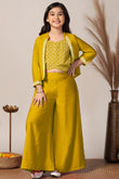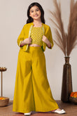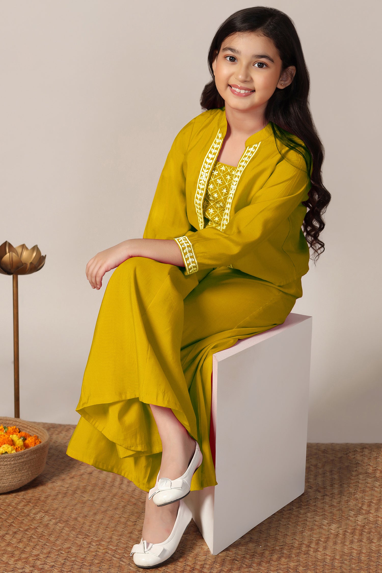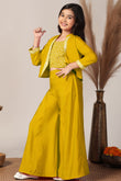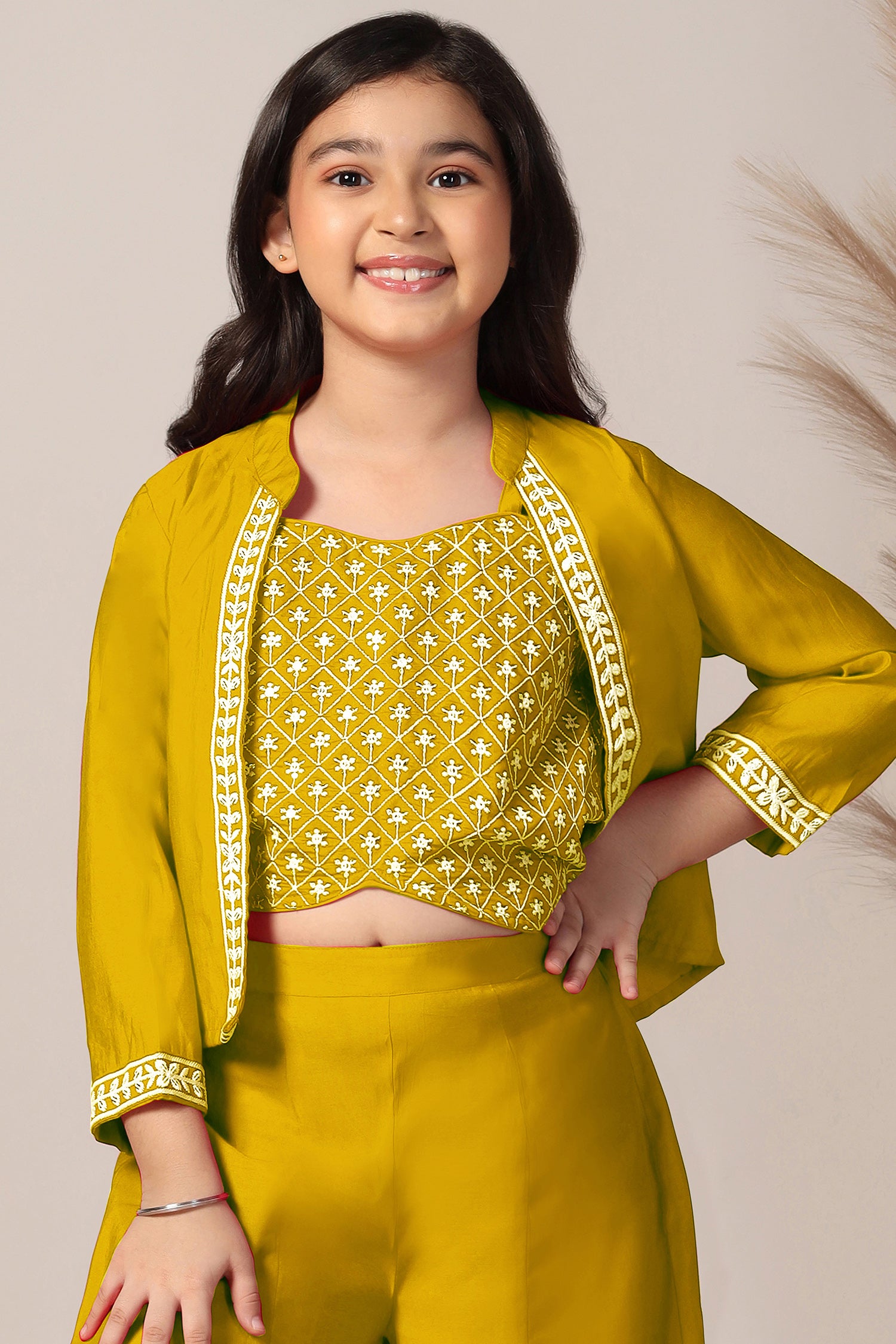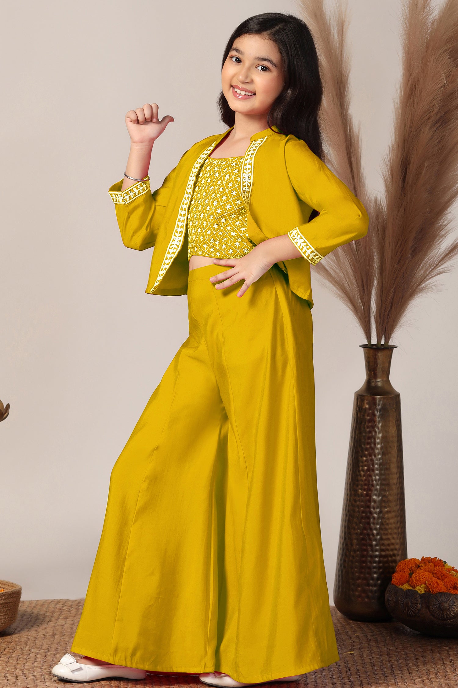 This ethnic set completes your girl’s look for your special occasions. Get your girls ready for the festive season in this beautiful Yellow color kurta palazzo and jacket set, crafted from silk blend fabric. This crop top for kids is highlighted sweetheart neck, sleevless bodice and embroidery work on yoke which is must-have for all fashion lovers. Finish her fantastic look with a matching jacket and solid palazzo style bottom which includes relaxed partially elasticated waistband. Get ready your little girl for upcoming festive event by pairing this indo western set with sandals, earrings and cute hair clips."Note: The accessories and props used in these photoshoots are for aesthetic purposes only and may not be included in the final product or service."