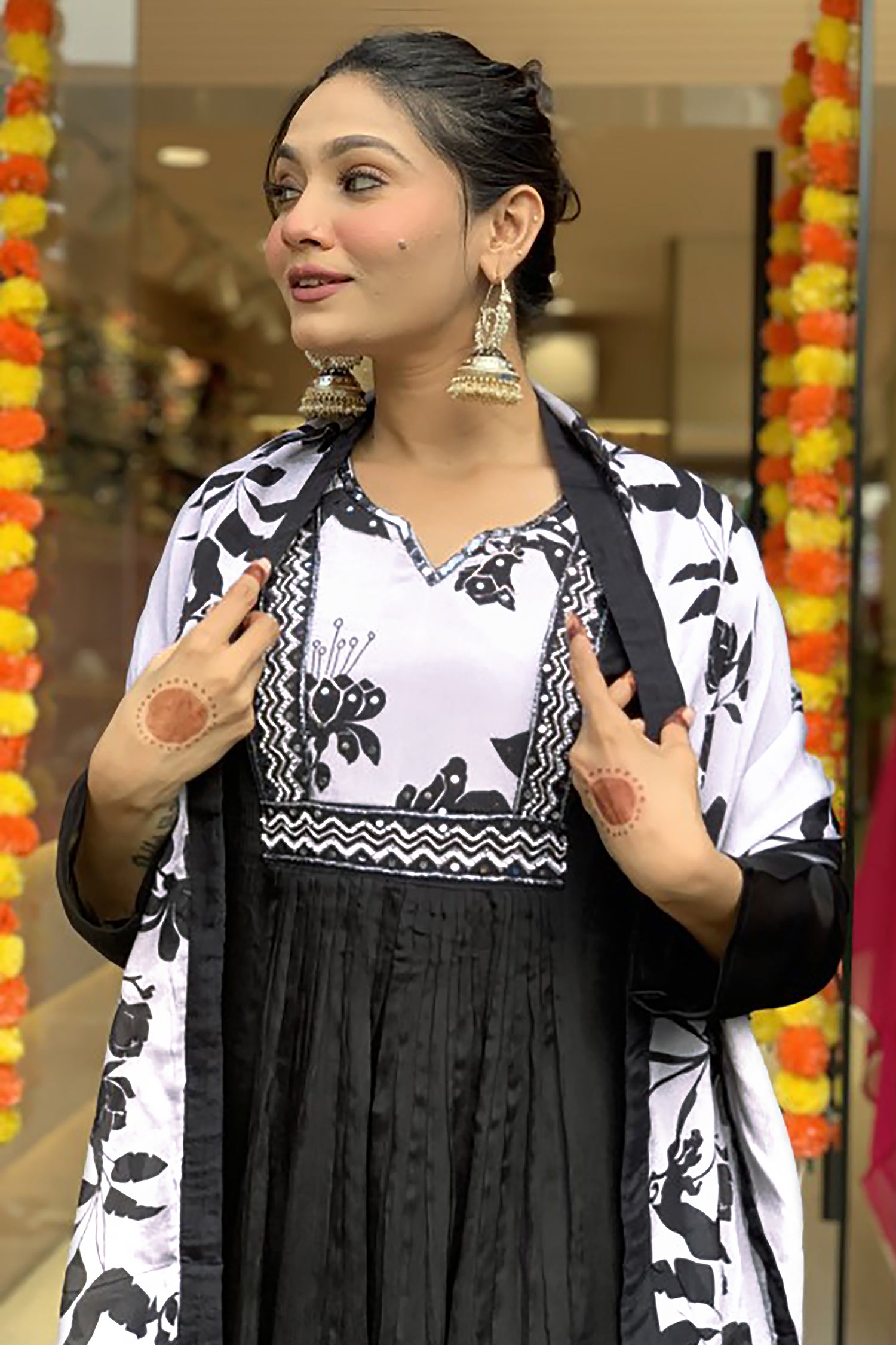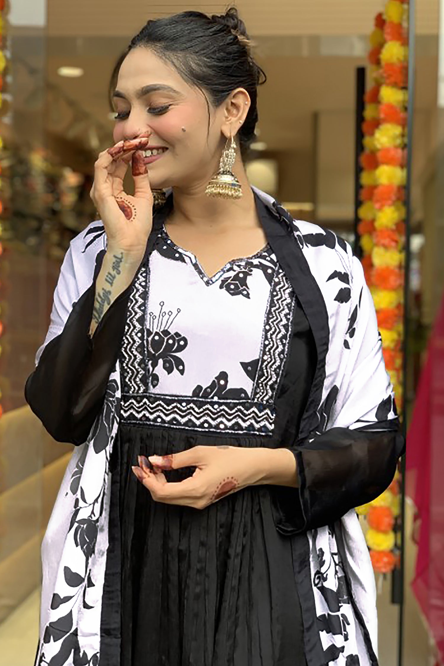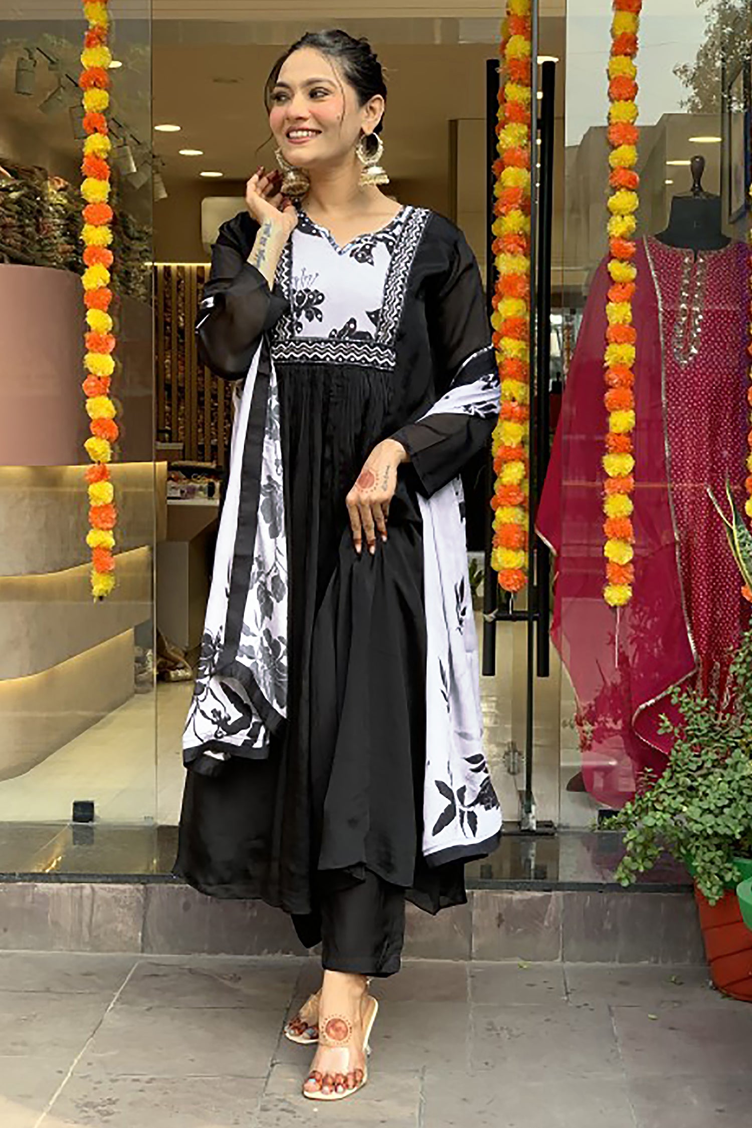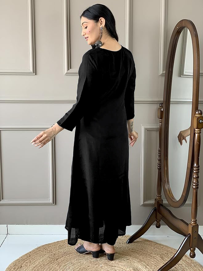 Refresh your wardrobe with this Black colored Kurta Pant Set with Dupatta. This kurta and pant set with dupatta completes your look for your special occasions. Elevate your style with this exquisite printed kurta set, made from lightweight and breathable chinon fabric, you'll stay cool and comfortable all day long. The elegant calf-length kurta features a Noch neck, regular 3/4th sleeves and intricated embroidered lace on neckline which creates a stunning look. It comes with matching pant bottom having partial elasticated waistband. This Kurta and Pant set comes along with solid patterned dupatta which makes this more beautiful traditional wear for women. Whether you are dressing up for a special occasion or keeping it casual, this kurta pant set for women is a stylish choice. Add some minimal accessories to complete the look and make it truly unforgettable!