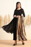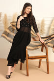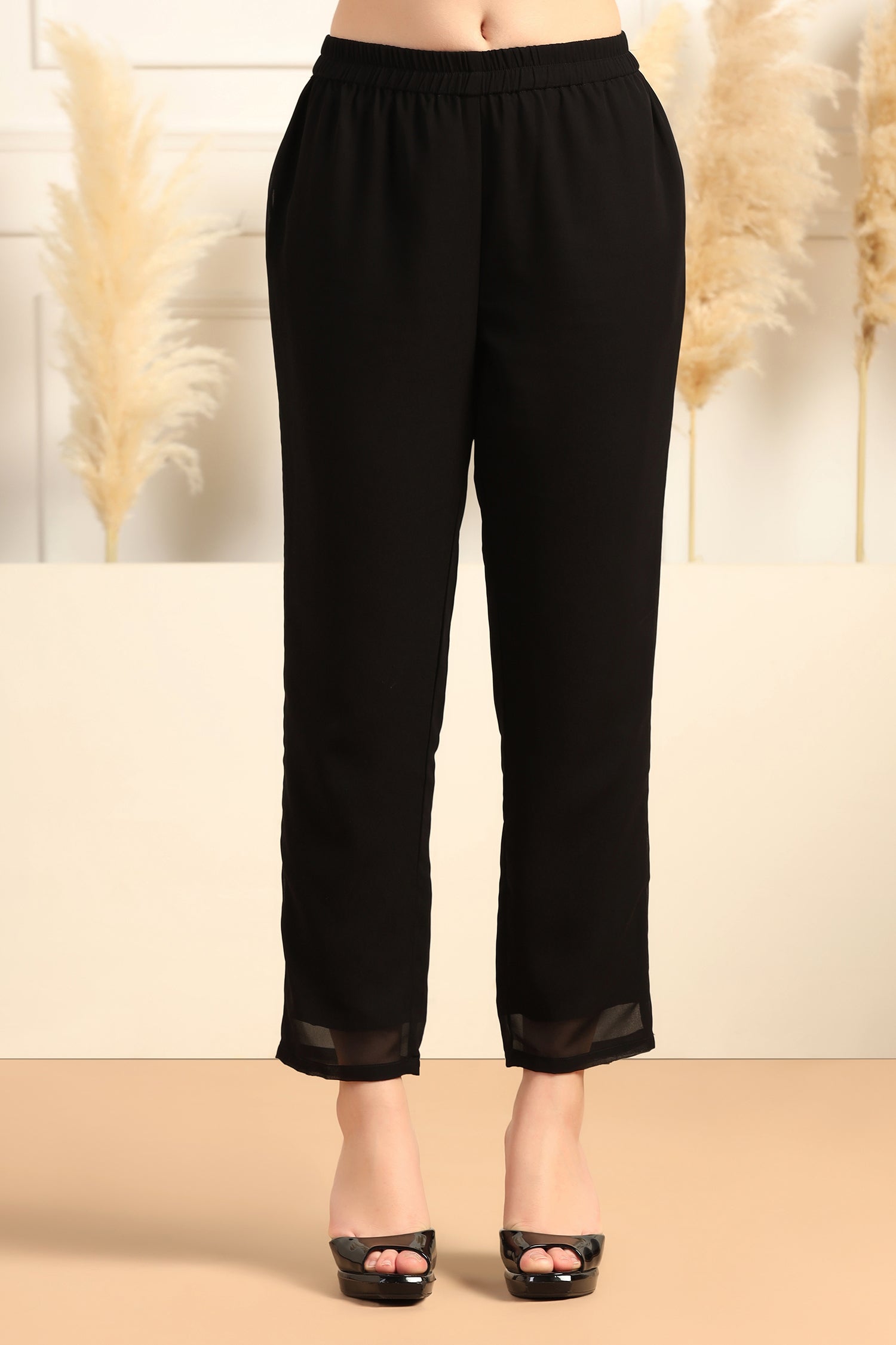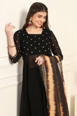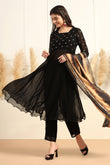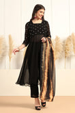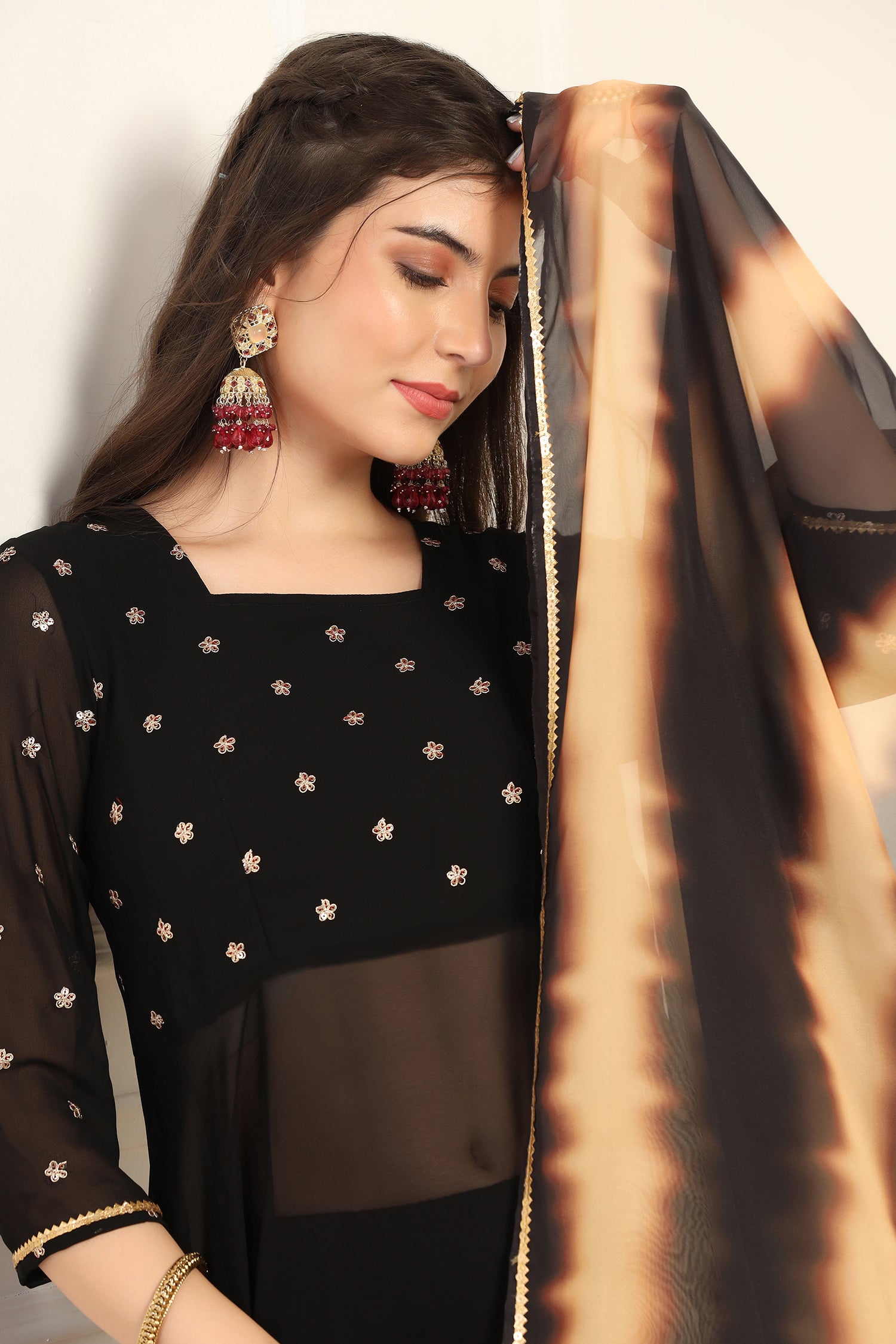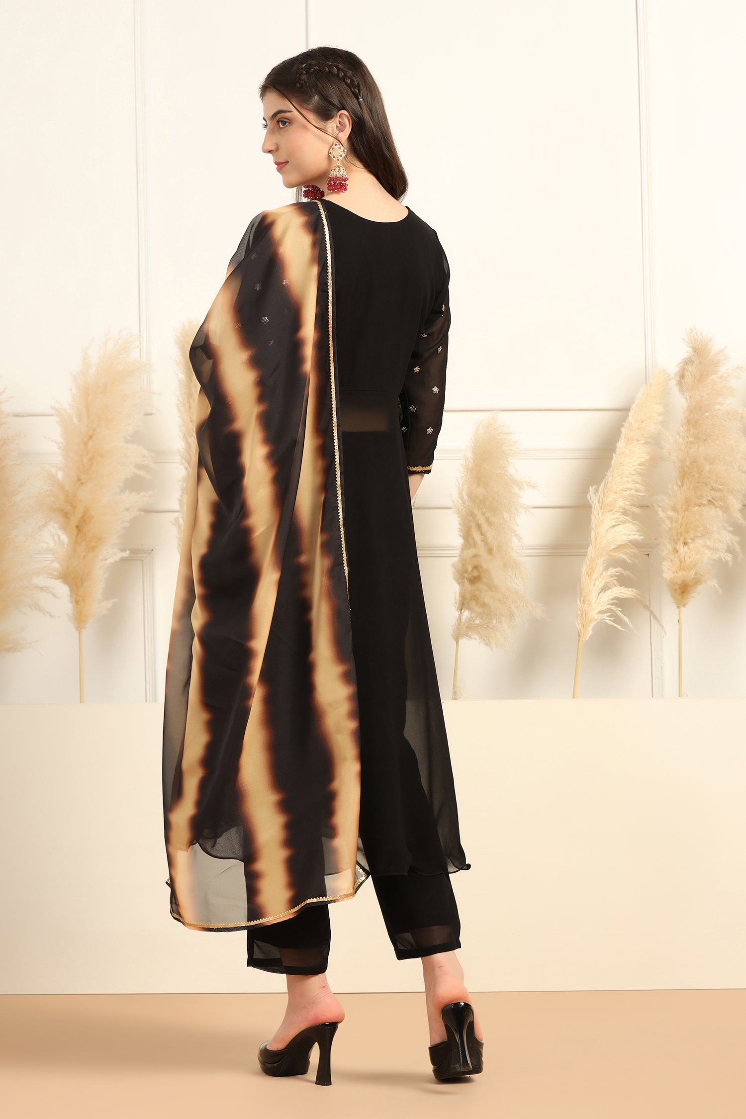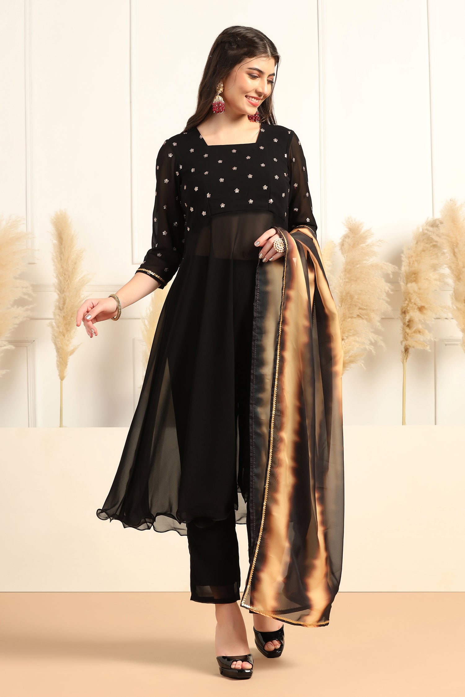 This Kurta and pant set with dupatta completes your look for your special occasions. Elevate your style with this exquisite black solid kurta set, made from Georgette fabric, you'll stay cool and comfortable all day long. The elegant Calf-length kurta features square neck, regular 3/4th sleeves and an intricated embroidered work on yoke which creates a stunning look. It comes with matching pant bottom having partial elasticated waistband. This Kurta and Pant set comes along with dupatta which makes this more beautiful traditional wear for women. Whether you are dressing up for a special occasion or keeping it casual, this kurta pant set for women is a stylish choice. Add some minimal accessories to complete the look and make it truly unforgettable! "Note: The accessories and props used in these photoshoots are for aesthetic purposes only and may not be included in the final product or service.