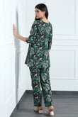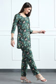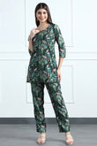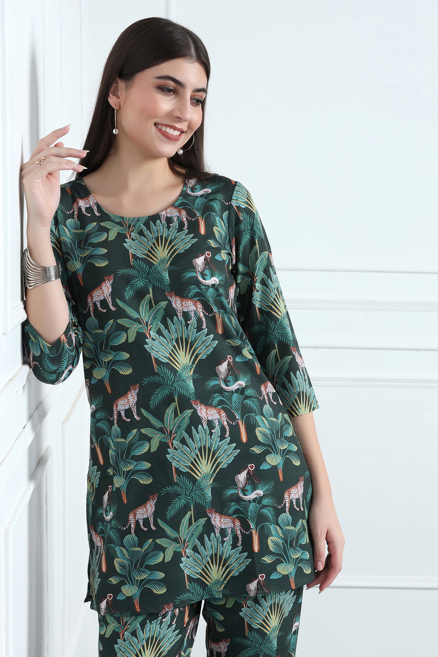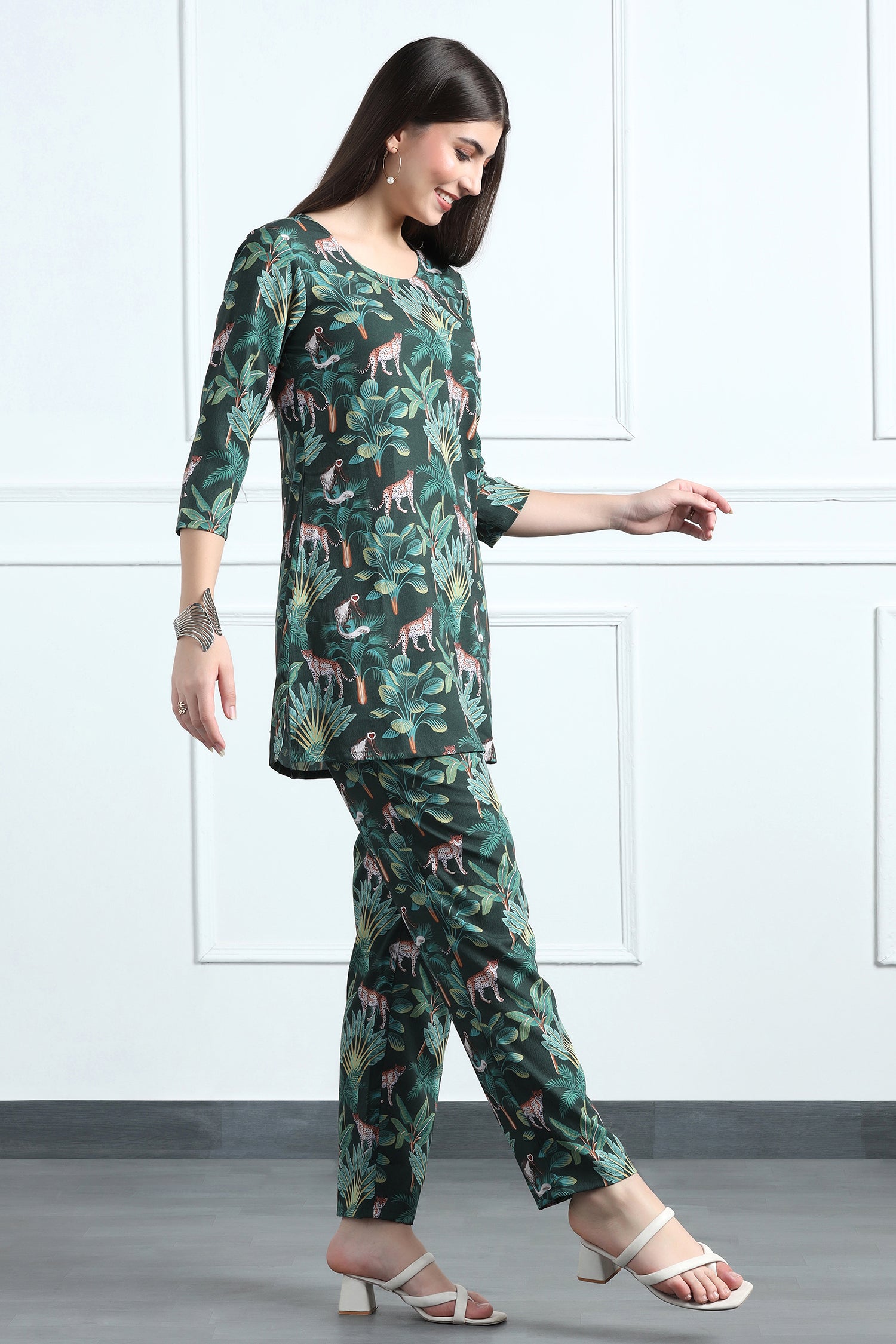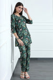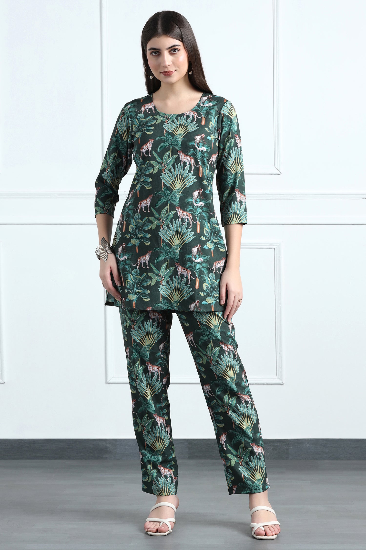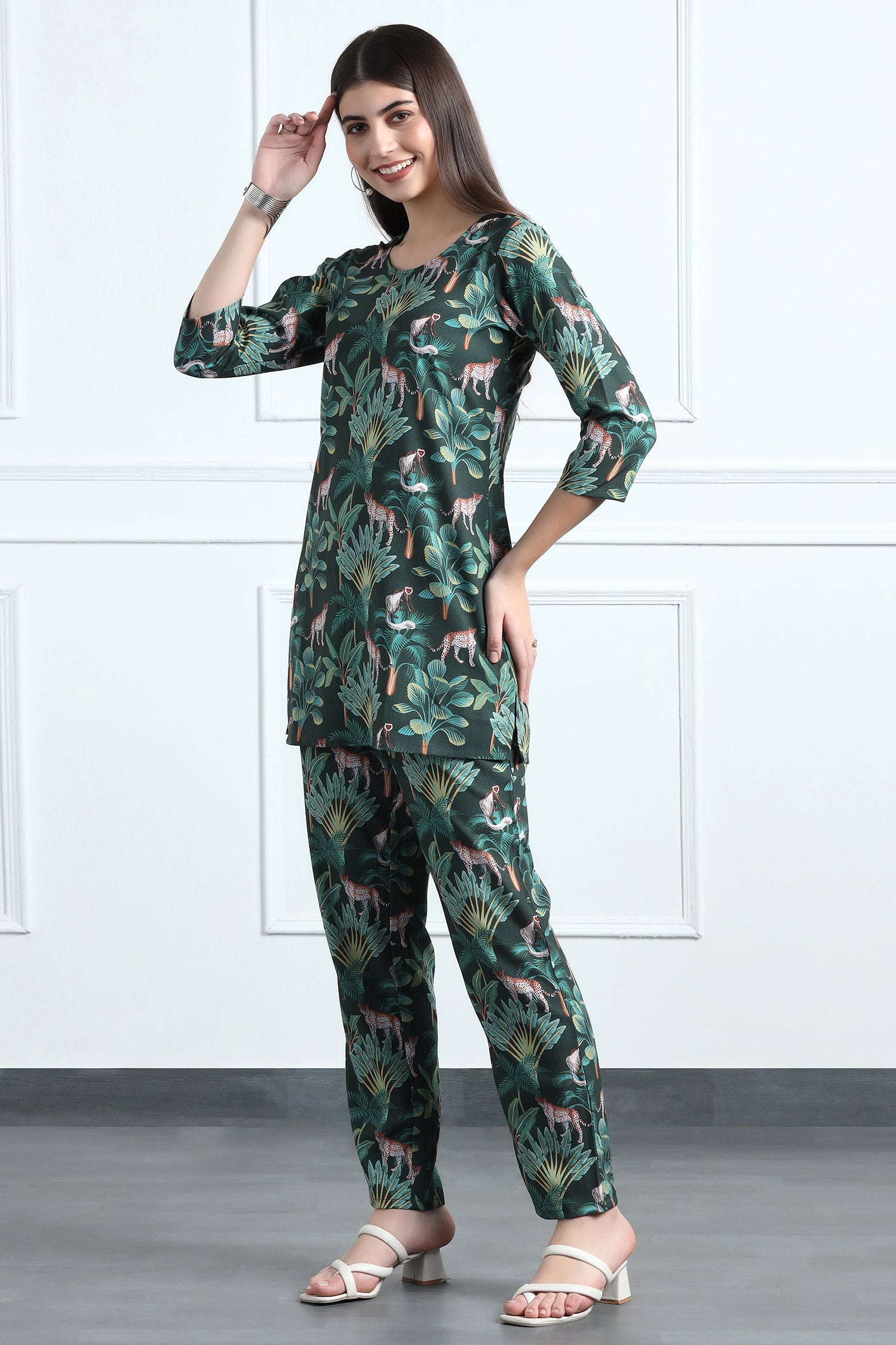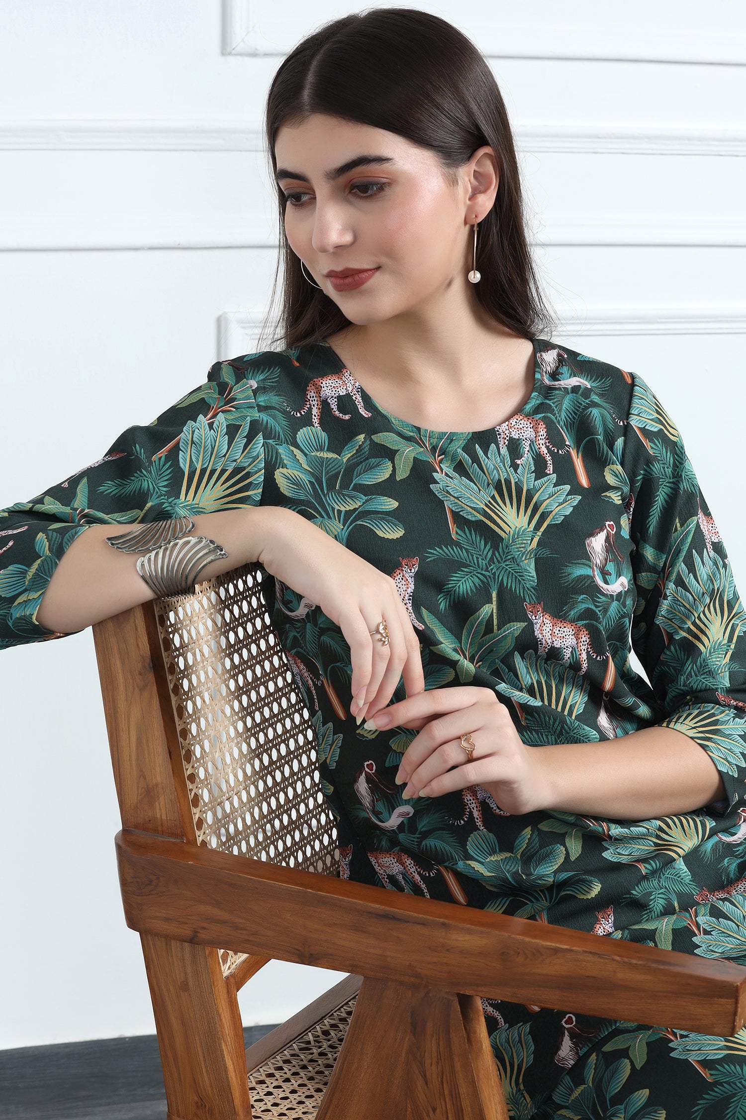 Refresh your wardrobe with this bottle green color clothing set from Fashion Dream. This top and pant set completes your look for your special occasions and celebrations. Get the perfect blend of elegance and comfort with our women's digital printed combo set. This top set for women is crafted from cotton blend fabric, which is lightweight and comfortable to wear, featuring beautiful all over print . The tops for women feature a round neck, 3/4th sleeves and a straight hemline. The top in this set comes with matching pant bottom featuring ankle length, fully elasticated waistband for comfortable fit. Pair it with matching earrings and sandals to complete a casual yet fashionable look. "Note: The accessories and props used in these photoshoots are for aesthetic purposes only and may not be included in the final product or service."