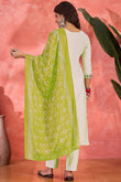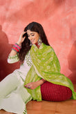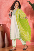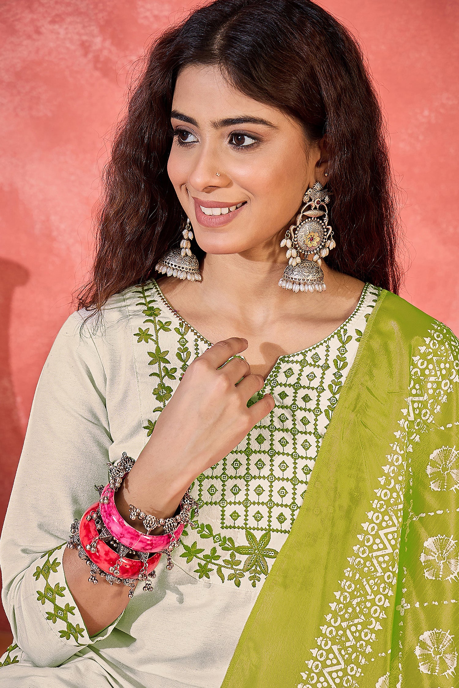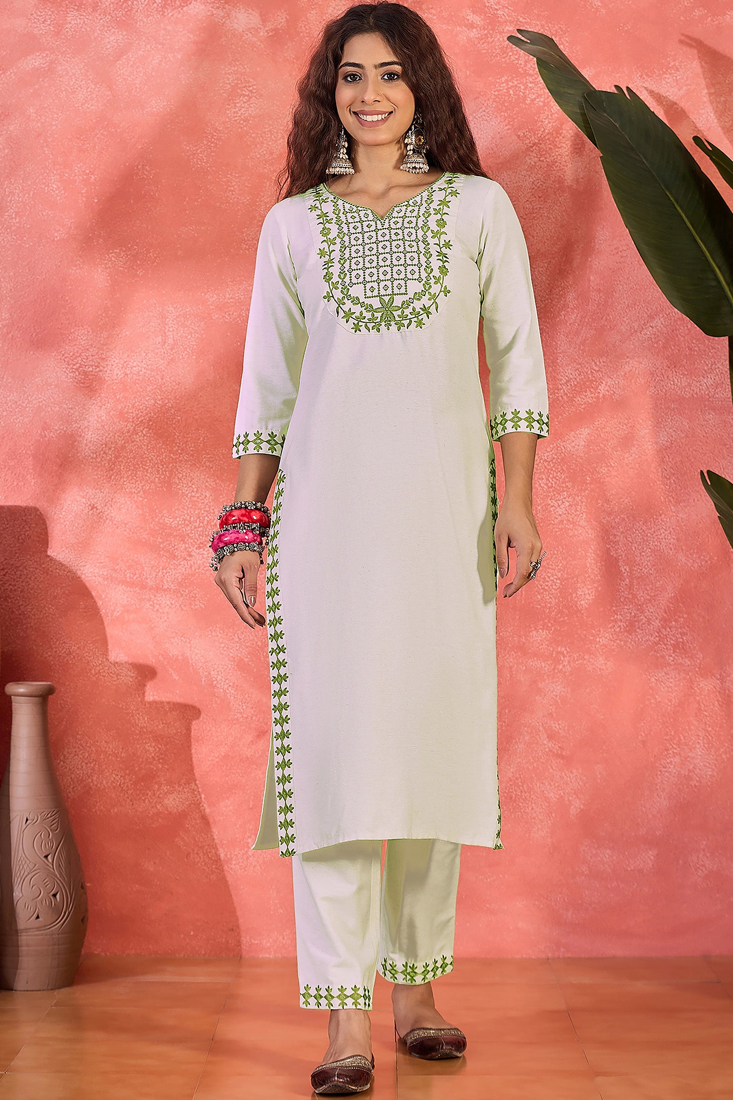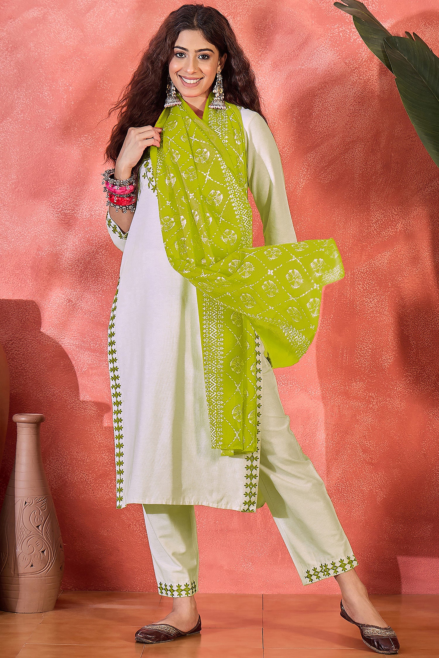 Refresh your wardrobe with this Green colored kurta pant set with dupatta from Jwalin available on Amazon. This set completes your look for your special moments. Elevate your style with this beautiful embroidered kurta set, made from lightweight and breathable cotton fabric, you'll stay cool and comfortable all day long. This elegant straight kurta features 3/4th sleeves, notch neck with intricated embroidered work over yoke and hemline which creates a stunning look. It comes with matching pant bottom having partial elasticated waistband and lace detailing on hemline. This kurta and pant set comes along with printed dupatta which makes this more beautiful traditional wear for women. Whether you are dressing up for a special occasion or keeping it casual, this kurta pant set is a stylish choice. Add some minimal accessories to complete the look and make it truly unforgettable! "Note: The accessories and props used in these photoshoots are for aesthetic purposes only and may not be included in the final product or service”