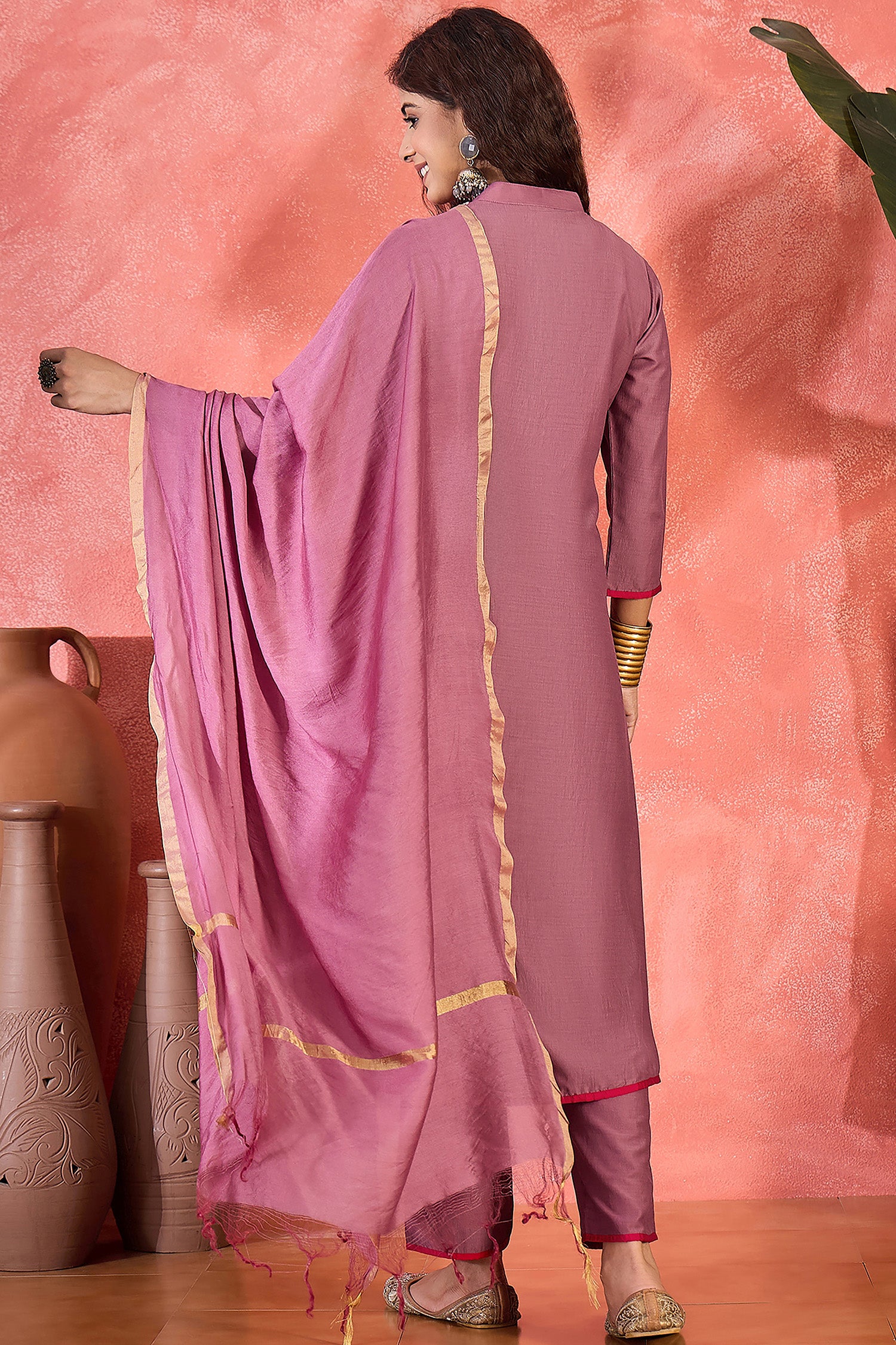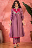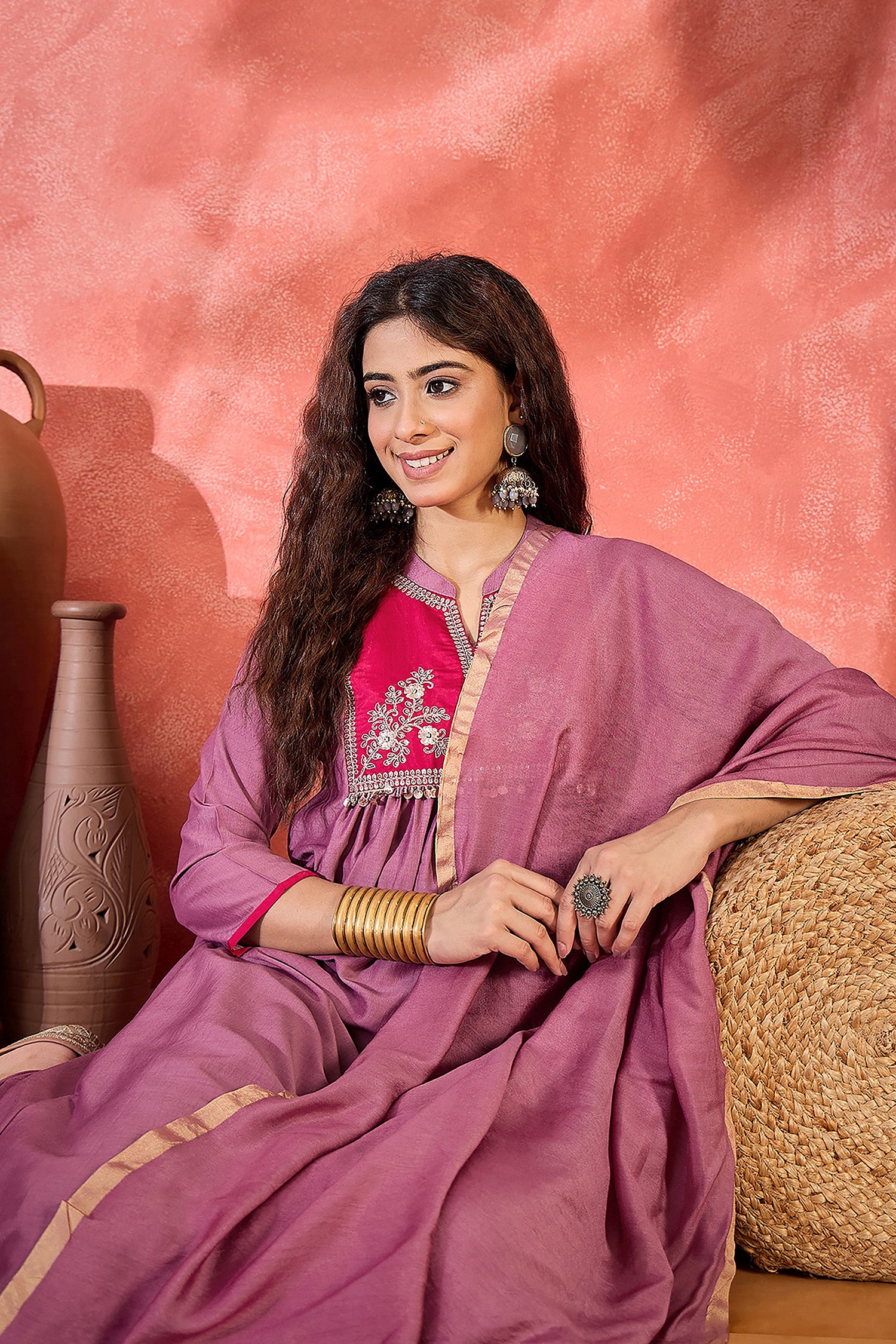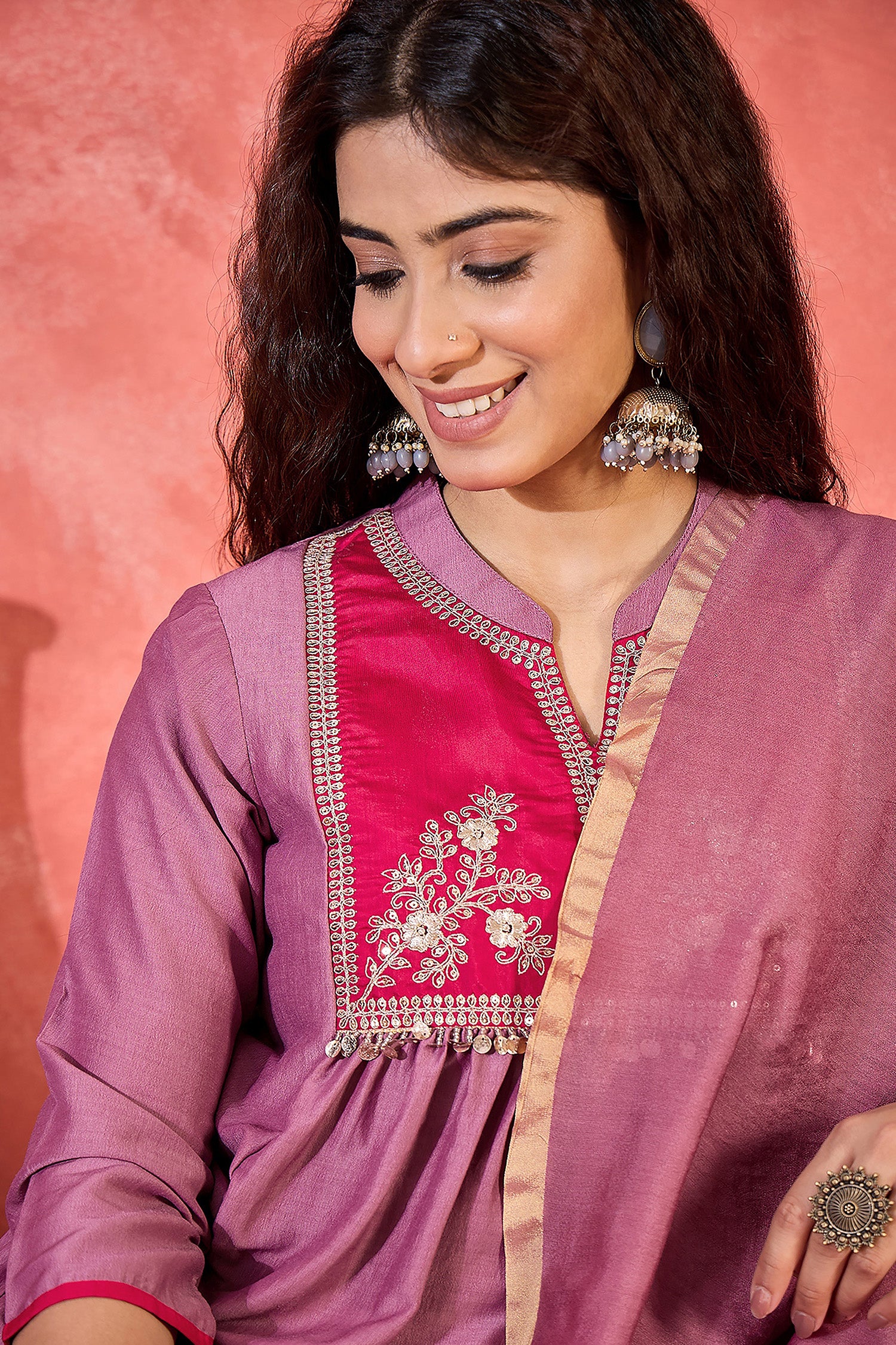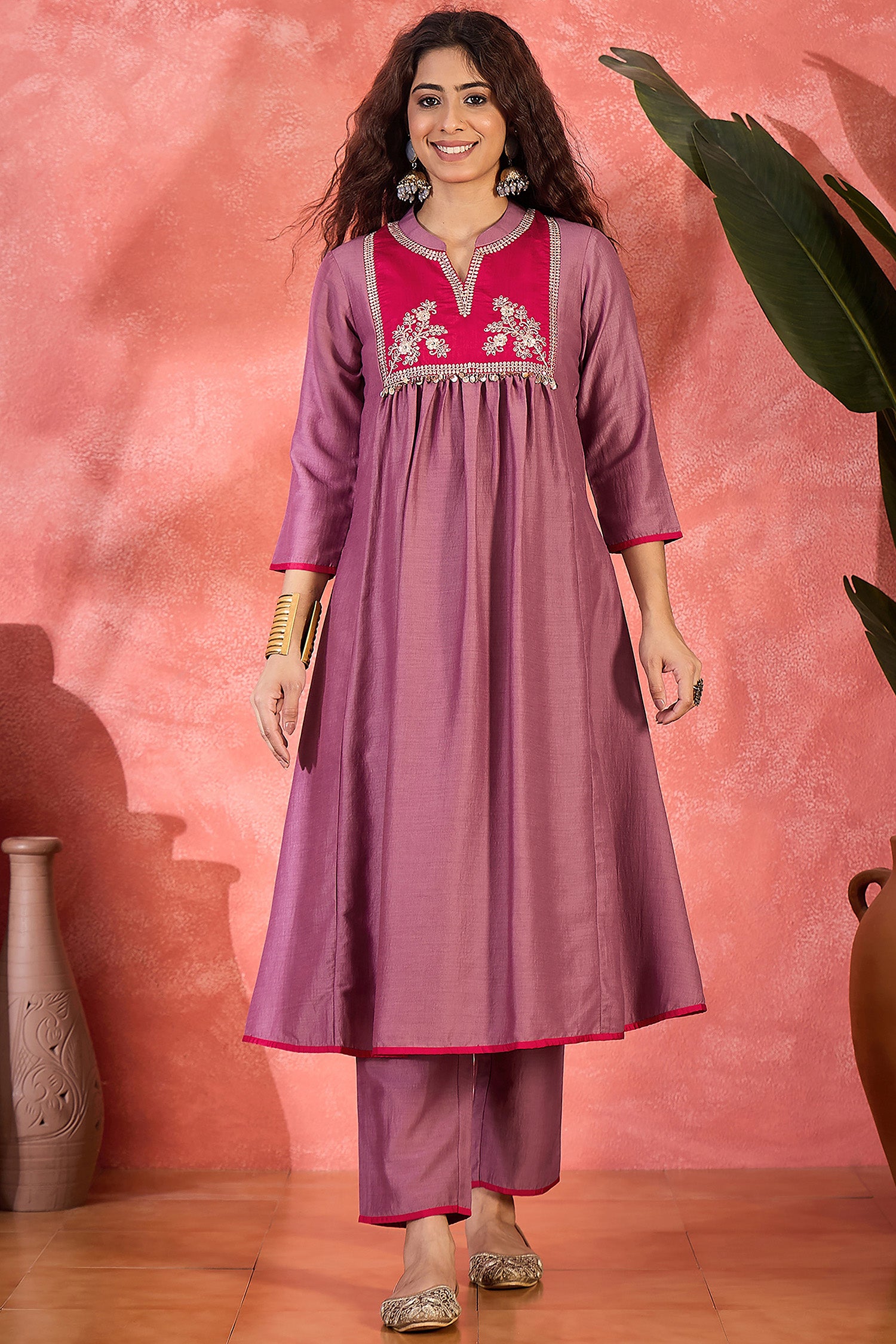 Refresh your wardrobe with this lavender-colored kurta Pant set with dupatta from Fashion dream. This Kurta and pant set with dupatta completes your look for your special occasions. Elevate your style with this exquisite solid kurta set, made from lightweight and breathable chinon fabric, you'll stay cool and comfortable all day long. The elegant ankle-length kurta features a notch neck, regular 3/4th sleeves, gathered pleated and intricated embroidered work on the yoke which creates a stunning look. It comes with matching pant bottom having partial elasticated waistband. This Kurta and Pant set comes along with solid patterned dupatta which makes this more beautiful traditional wear for women. Whether you are dressing up for a special occasion or keeping it casual, this kurta pant set for women is a stylish choice. Add some minimal accessories to complete the look and make it truly unforgettable! "Note: The accessories and props used in these photoshoots are for aesthetic purposes only and may not be included in the final product or service. Women Kurta Set Wedding Outfits For Women Pant Kurta Set Cotton Kurta For Women Kurta Set with Dupatta For Women Suits For Women Wedding Suit For Women Party Suit For Women Kurti Set For Women Salwar & Suit Set Wedding Suit For Women Suit With Dupatta Set Women Kurti Set For Women Salwar & Suit Set Wedding Suit For Women Suit With Dupatta Set
