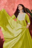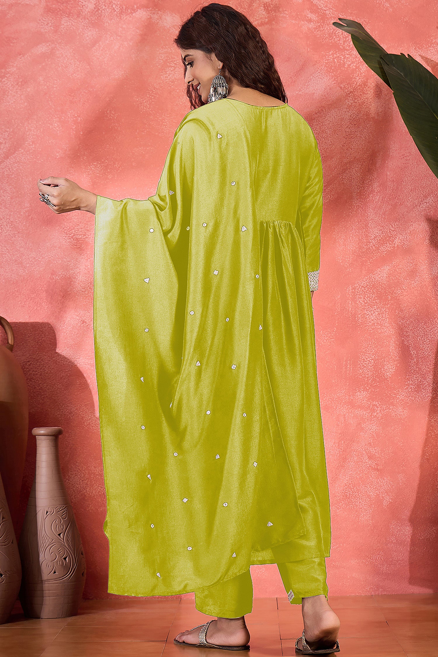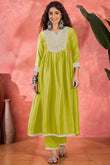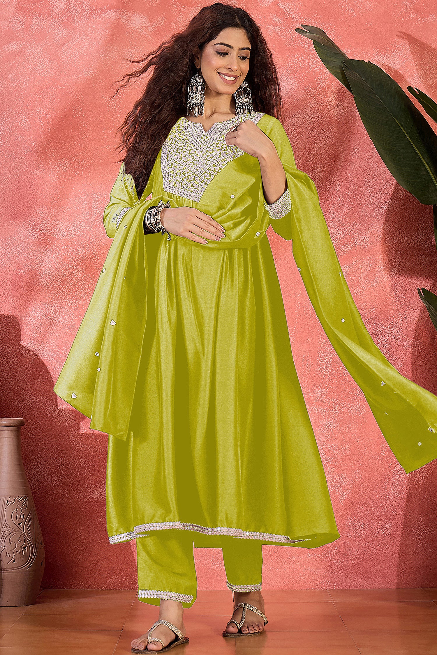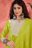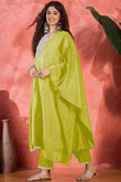 Refresh your wardrobe with this lime colored kurta Pant set with dupatta from Fashion Dream. This kurta and pant set with dupatta completes your look for your special moments. Elevate your style with this exquisite lime embroidery kurta set, made from lightweight and breathable chinnon silk fabric, you'll stay cool and comfortable all day long. The elegant kurta features a notch neck, regular 3/4th sleeves, gathered pleated and intricated embroidered patch work on the yoke which creates a stunning look. It comes with matching pant bottom having partial elasticated waistband. This kurta and pant set comes along with embroidered patterned dupatta which makes this more beautiful traditional wear for women. Whether you are dressing up for a special occasion or keeping it casual, this kurta pant set for women is a stylish choice. Add some minimal accessories to complete the look and make it truly unforgettable! "Note: The accessories and props used in these photoshoots are for aesthetic purposes only and may not be included in the final product or service