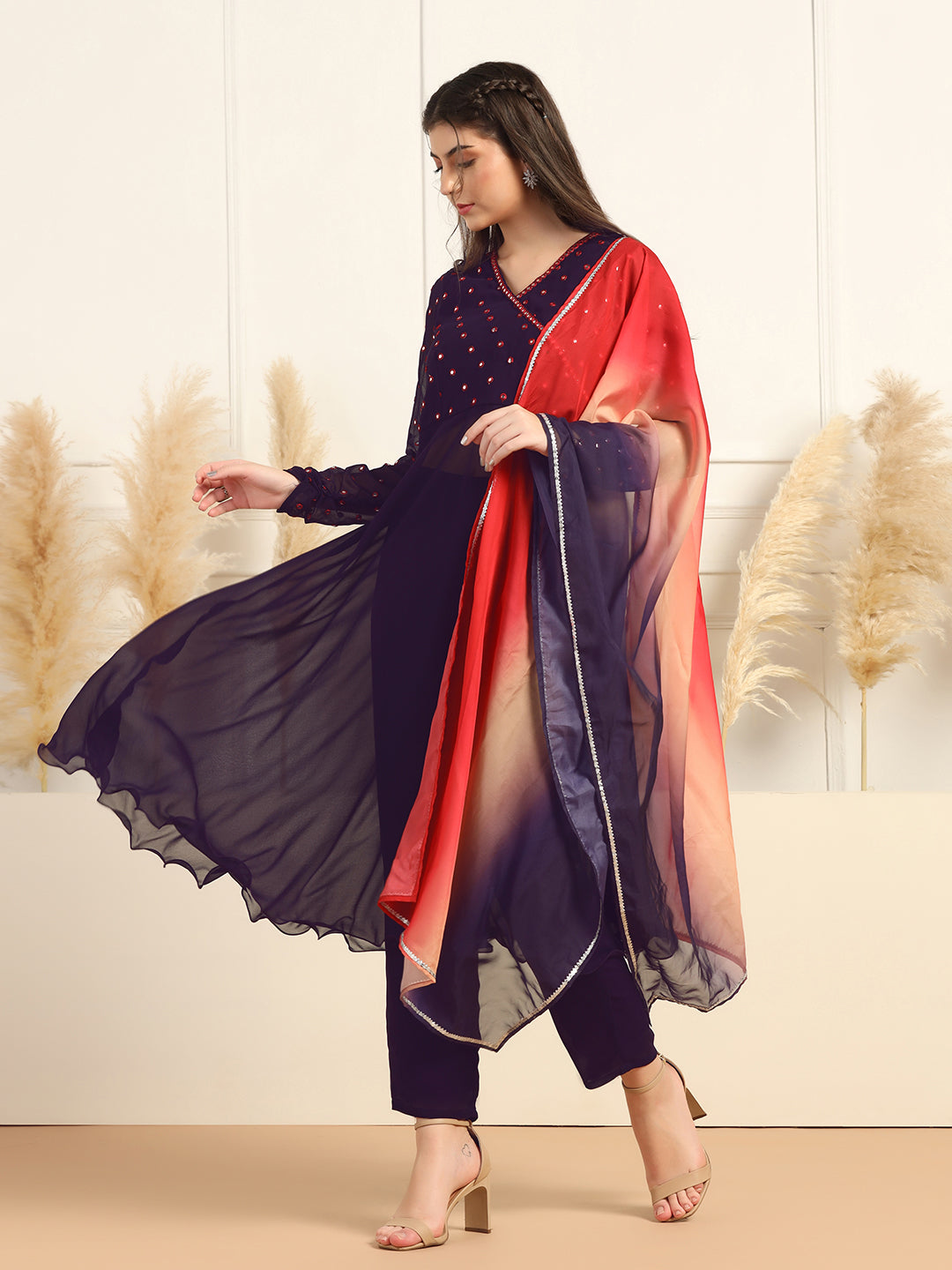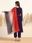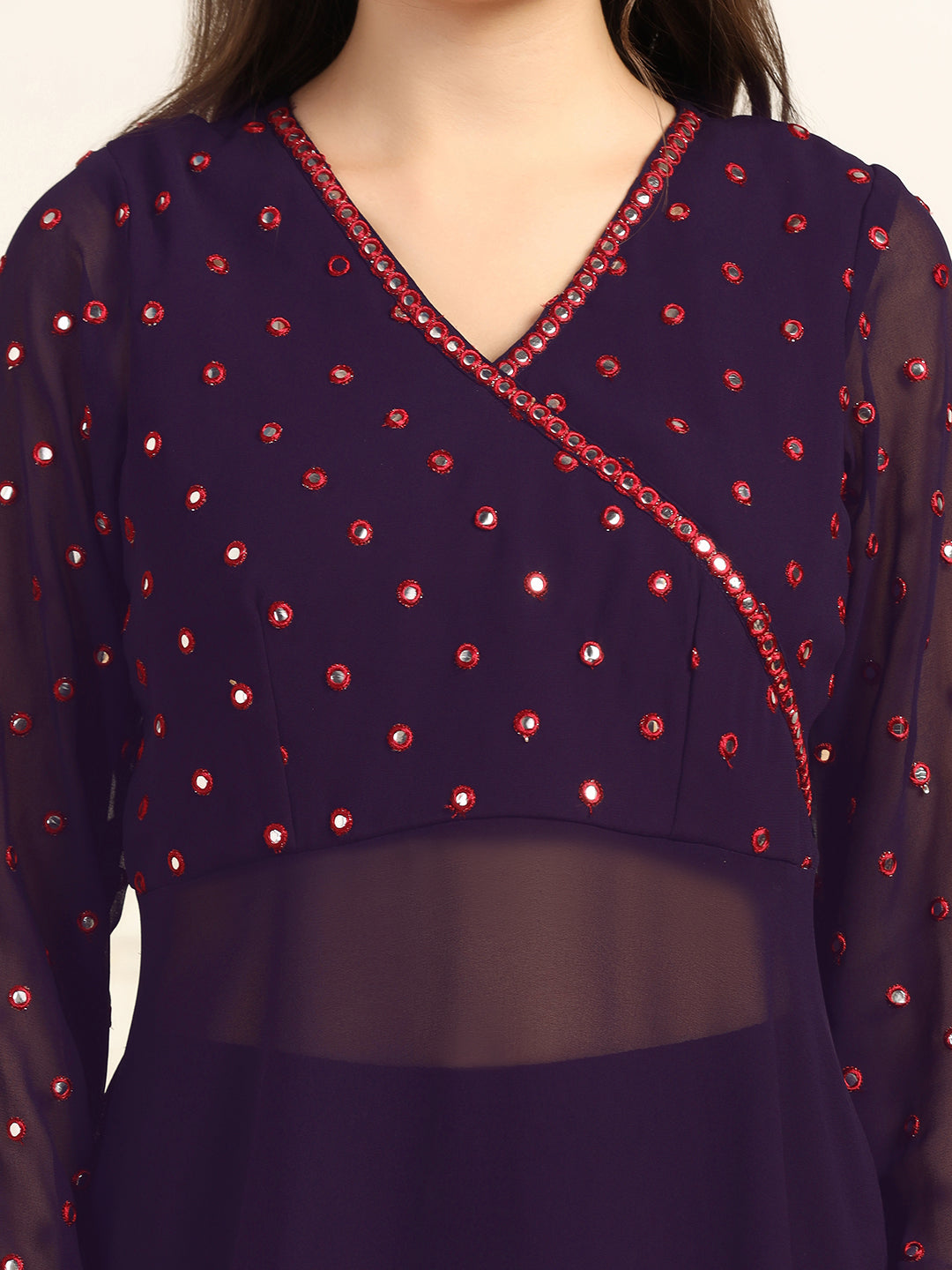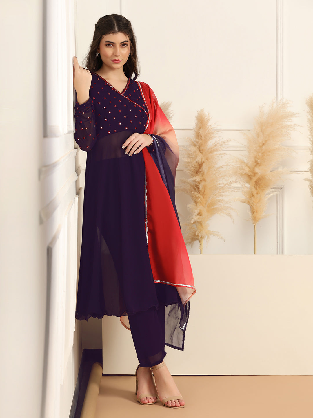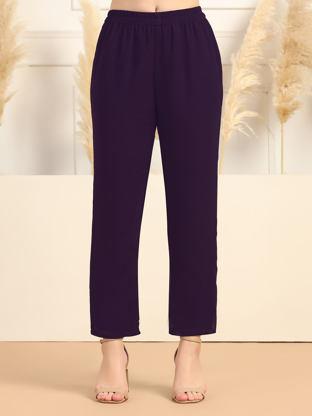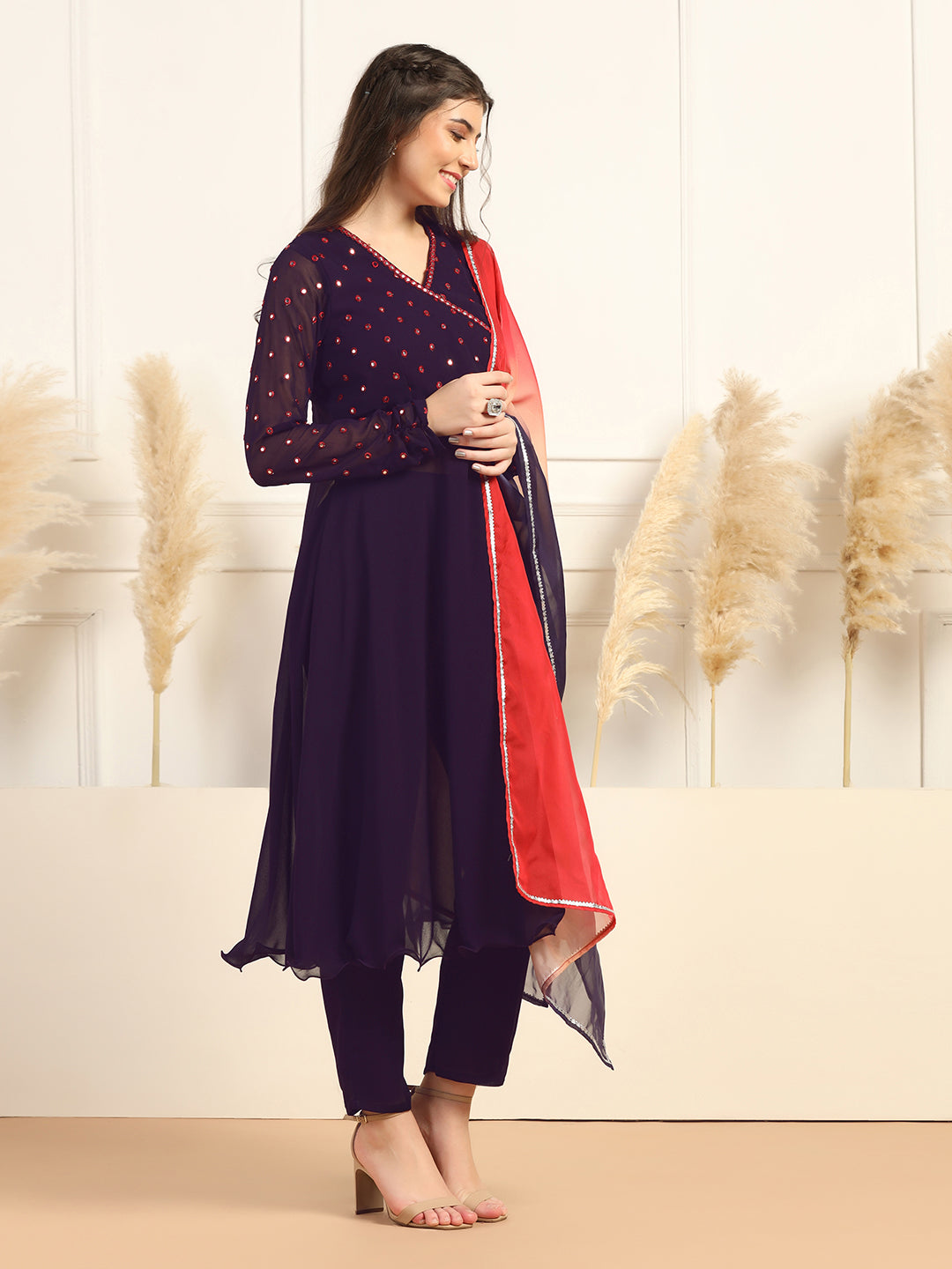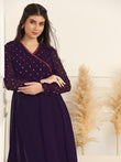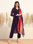 This Kurta and pant set with dupatta completes your look for your special occasions. Elevate your style with this exquisite Violet solid kurta set, made from Georgette fabric, you'll stay cool and comfortable all day long. The elegant Calf-length kurta features V- neck, regular Full sleeves and an intricated embroidered work on yoke which creates a stunning look. It comes with matching pant bottom having fully elasticated waistband. This Kurta and Pant set comes along with dupatta which makes this more beautiful traditional wear for women. Whether you are dressing up for a special occasion or keeping it casual, this kurta pant set for women is a stylish choice. Add some minimal accessories to complete the look and make it truly unforgettable! "Note: The accessories and props used in these photoshoots are for aesthetic purposes only and may not be included in the final product or service.