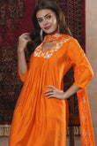 Womens Orange Chinon Silk Embroidered Kurta Set with Dupatta