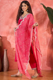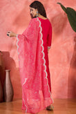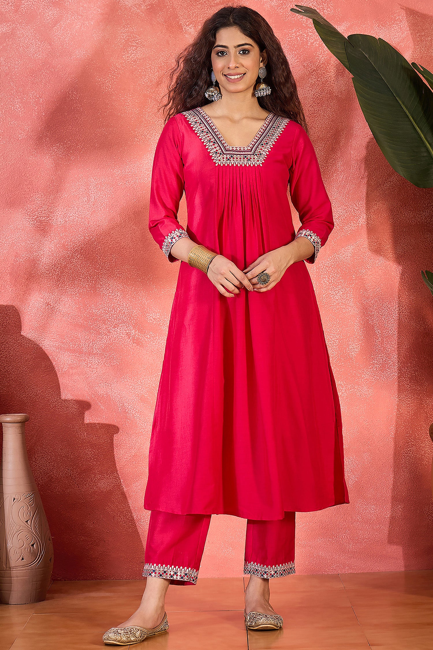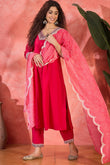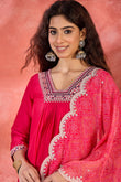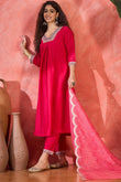 Refresh your wardrobe with this beautiful pink colored Kurta and Pant set with Dupatta from Fashion dream. This kurta and pant set is crafted from lightweight and breathable Chinon Silk fabric to give you soft, elegant drape and a rich feel. This solid Kurta features V-neck, 3/4 sleeves, gathered at the front and lace detailing over neckline and hemline. It comes along with matching solid pants having partial elasticated waistband along embroidery work over hem and side pockets. This set also include printed dupatta with lace detailing over hemline to make it a complete choice for traditional wear. Pair it with some minimal accessories and ethnic foot wears for cozy and stylish look. "Note: The accessories and props used in these photoshoots are for aesthetic purposes only and may not be included in the final product or service."