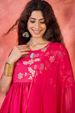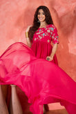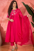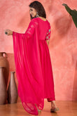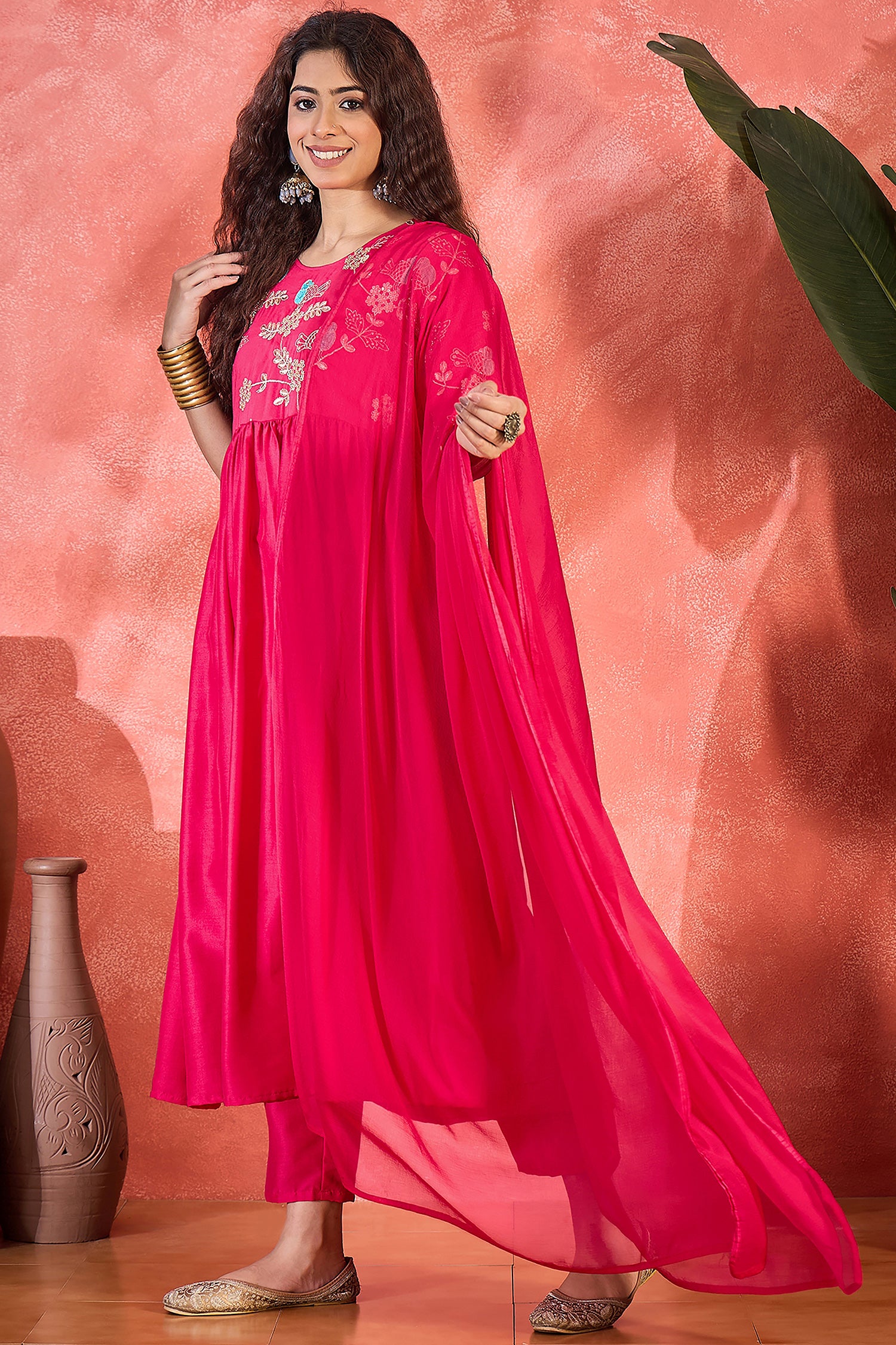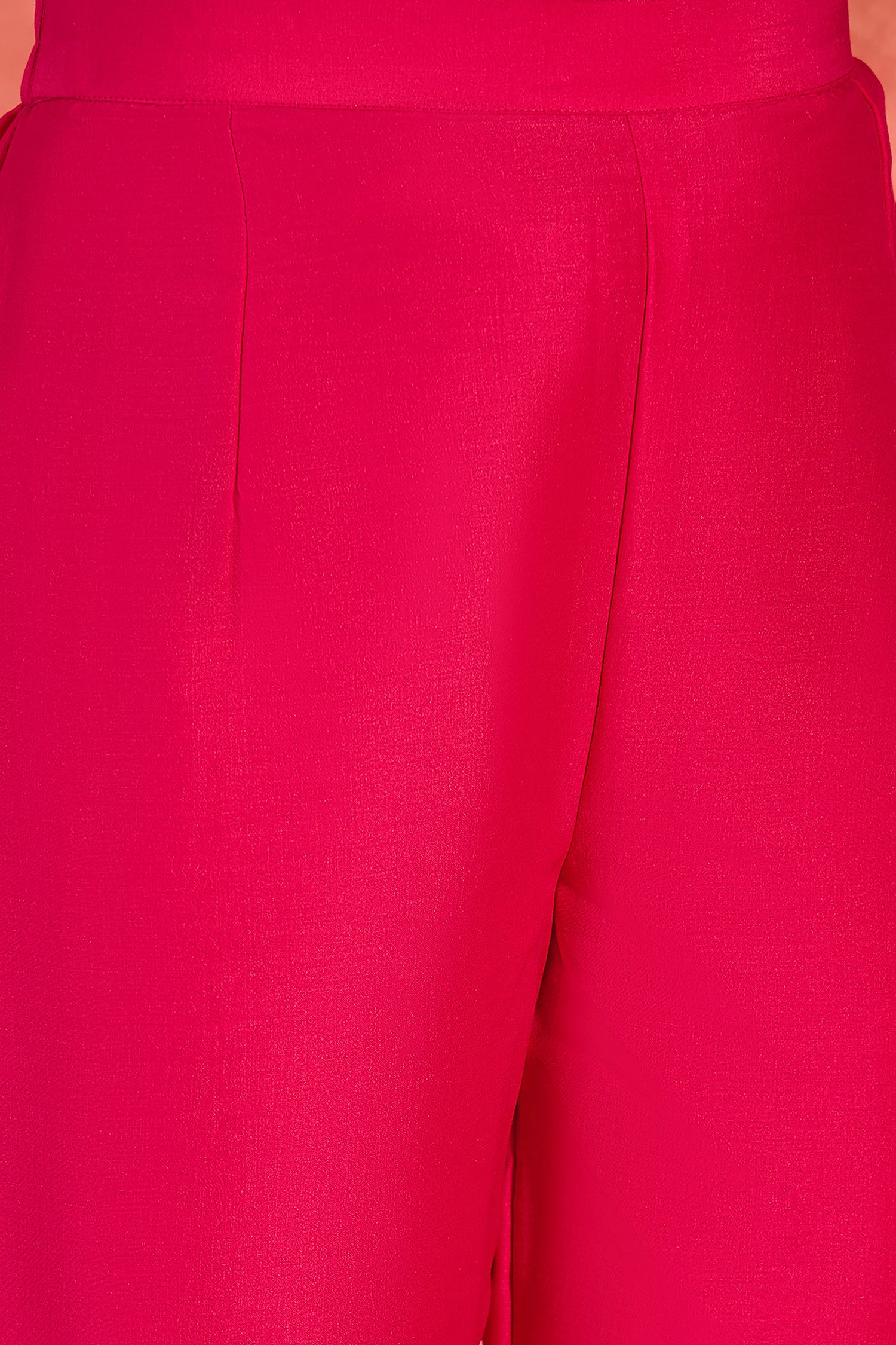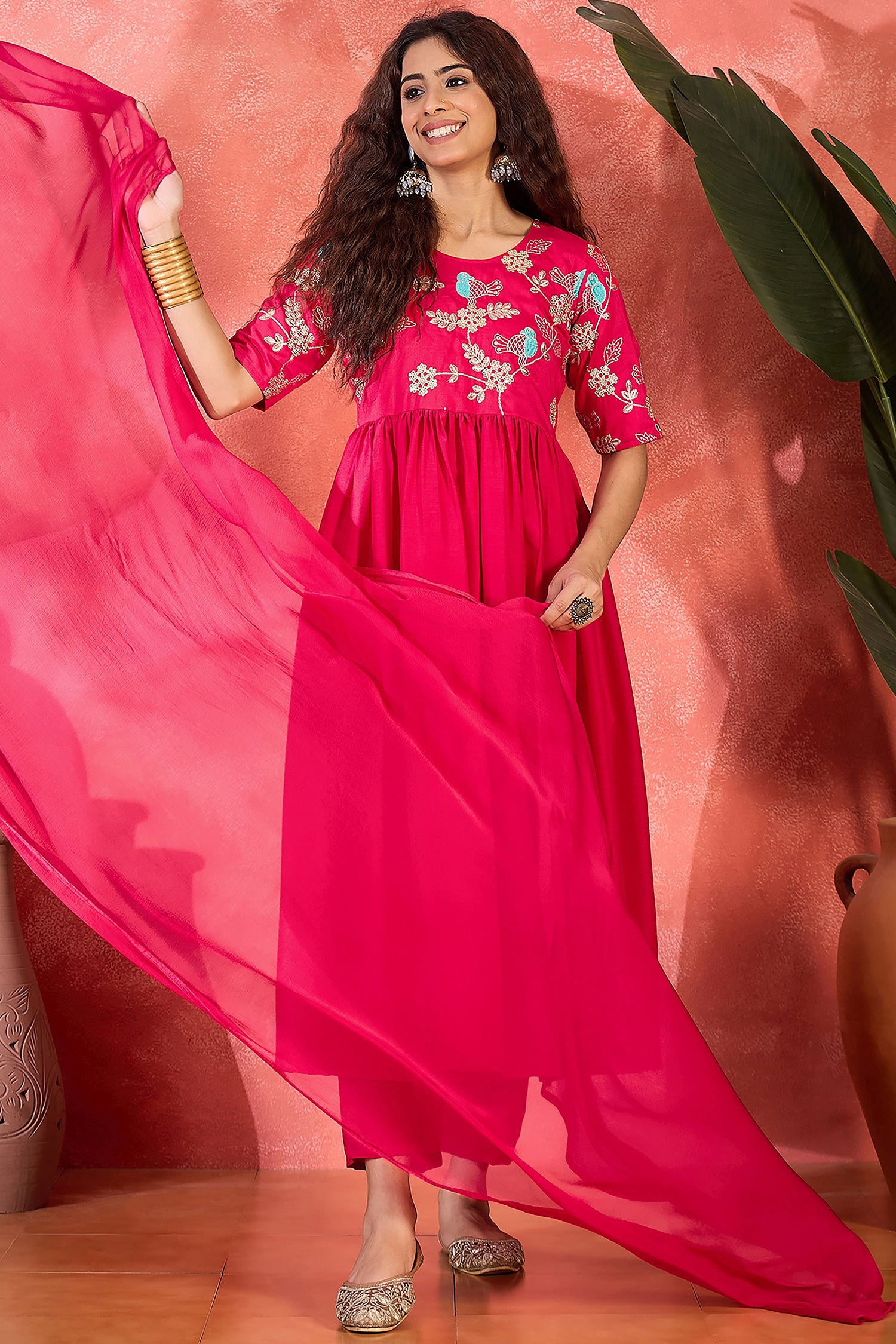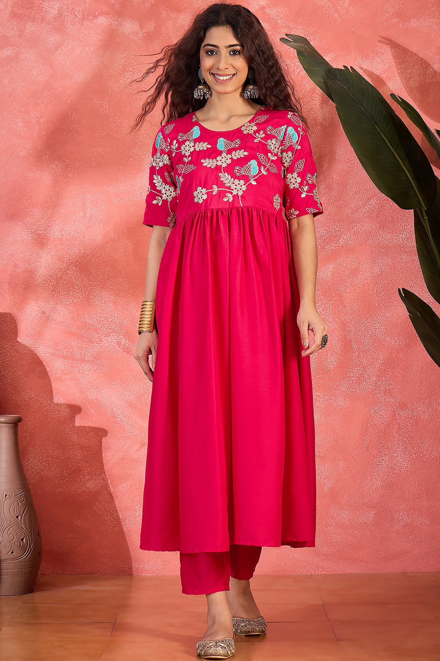 Refresh your wardrobe with this Pink colored Kurta Pant set with dupatta from Fashion Dream. This Kurta and pant set completes your look for your special occasions. Elevate your style with this exquisite red embroidered kurta set,made from lightweight and breathable cotton blend fabric, you'll stay cool and comfortable all day long. This elegant calf-length kurta features a round neck, half sleeves, gathered and embroidered work which creates a stunning look. It comes with matching pant bottom having partial elasticated waistband. This Kurta and Pant set comes along with solid dupatta which makes this more beautiful traditional wear for women. Whether you are dressing up for a special occasion or keeping it casual, this kurta pant set for women is a stylish choice. Add some minimal accessories to complete the look and make it truly unforgettable. "Note: The accessories and props used in these photoshoots are for aesthetic purposes only and may not be included in the final product or service