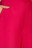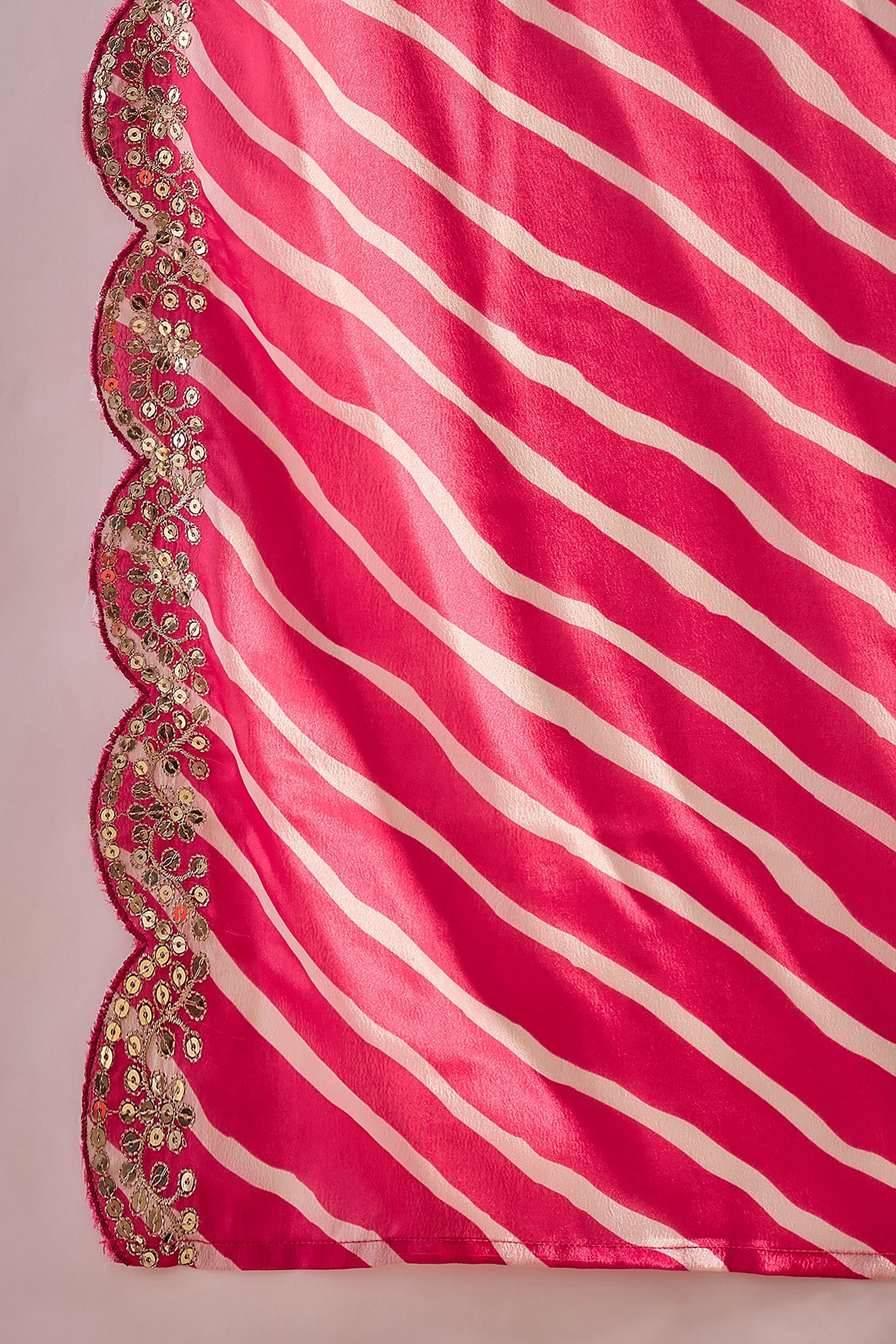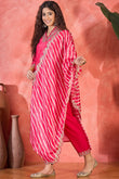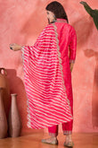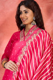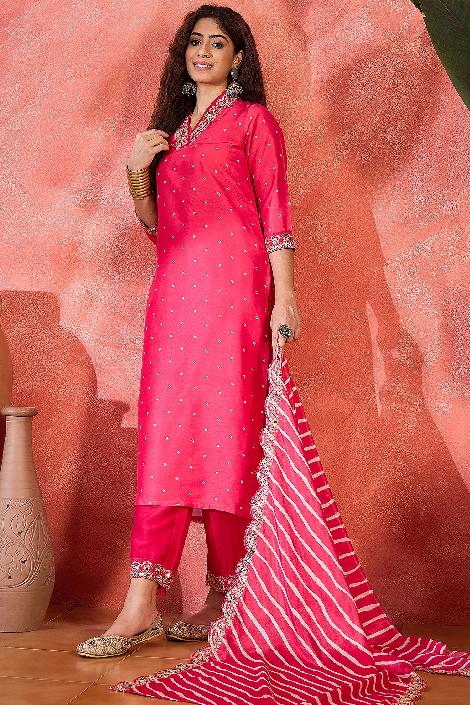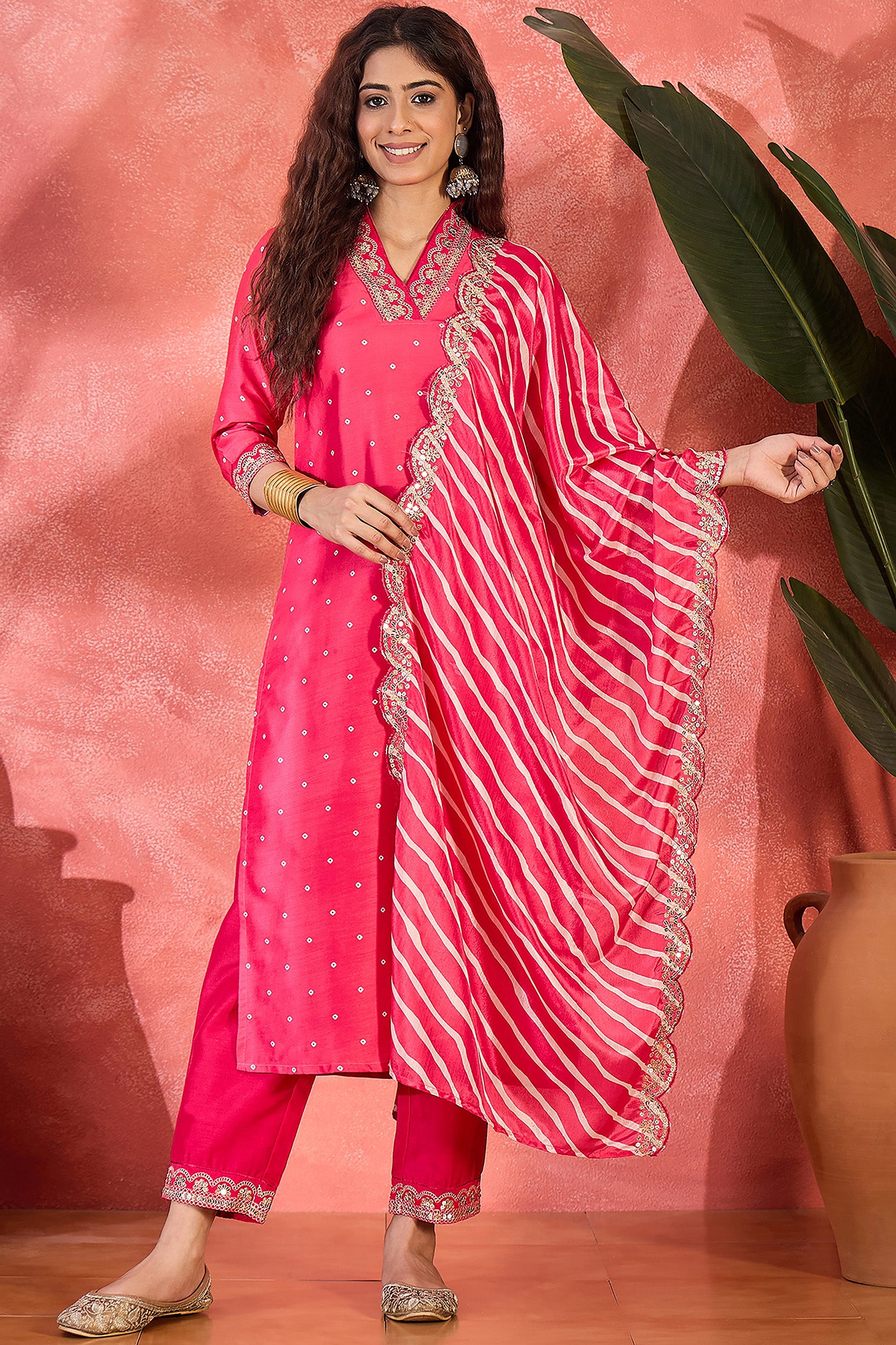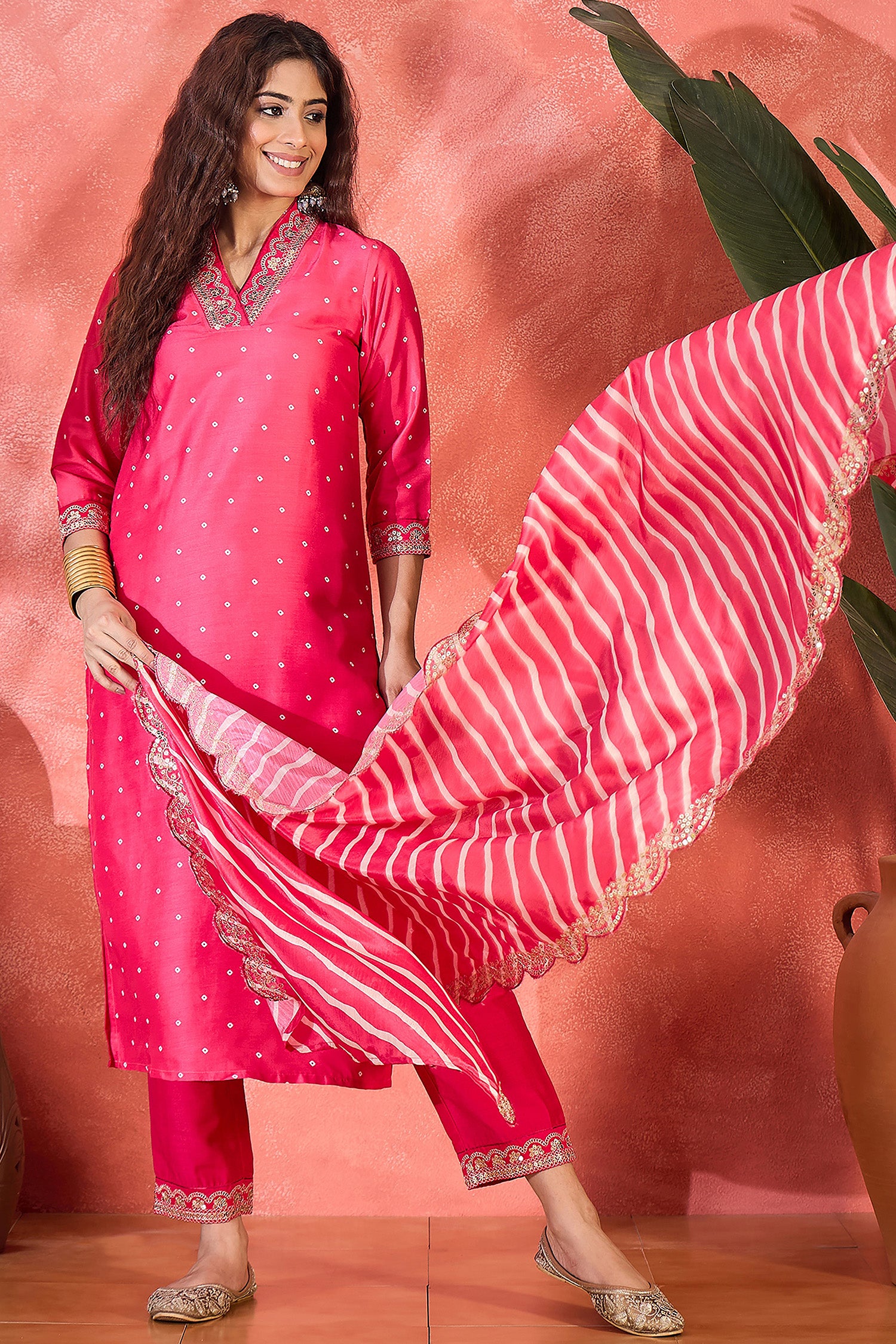Refresh your wardrobe with this rani colored kurta pant set with dupatta from Fashion dream. This set completes your look for your special moments. Elevate your style with this beautiful bandhani printed kurta set, made from lightweight and breathable chinon silk fabric, you'll stay cool and comfortable all day long. This elegant kurta features a V-neck, 3/4th sleeves with lace detailing, intricated embroidered at neckline and hemline which creates a stunning look. It comes with matching pant bottom having partial elasticated waistband and lace detailing at hemline. This kurta and pant set comes along with leheriya printed dupatta with lace detailing which makes this more beautiful traditional wear for women. Whether you are dressing up for a special occasion or keeping it casual, this kurta pant set is a stylish choice. Add some minimal accessories to complete the look and make it truly unforgettable! "Note: The accessories and props used in these photoshoots are for aesthetic purposes only and may not be included in the final product or service”