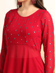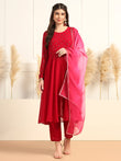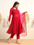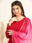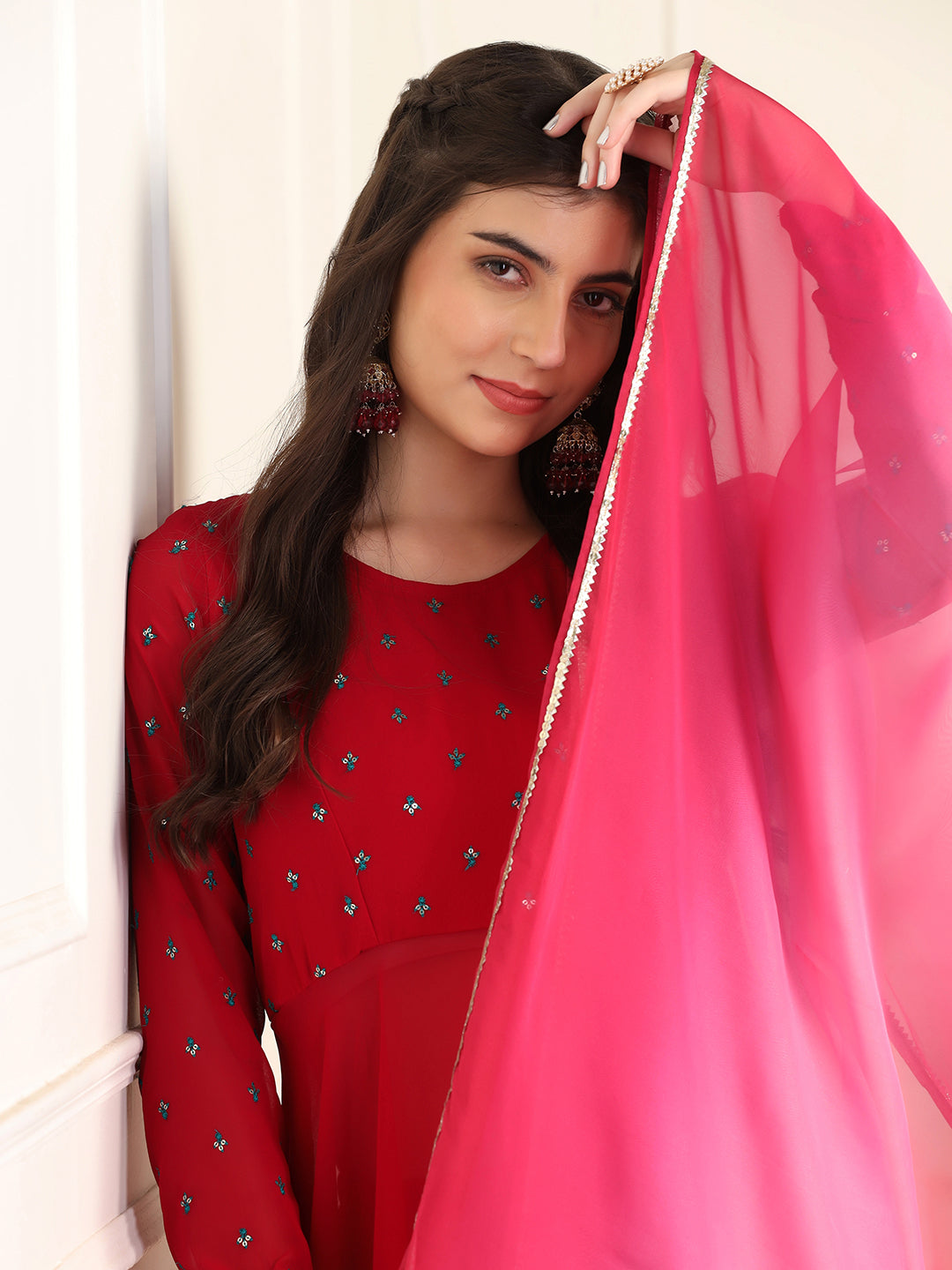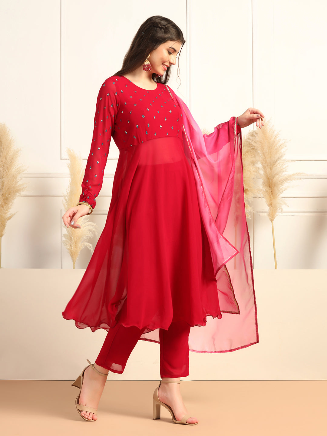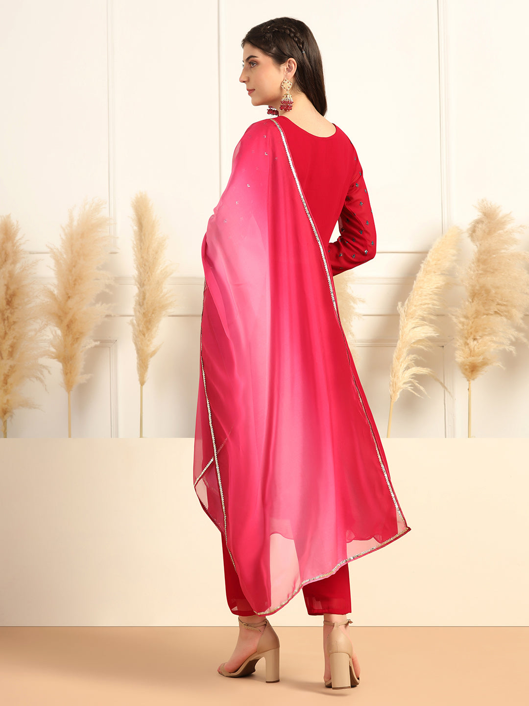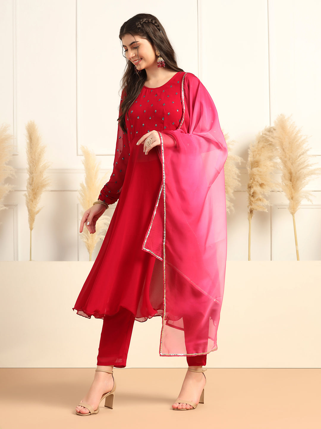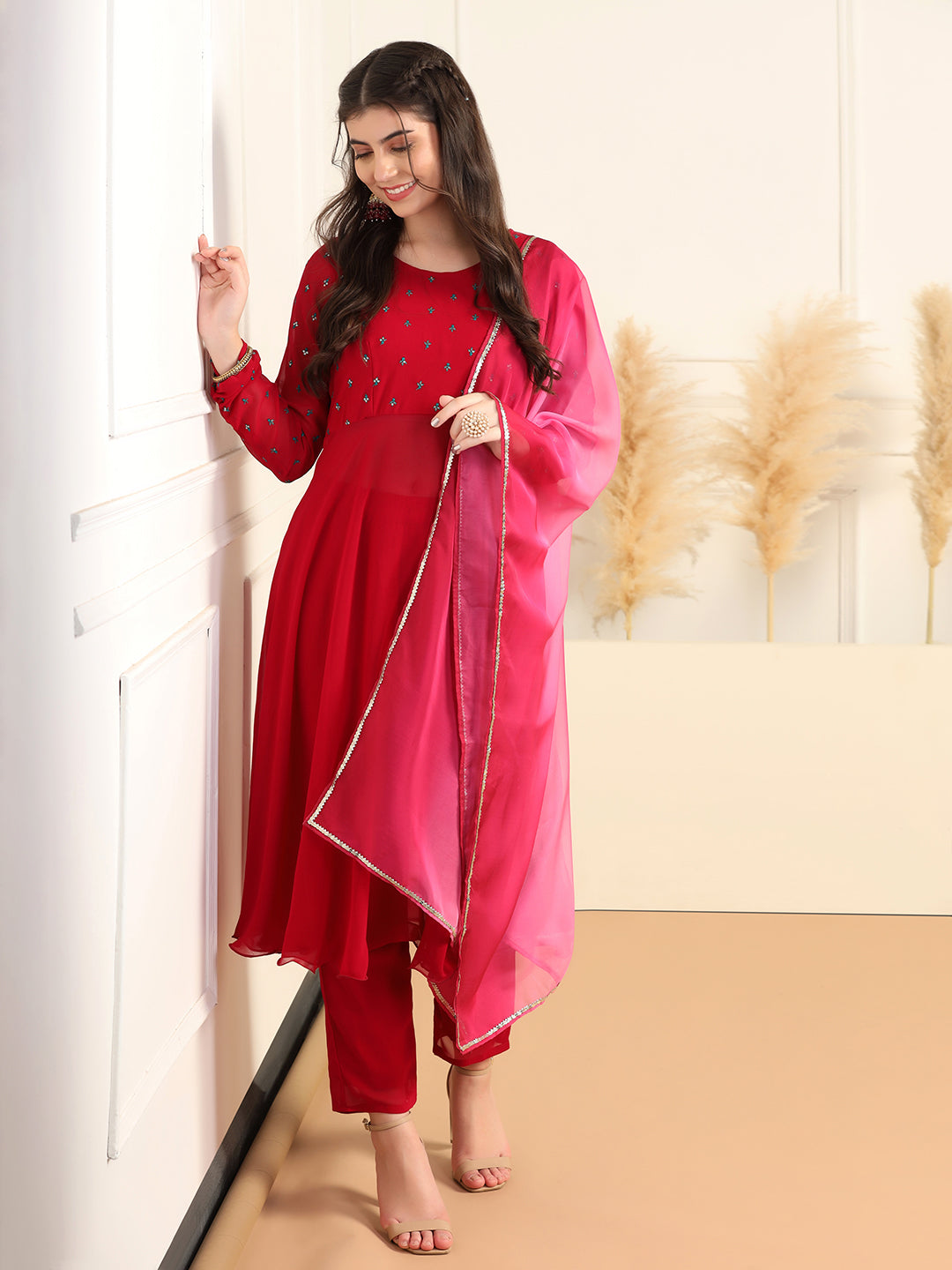 This Kurta and pant set with dupatta completes your look for your special occasions. Elevate your style with this exquisite rani solid kurta set, made from Georgette fabric, you'll stay cool and comfortable all day long. The elegant Calf-length kurta features round neck, long sleeves, intricated embroidered patch work which creates a stunning look. It comes with matching pant bottom having partial elasticated waistband. This Kurta and Pant set comes along with solid dupatta which makes this more beautiful traditional wear for women. Whether you are dressing up for a special occasion or keeping it casual, this kurta pant set for women is a stylish choice. Add some minimal accessories to complete the look and make it truly unforgettable! "Note: The accessories and props used in these photoshoots are for aesthetic purposes only and may not be included in the final product o