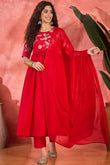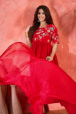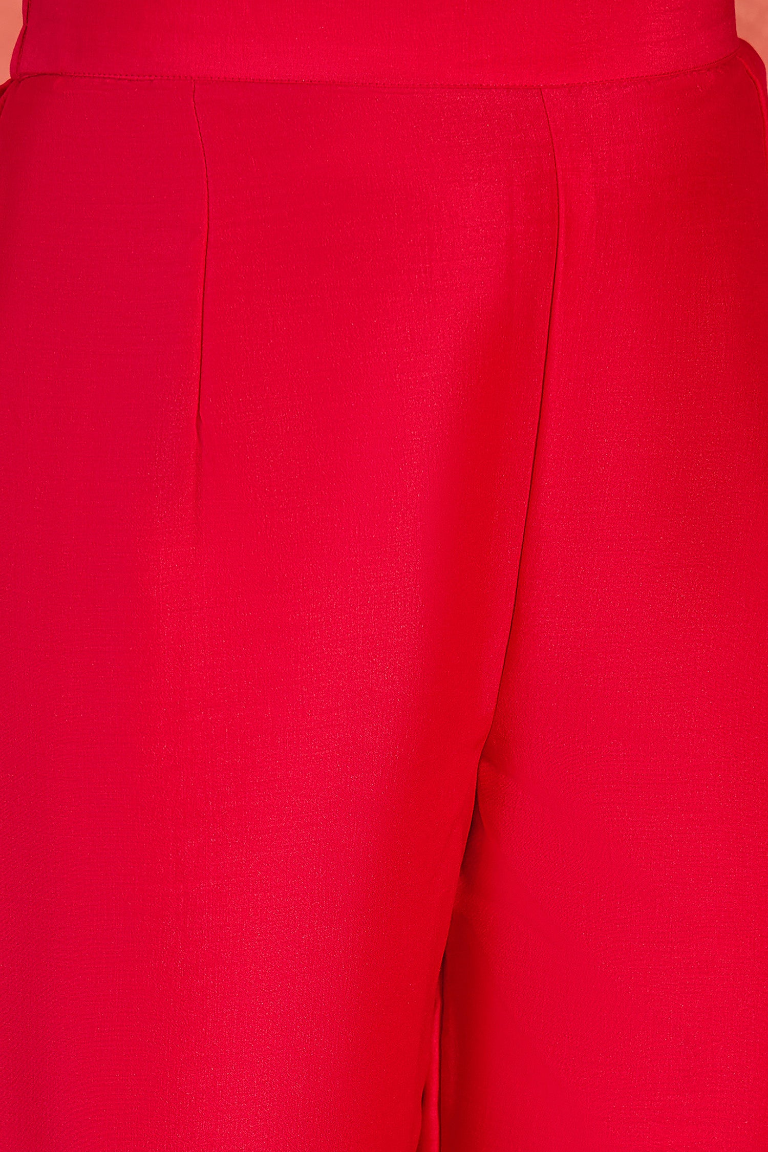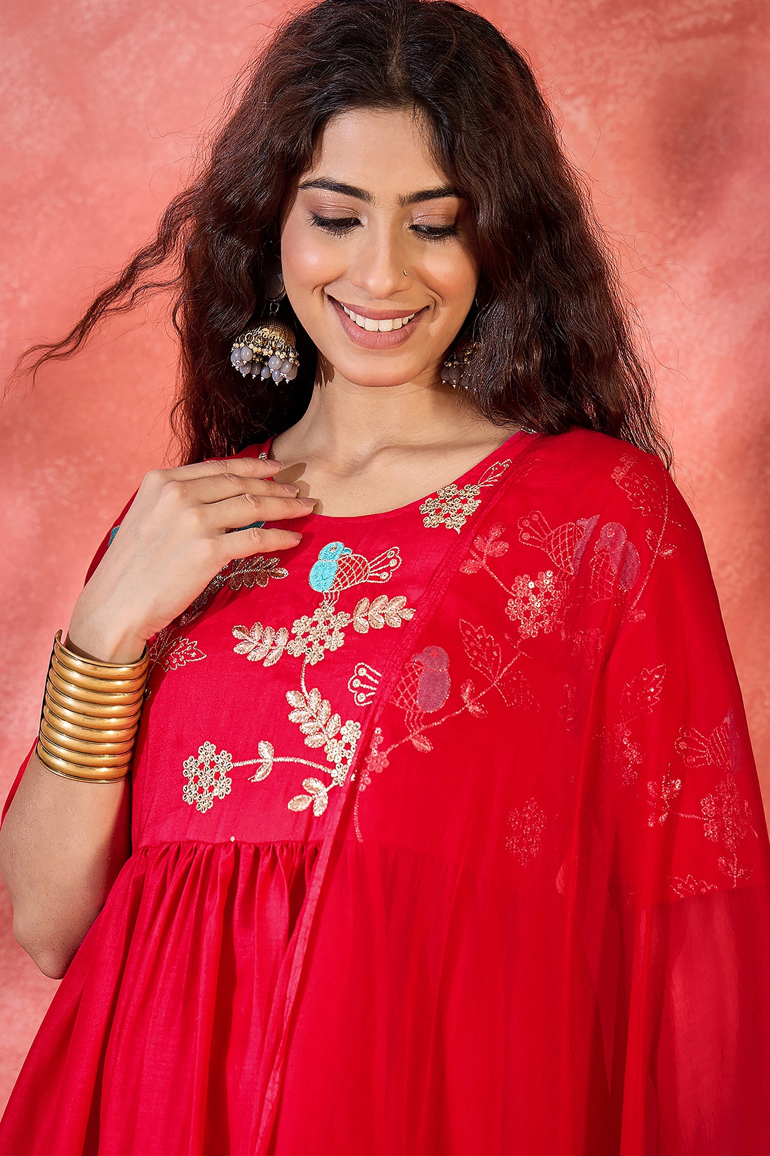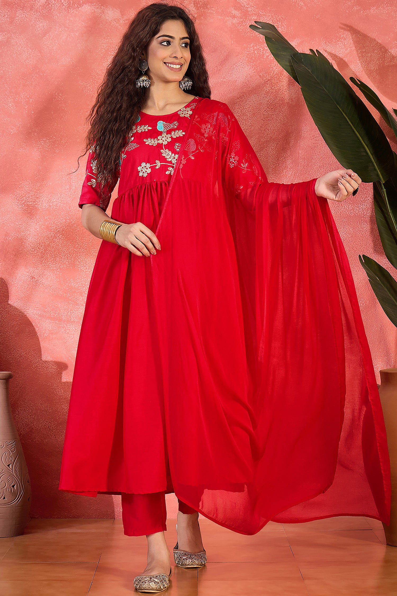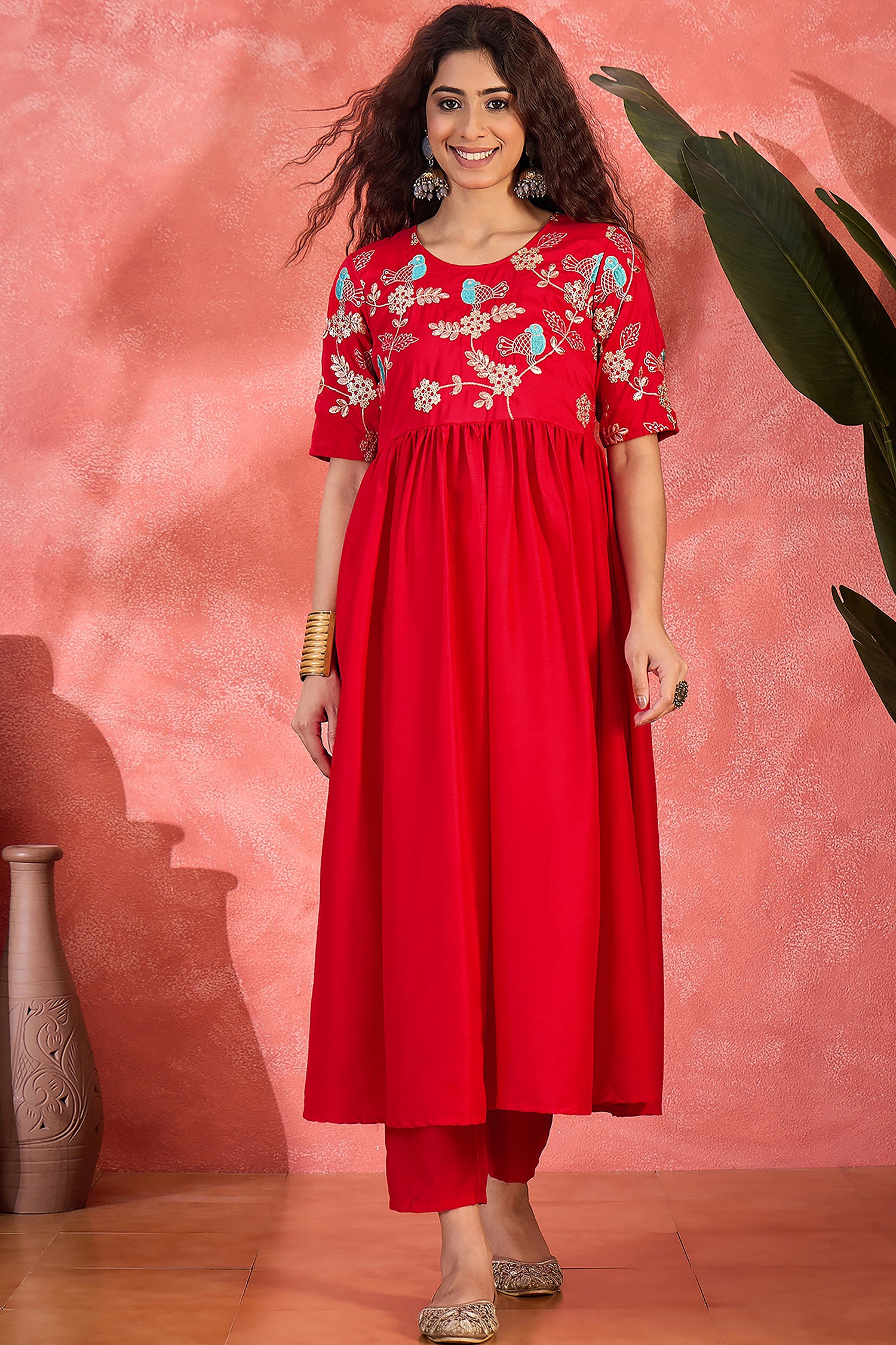 Refresh your wardrobe with this red colored Kurta Pant set with dupatta from Fashion Dream. This Kurta and pant set completes your look for your special occasions. Elevate your style with this exquisite red embroidered kurta set,made from lightweight and breathable cotton blend fabric, you'll stay cool and comfortable all day long. This elegant calf-length kurta features a round neck, half sleeves, gathered and embroidered work which creates a stunning look. It comes with matching pant bottom having partial elasticated waistband. This Kurta and Pant set comes along with solid dupatta which makes this more beautiful traditional wear for women. Whether you are dressing up for a special occasion or keeping it casual, this kurta pant set for women is a stylish choice. Add some minimal accessories to complete the look and make it truly unforgettable. "Note: The accessories and props used in these photoshoots are for aesthetic purposes only and may not be included in the final product or service