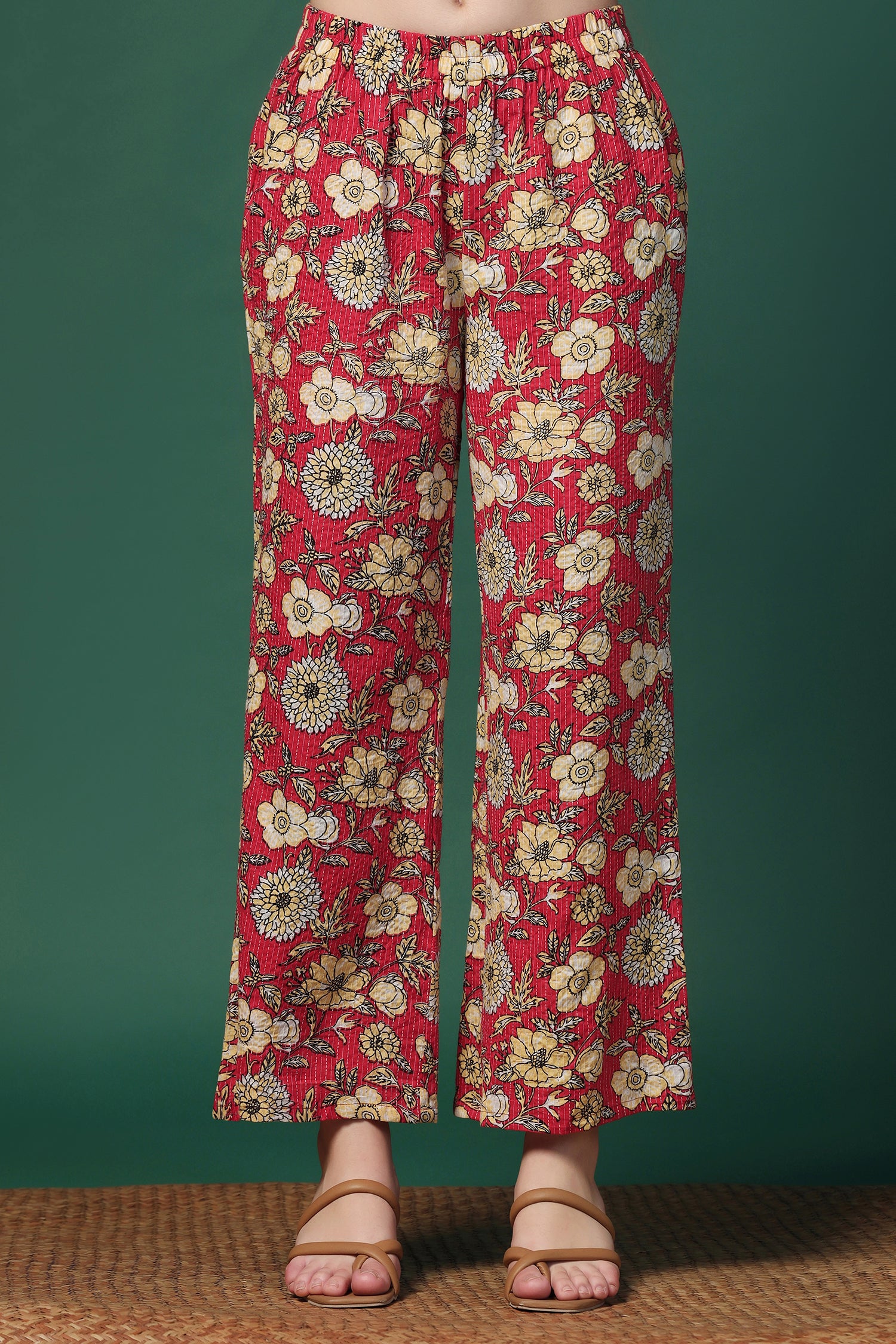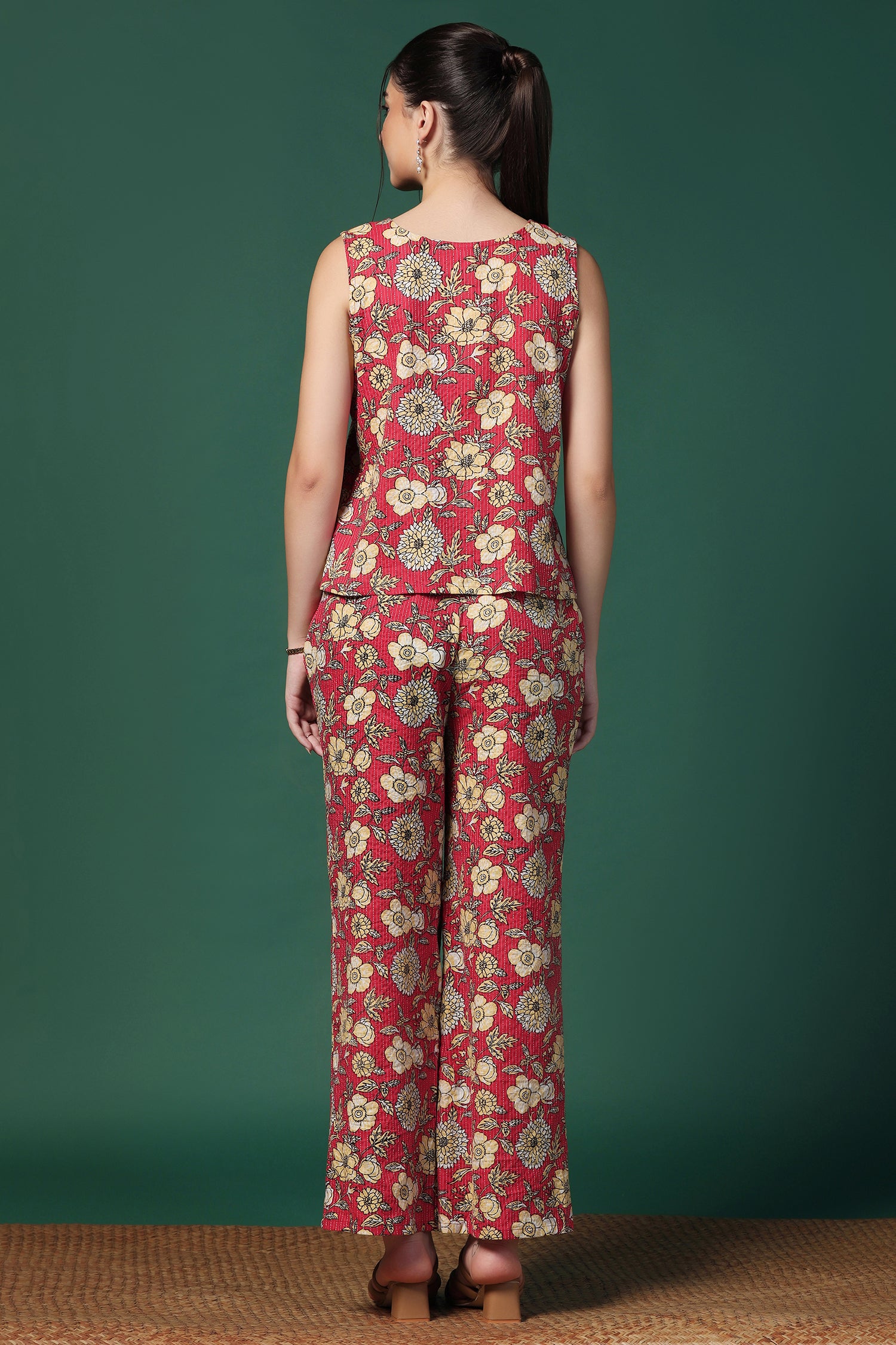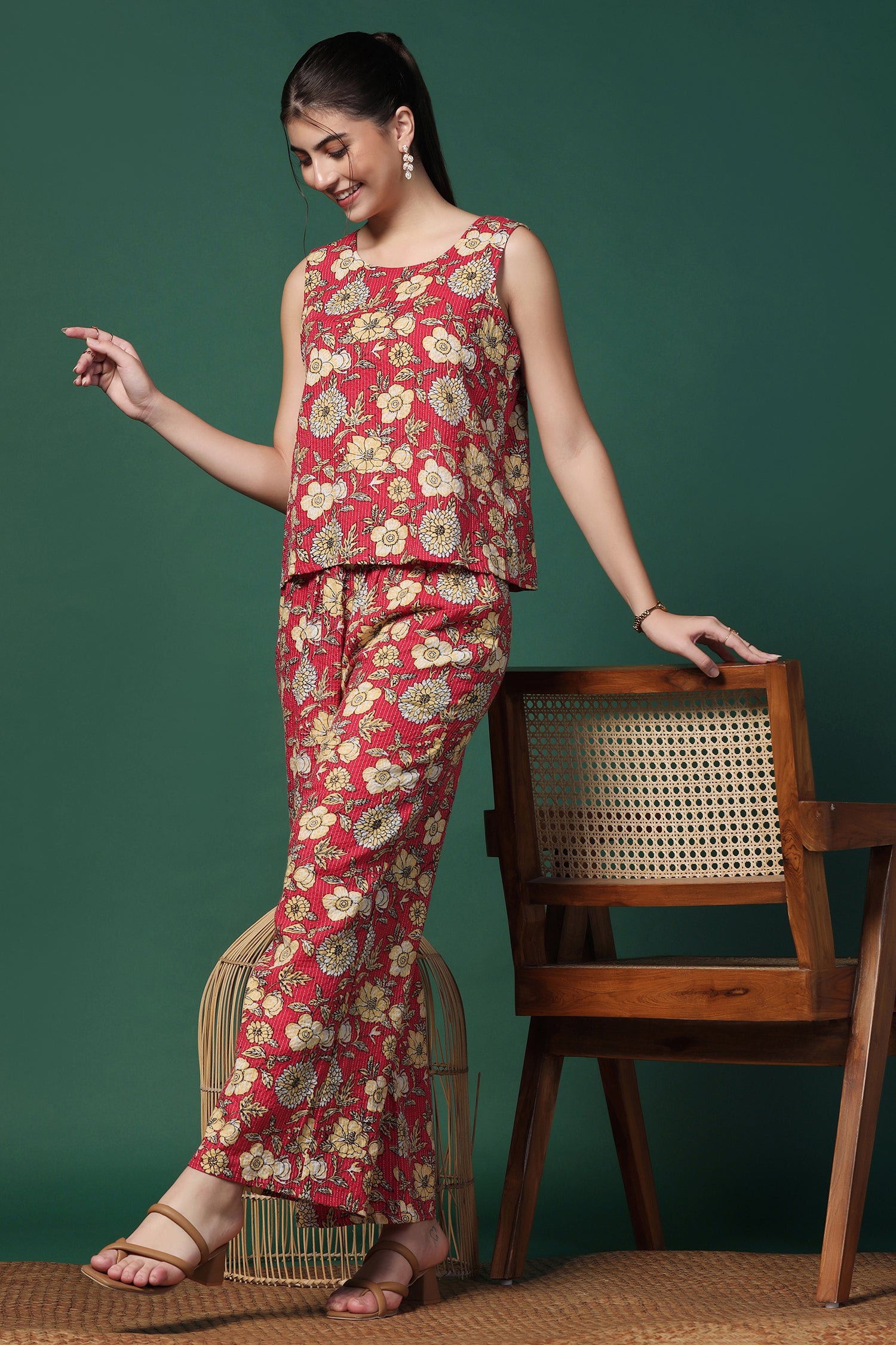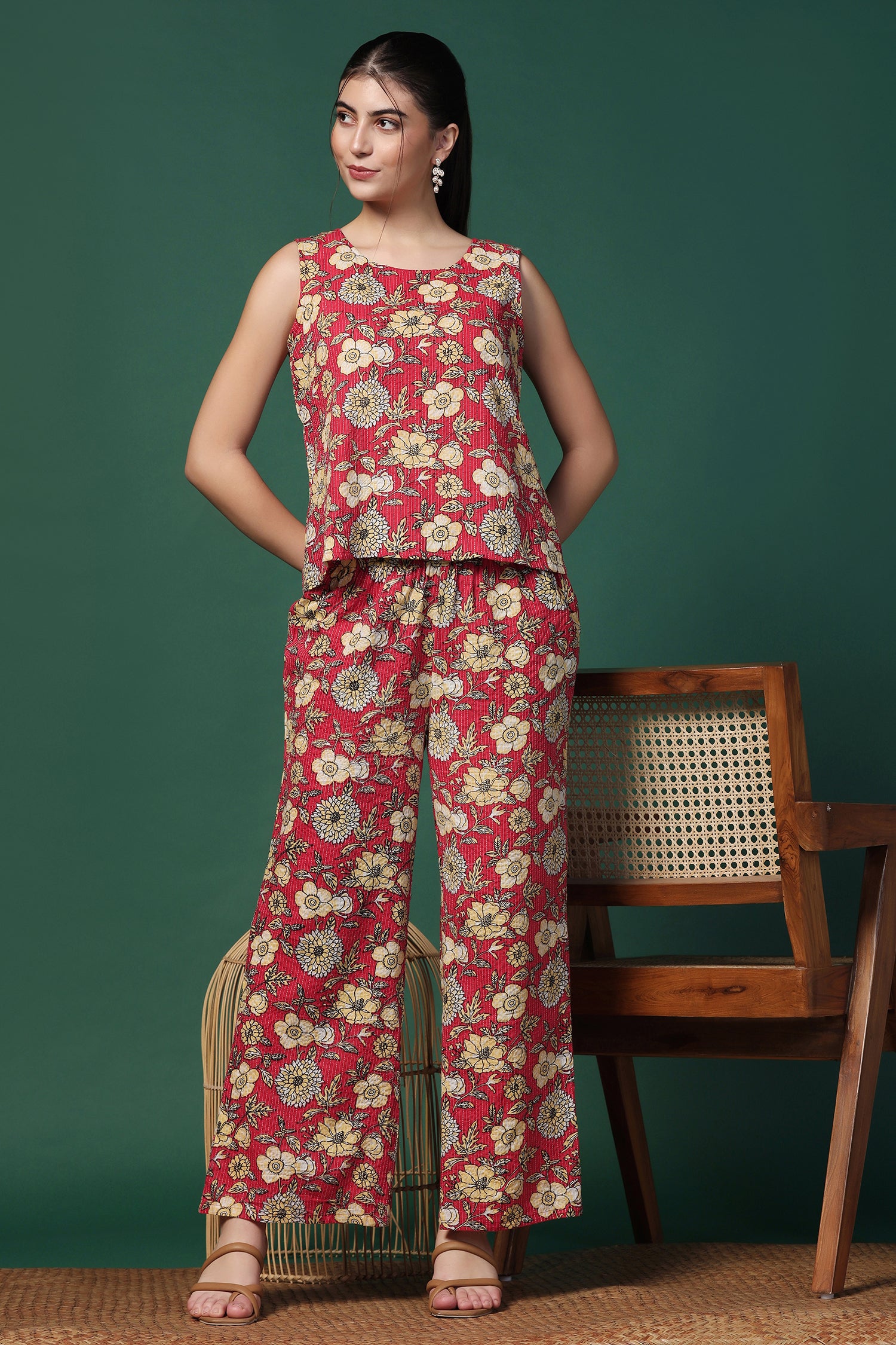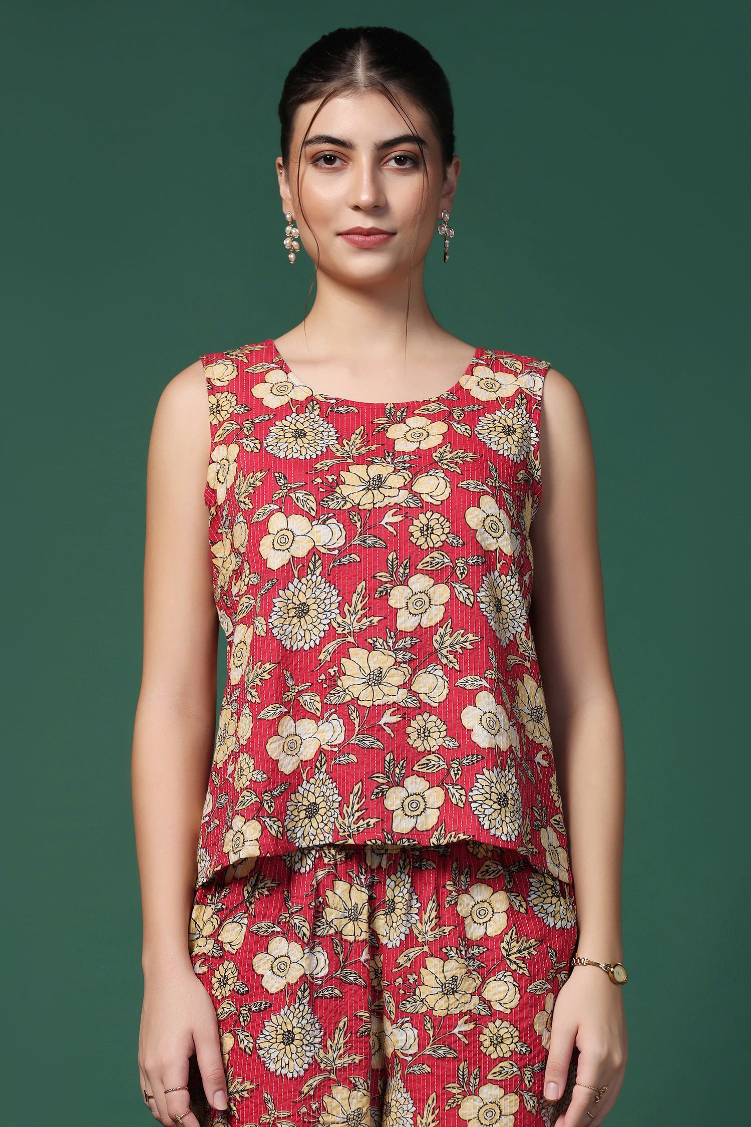 Stay stylish in this Women’s Cotton Top & Pant Co-Ord Set from fashion dream featuring a fresh Red printed design. The Sleeveless top with a smart Round Neck and matching pants offers a perfect blend of comfort and style, ideal for casual wear, office looks, and summer outings. "Note: The accessories and props used in these photoshoots are for aesthetic purposes only and may not be included in the final product or service”