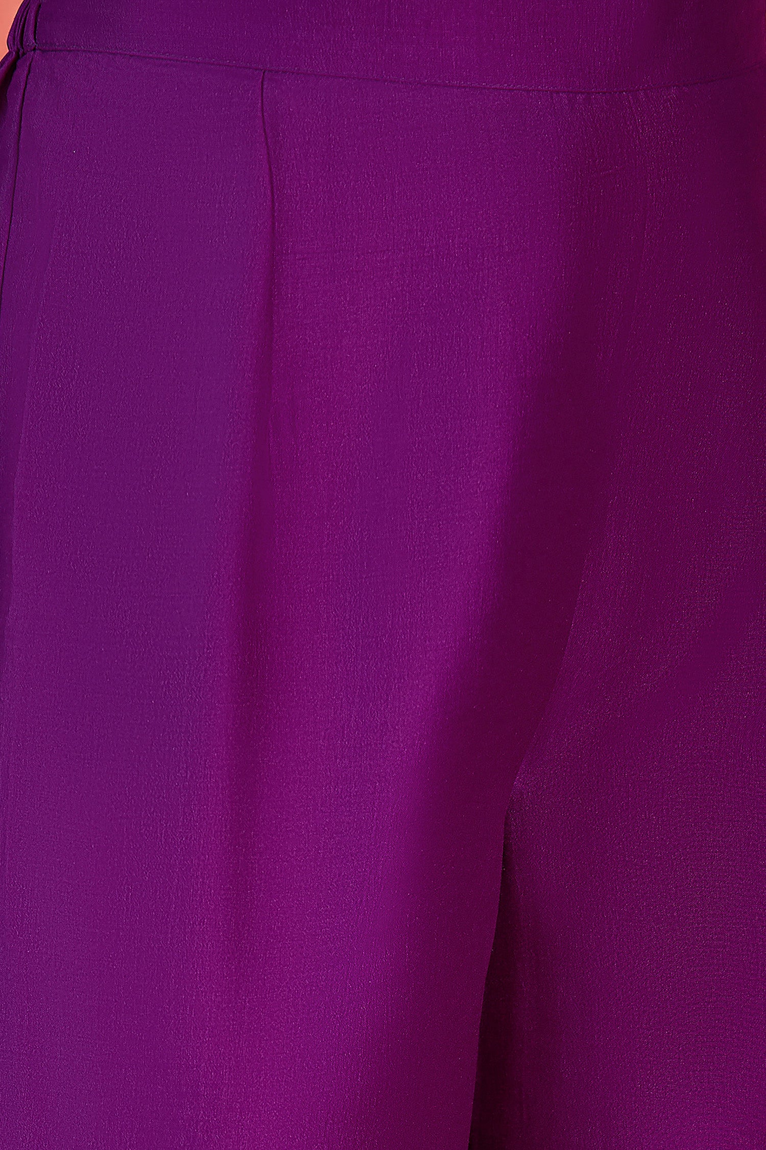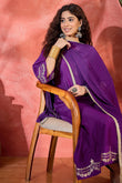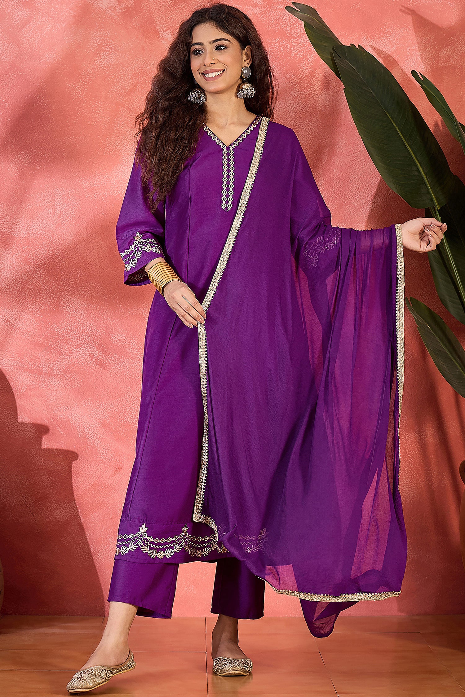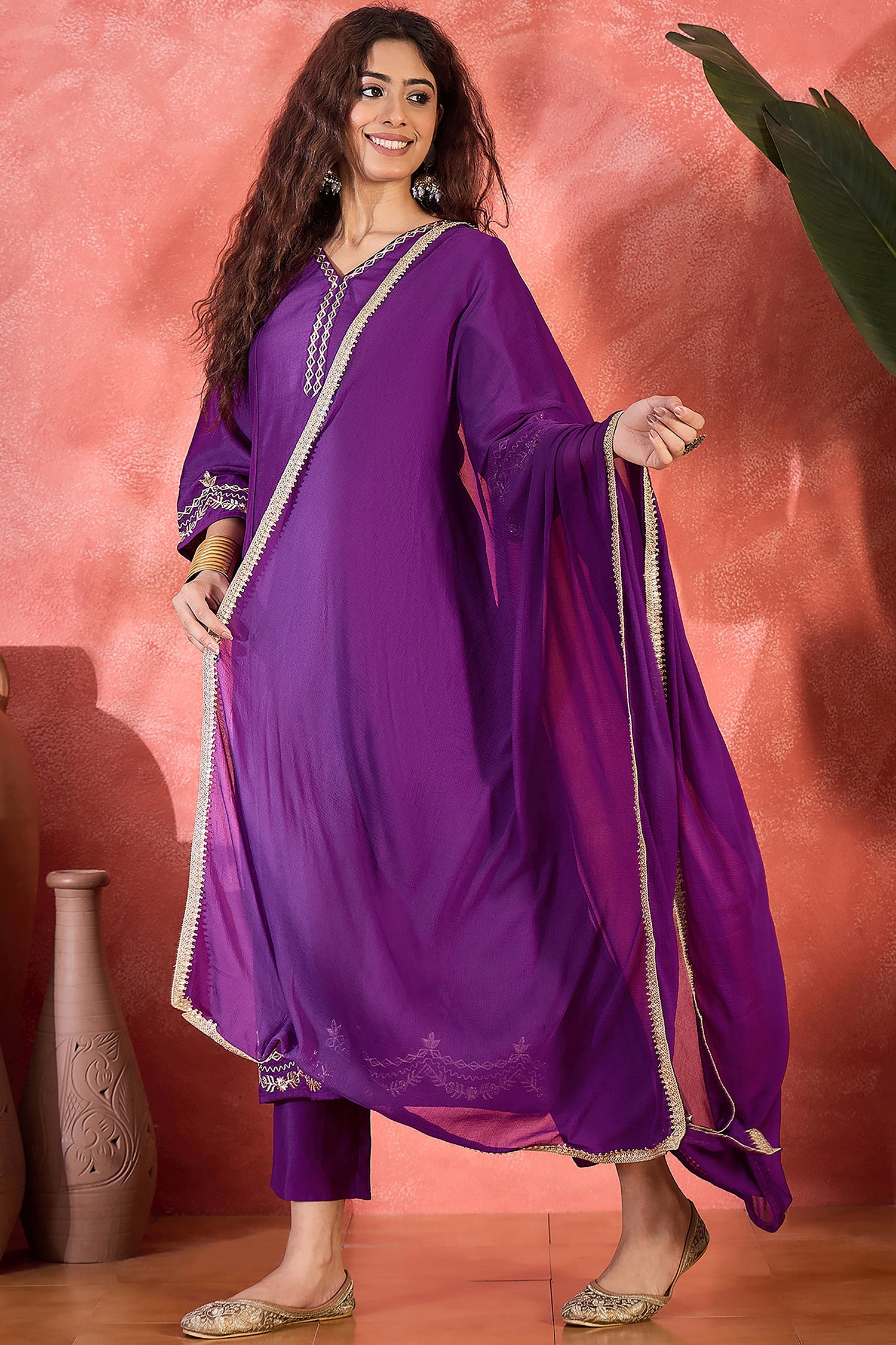 Refresh your wardrobe with this Violet coloured Kurta Pant set with dupatta from Fashion Dream. This Kurta and pant set with dupatta completes your look for your special occasions. Elevate your style with this kurta set, made from lightweight and breathable chinon silk fabric, you'll stay cool and comfortable all day long. This elegant A-line kurta features a V neck, ¾ sleeves and attractive embroidery details on the sleeves and hem line that create a stunning look. It comes with matching pant bottom having partial elasticated waistband. This Kurta and Pant set comes along with dupatta which makes this more beautiful traditional wear for women. Whether you are dressing up for a special occasion or keeping it casual, this kurta pant set for women is a stylish choice. Add some minimal accessories to complete the look and make it truly unforgettable. "Note: The accessories and props used in these photoshoots are for aesthetic purposes only and may not be included in the final product or service.