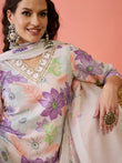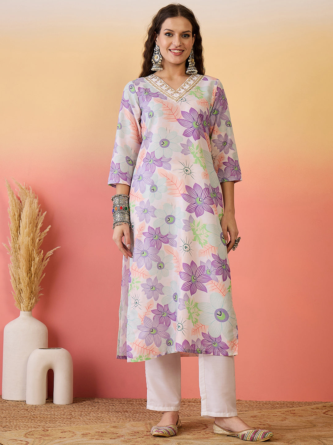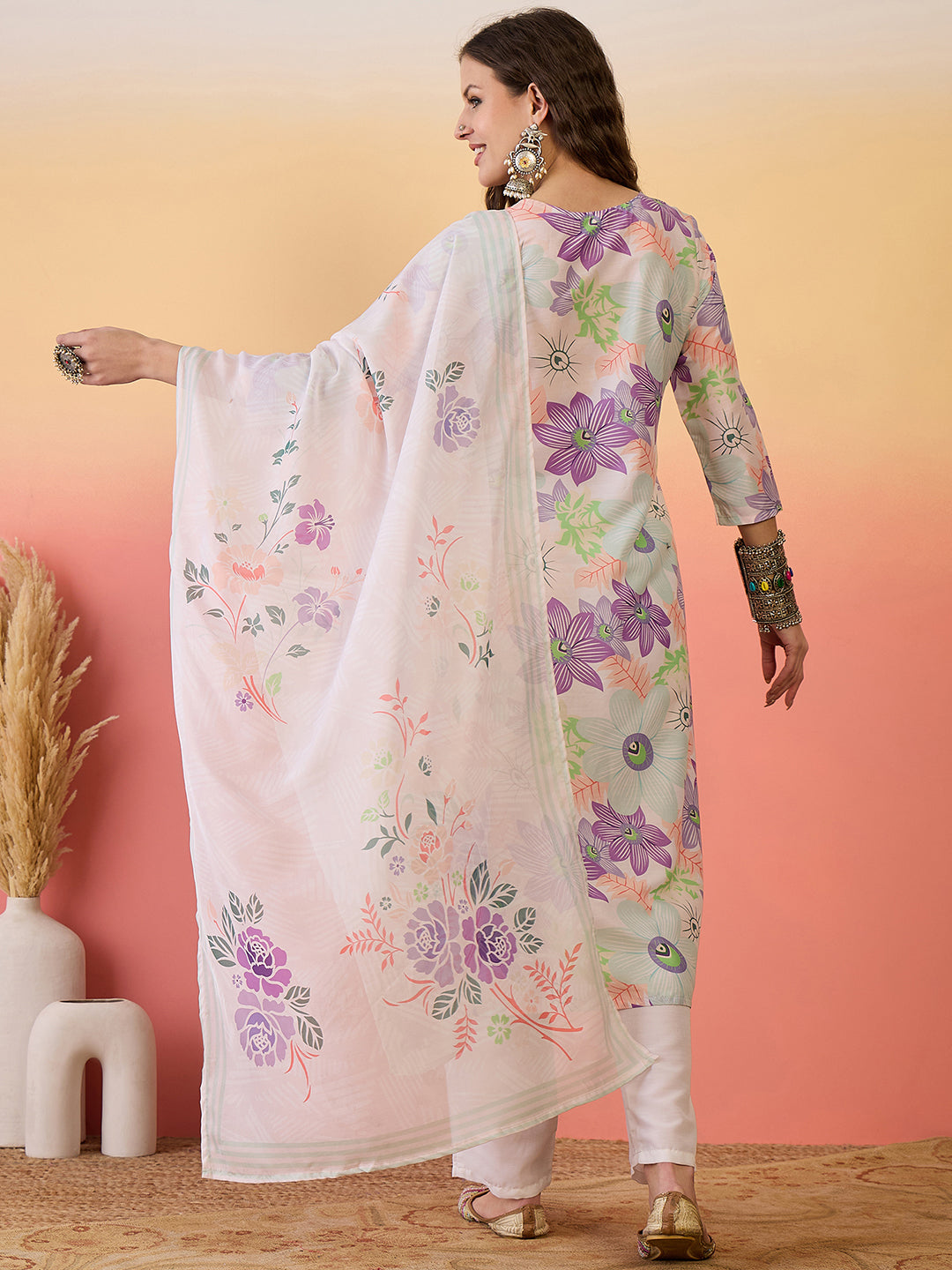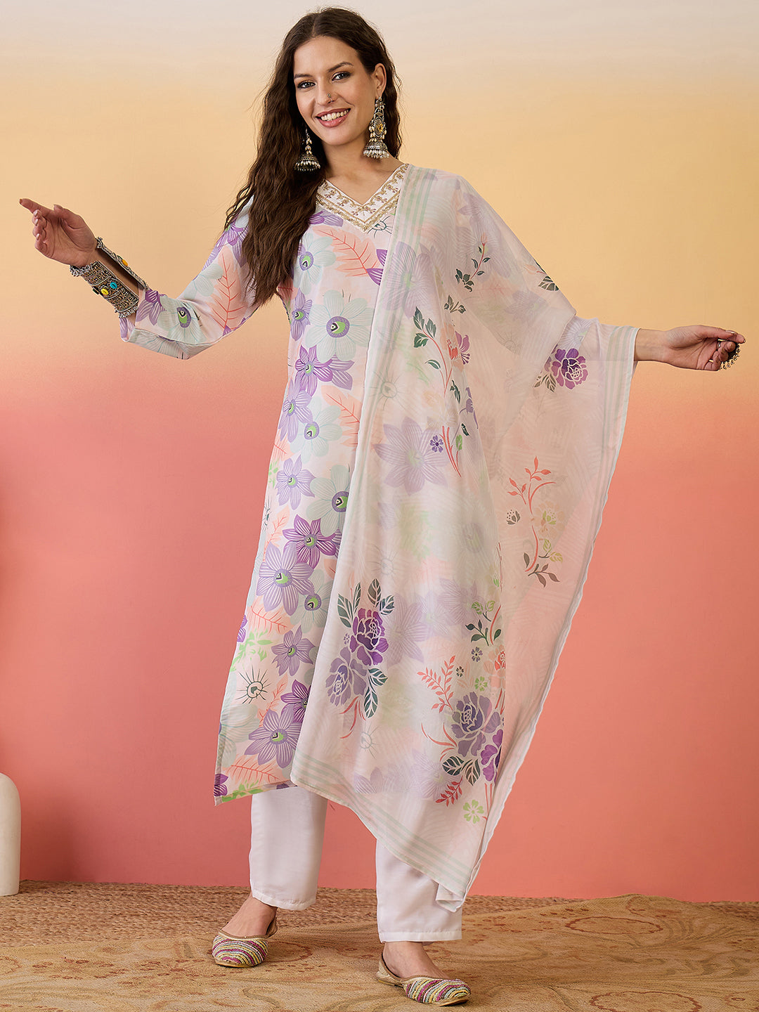 This straight salwar suit set with dupatta completes your look for your special occasions. Elevate your style with this exquisite white floral printed kurta set, made from lightweight and breathable cotton blend, you'll stay cool and comfortable all day long. The elegant calf-length kurta features a v-neckline, regular 3/4th sleeves and intricate lace on the yoke, creating a stunning look. Pair it with solid White pant and a floral printed dupatta for a chic and effortless ensemble. Perfect for a special occasion or a casual day out, this straight-cut kurta set is sure to turn heads. Add some minimal accessories to complete the look and make it truly unforgettable.