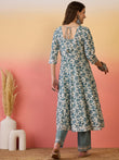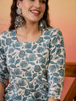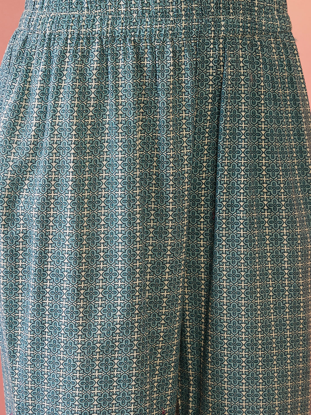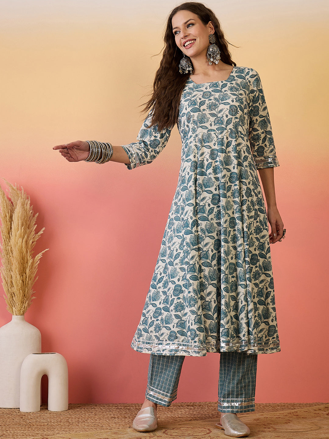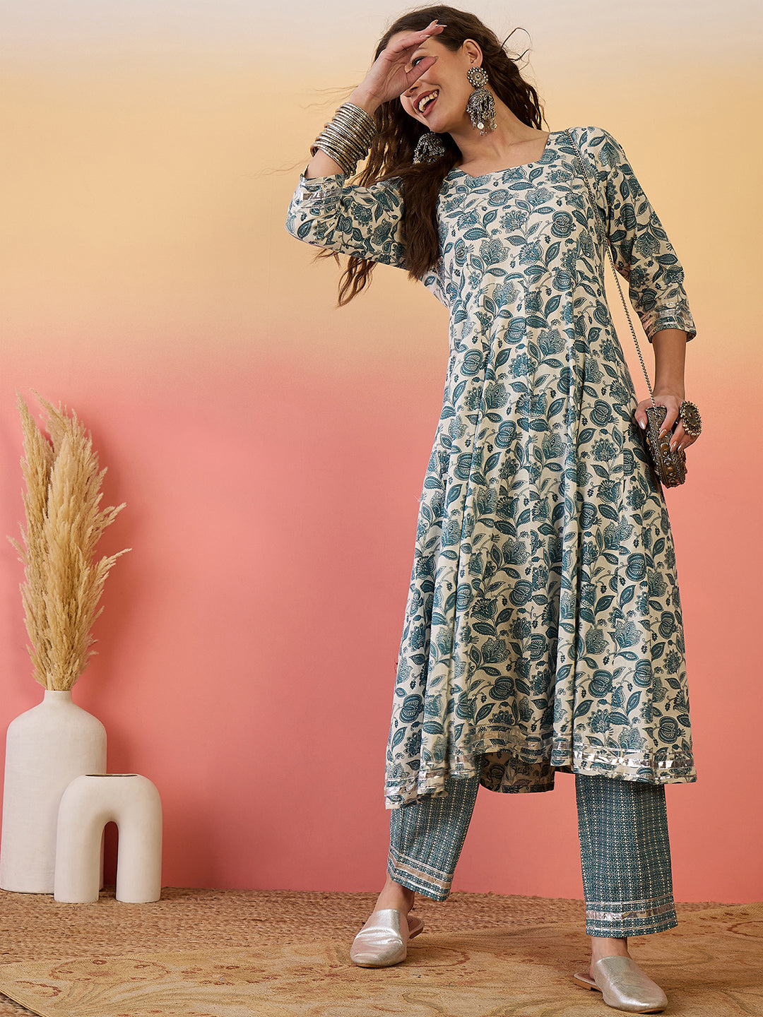 This kurta pant set completes your look for your special occasions and celebrations. An easy summer look with this women's floral printed kurta set. The breathable and light weight cotton fabric ensures that you will stay cool and comfortable even on the hottest of days. This women kurta features square neck with drawstring closure, regular 3/4th sleeves, printed patterned, lace detailing and flare hemline. This Kurta comes with printed pant bottom having elasticated waistband. Whether you are dressing up for a special occasion or keeping it casual, this anarkali kurta pant set for women is a stylish choice. Add minimal accessories to make the all over printed print shine. "Note: The accessories and props used in these photoshoots are for aesthetic purposes only and may not be included in the final product or service."