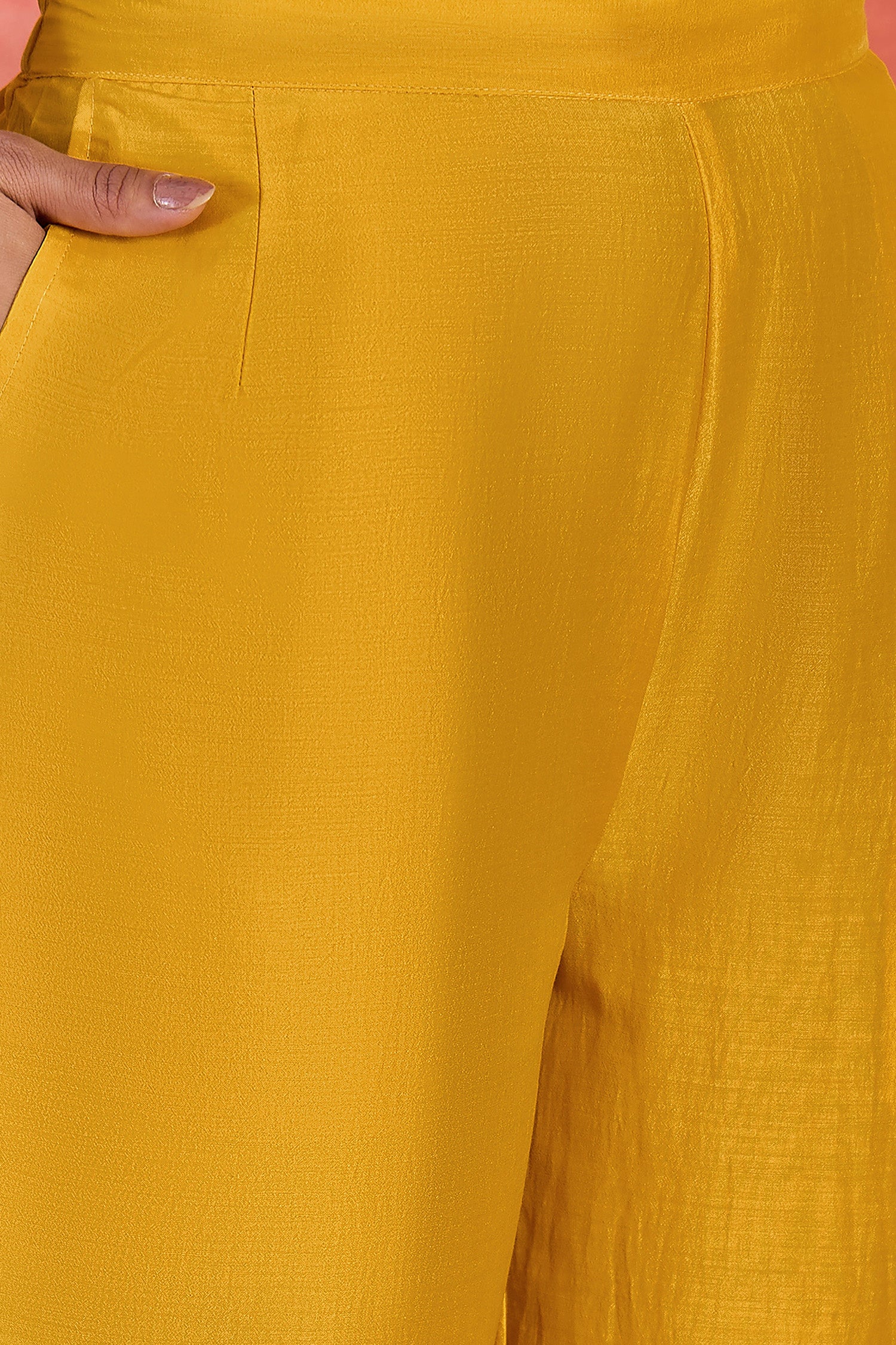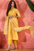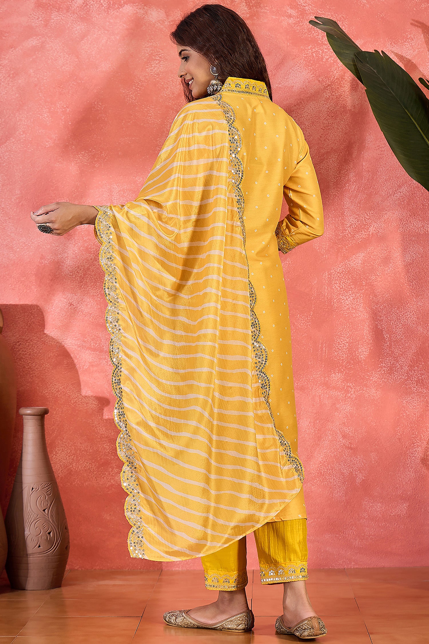 Refresh your wardrobe with this Yellow colored kurta pant set with dupatta from Fashion dream. This set completes your look for your special moments. Elevate your style with this beautiful bandhani printed kurta set, made from lightweight and breathable chinon silk fabric, you'll stay cool and comfortable all day long. This elegant kurta features a V-neck, 3/4th sleeves with lace detailing, intricated embroidered at neckline and hemline which creates a stunning look. It comes with matching pant bottom having partial elasticated waistband and lace detailing at hemline. This kurta and pant set comes along with leheriya printed dupatta with lace detailing which makes this more beautiful traditional wear for women. Whether you are dressing up for a special occasion or keeping it casual, this kurta pant set is a stylish choice. Add some minimal accessories to complete the look and make it truly unforgettable! "Note: The accessories and props used in these photoshoots are for aesthetic purposes only and may not be included in the final product or service”